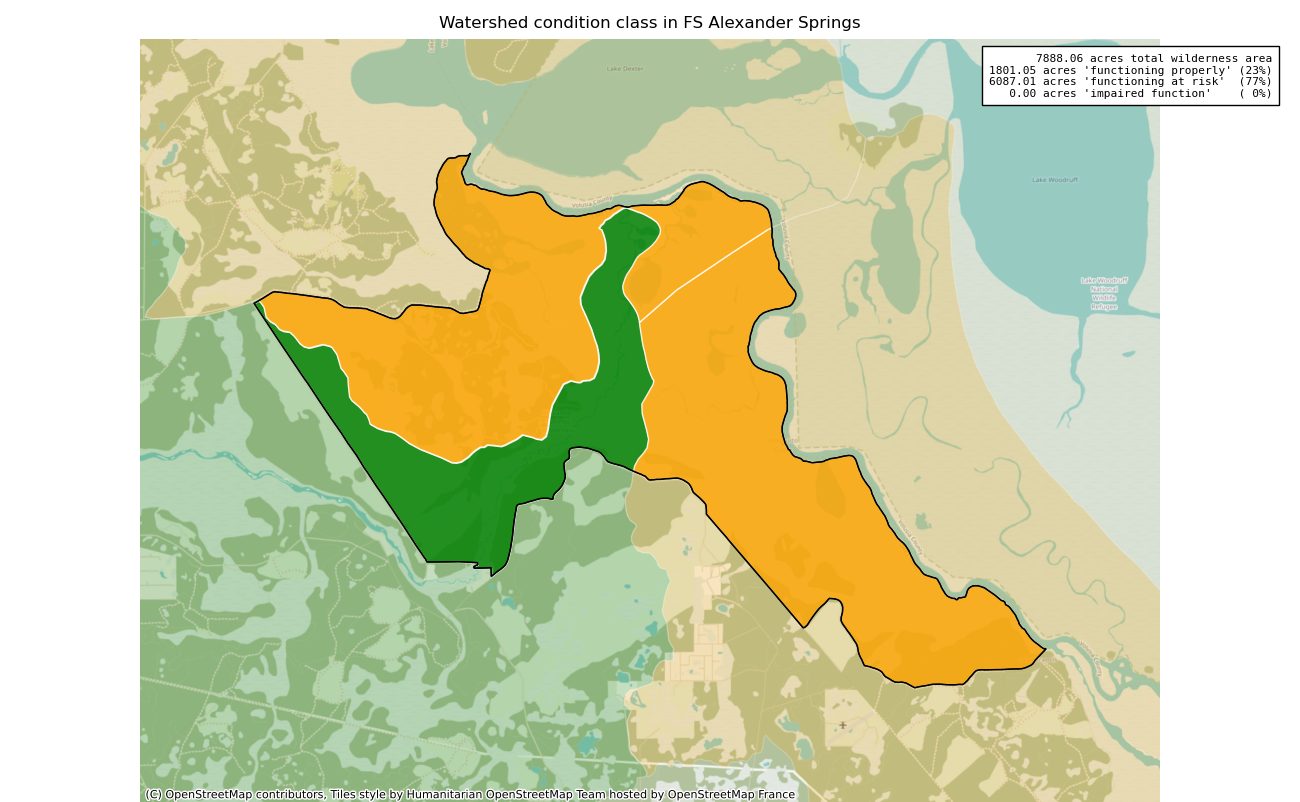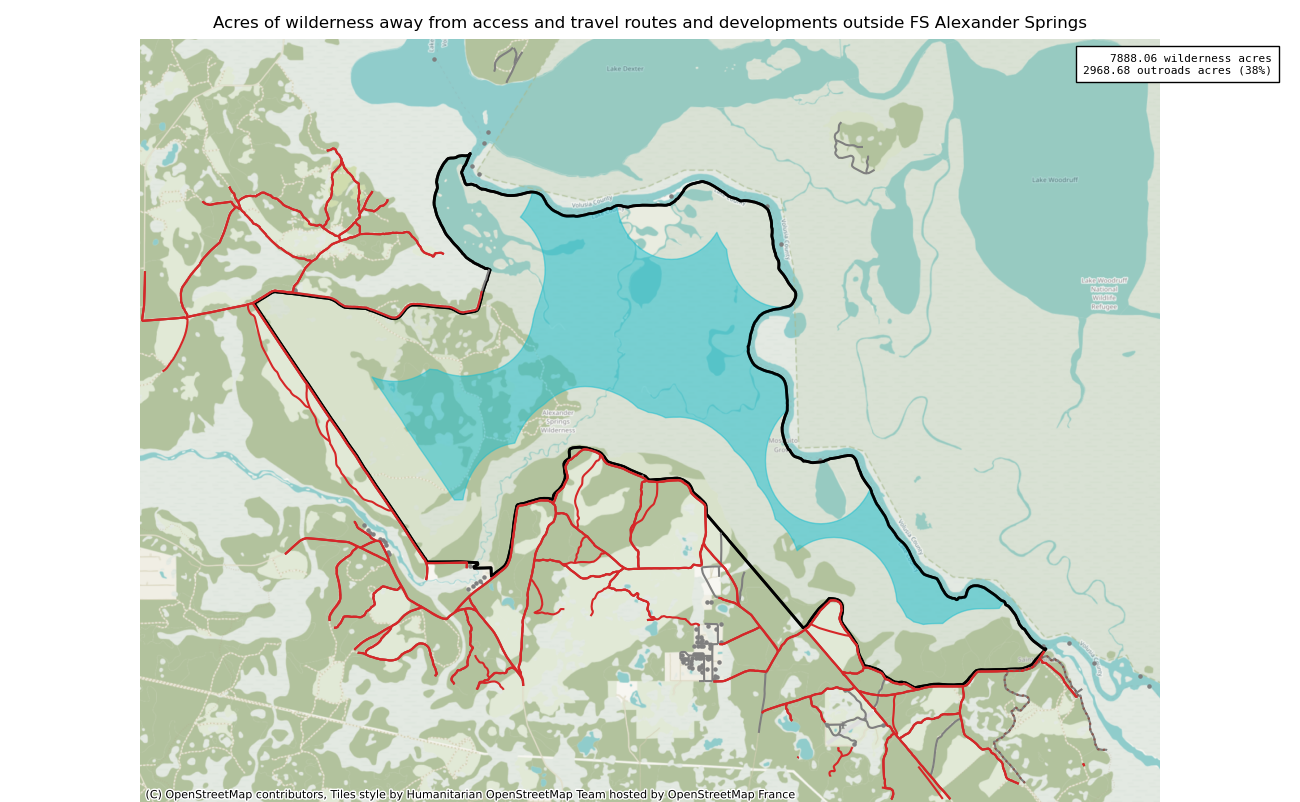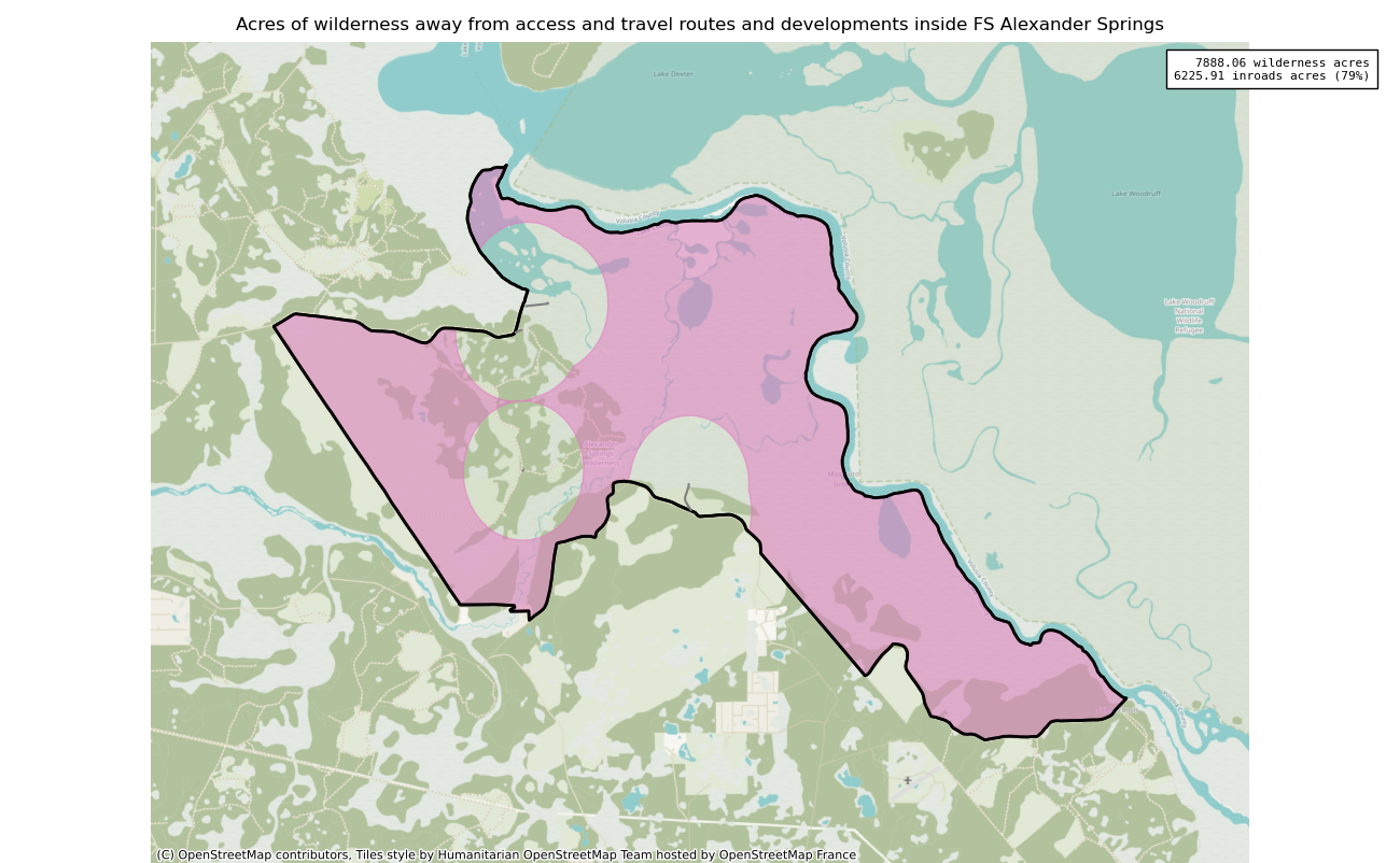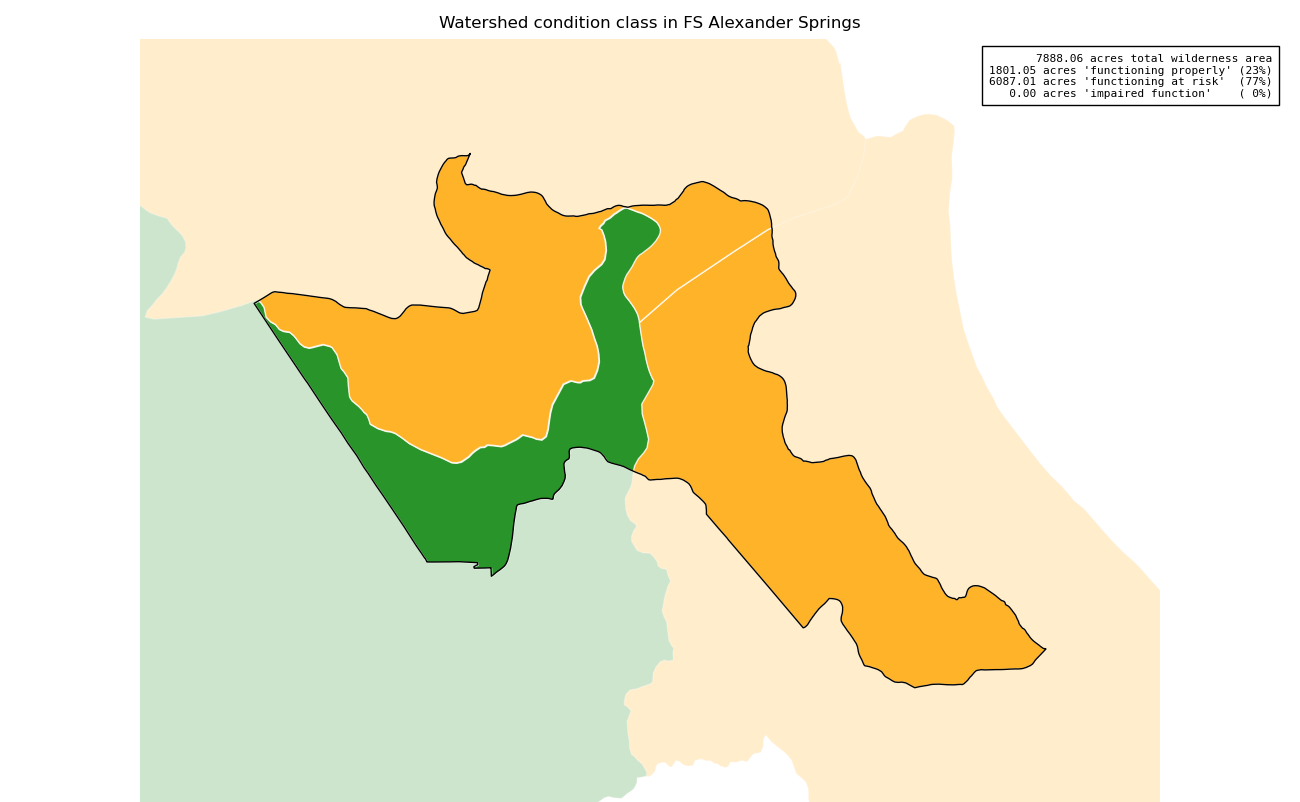 The 7888 acre Alexander Springs was designated as a National Wilderness on or around 1984-01-01, and Wilderness Character Monitoring baseline work was done in 2024. The maps in this section are made with USFS data, with terrain maps from the internet.