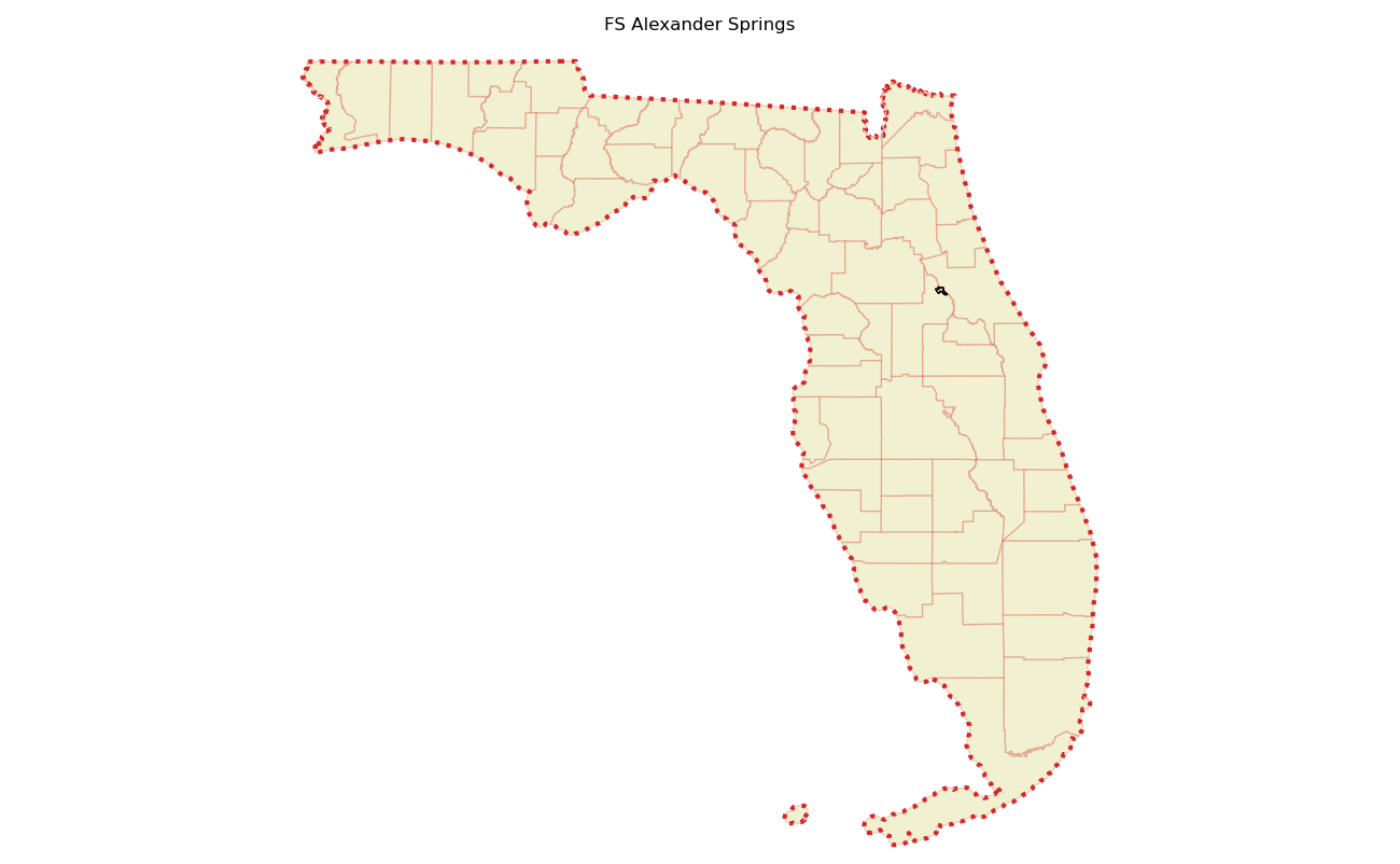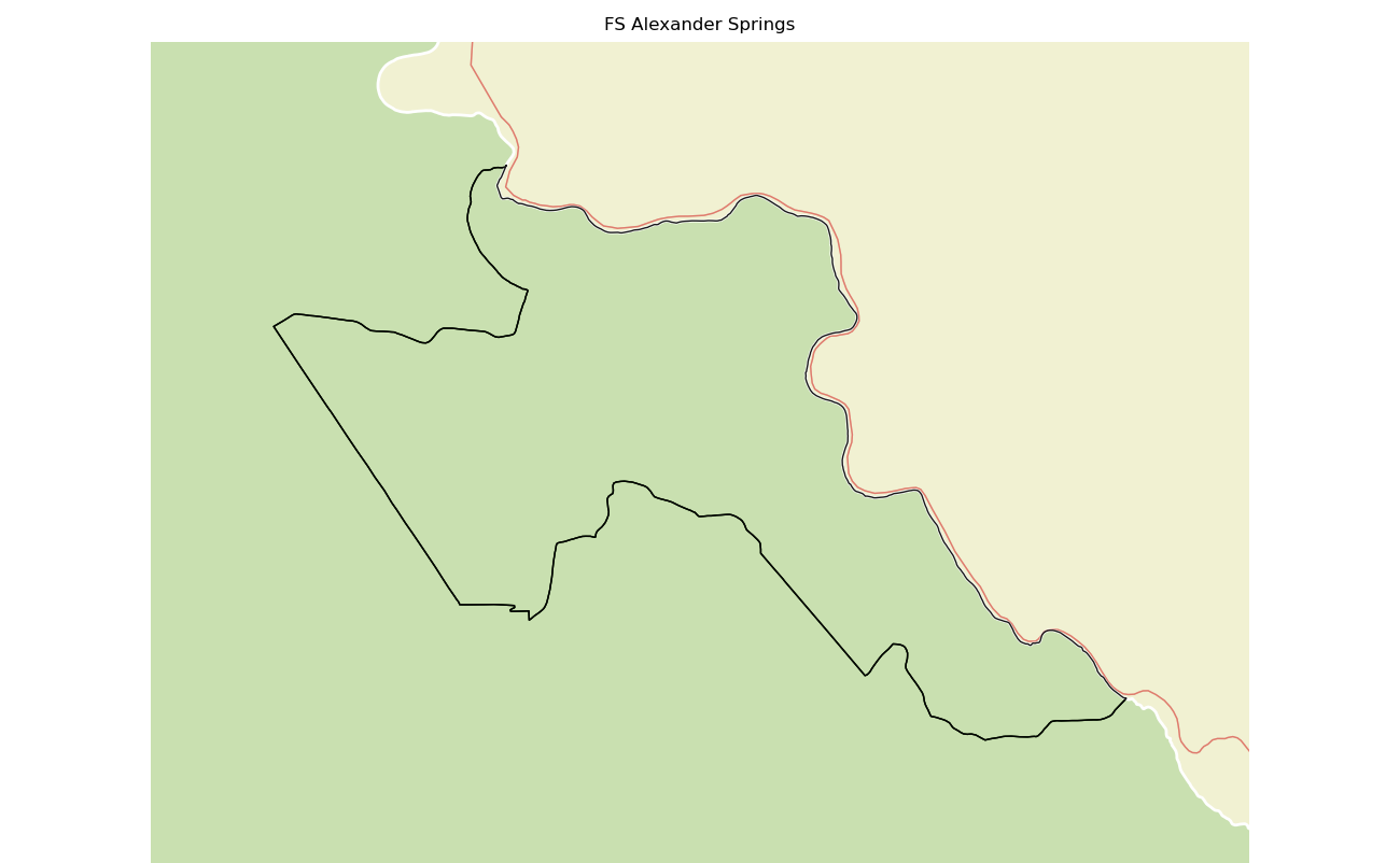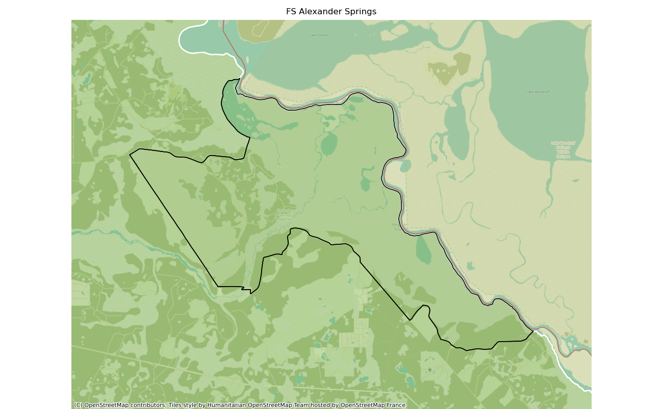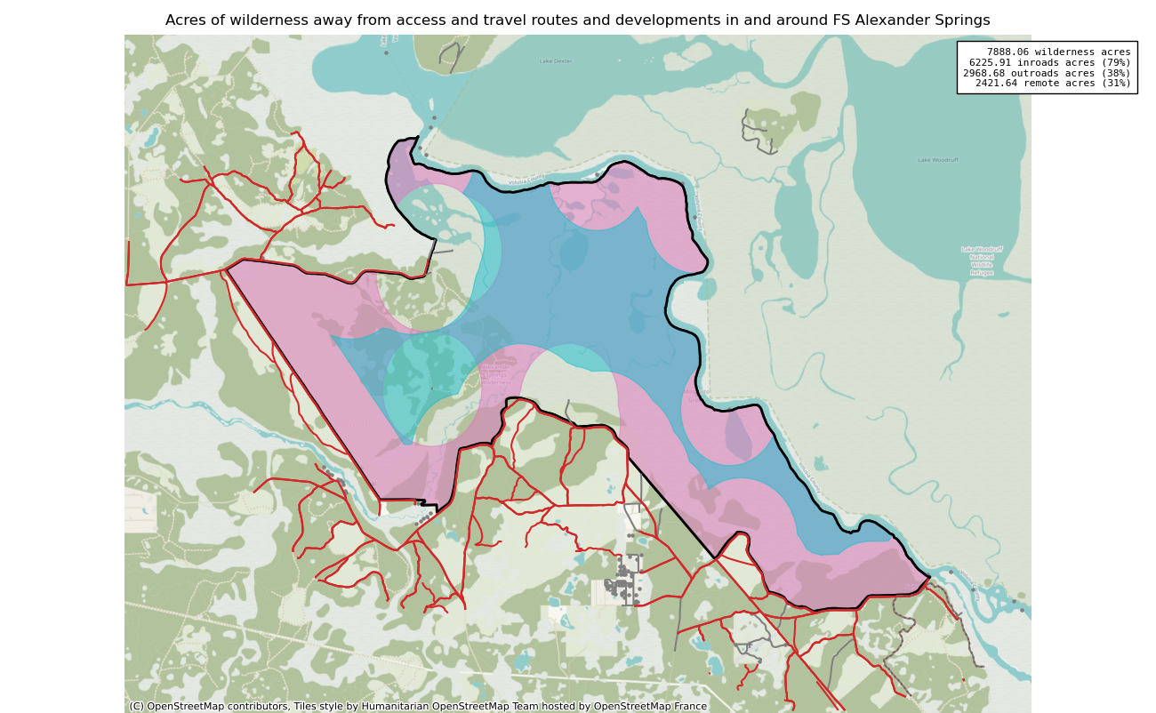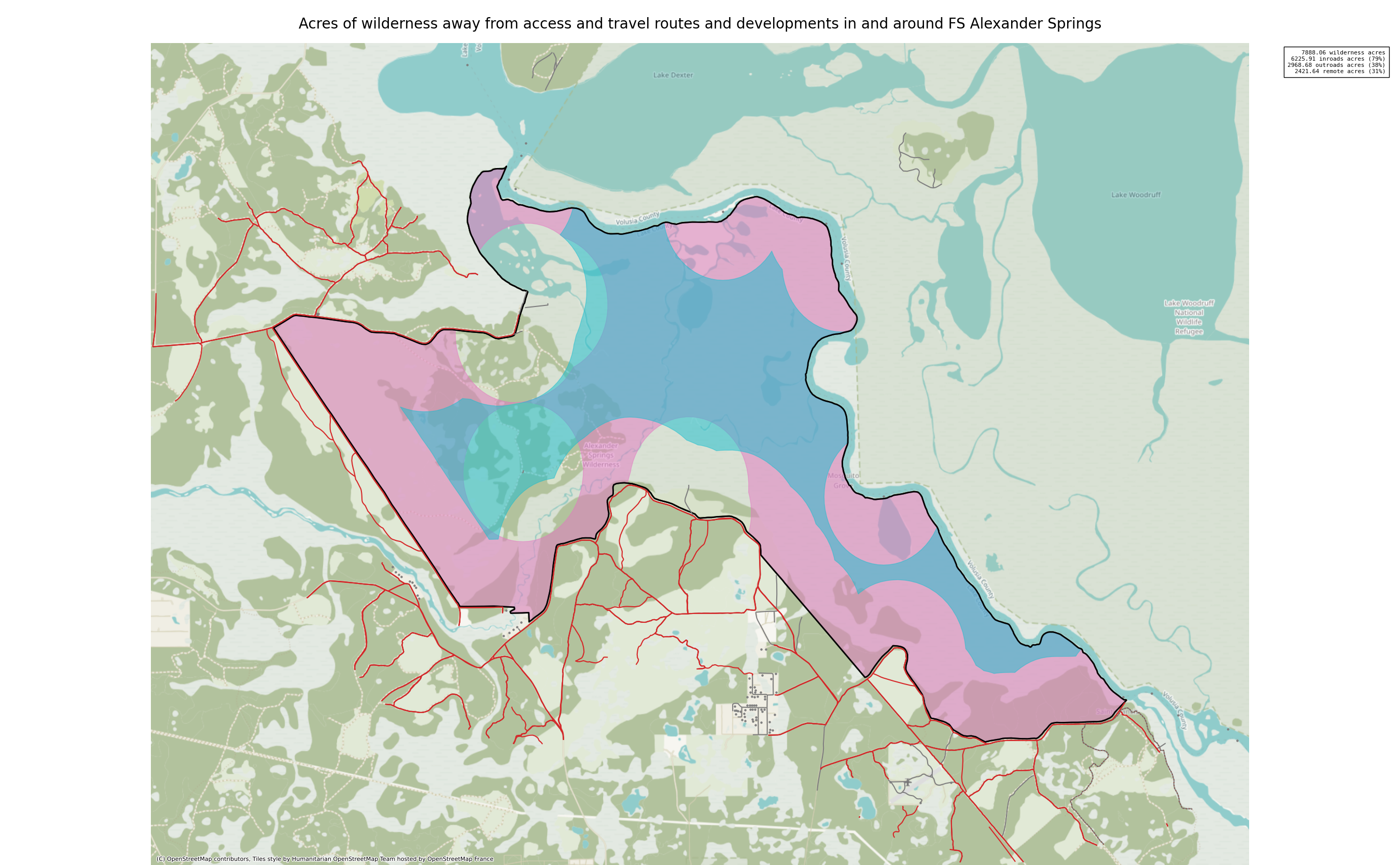 The 7888 acre Alexander Springs was designated as a National Wilderness on or around 1984-01-01, and Wilderness Character Monitoring baseline work was done in 2024. The maps in this section are made with USFS data, with terrain maps from the internet.