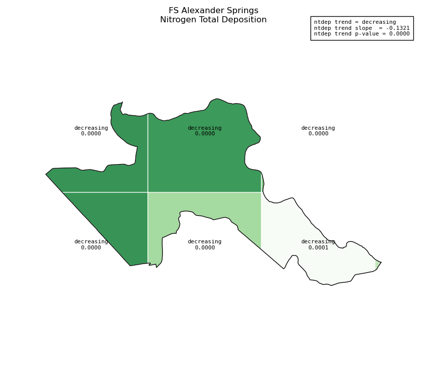 Annual averages for nitrogen total deposition are calculated by clipping the gridded ntdep data to the wilderness boundary, multiplying the total deposition value for each grid cell by its area inside the wilderness, summing ntdep for all cells, then dividing that sum by the total area of the wilderness. These annual averages are then used to determine nitrogen deposition trend inside the wilderness. Decreasing nitrogen deposition indicates an improvement in wilderness character.