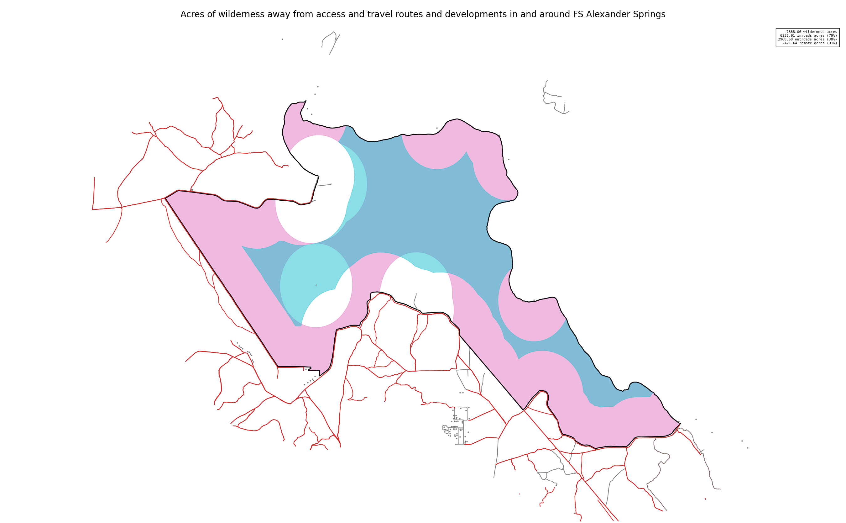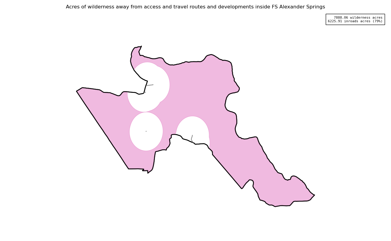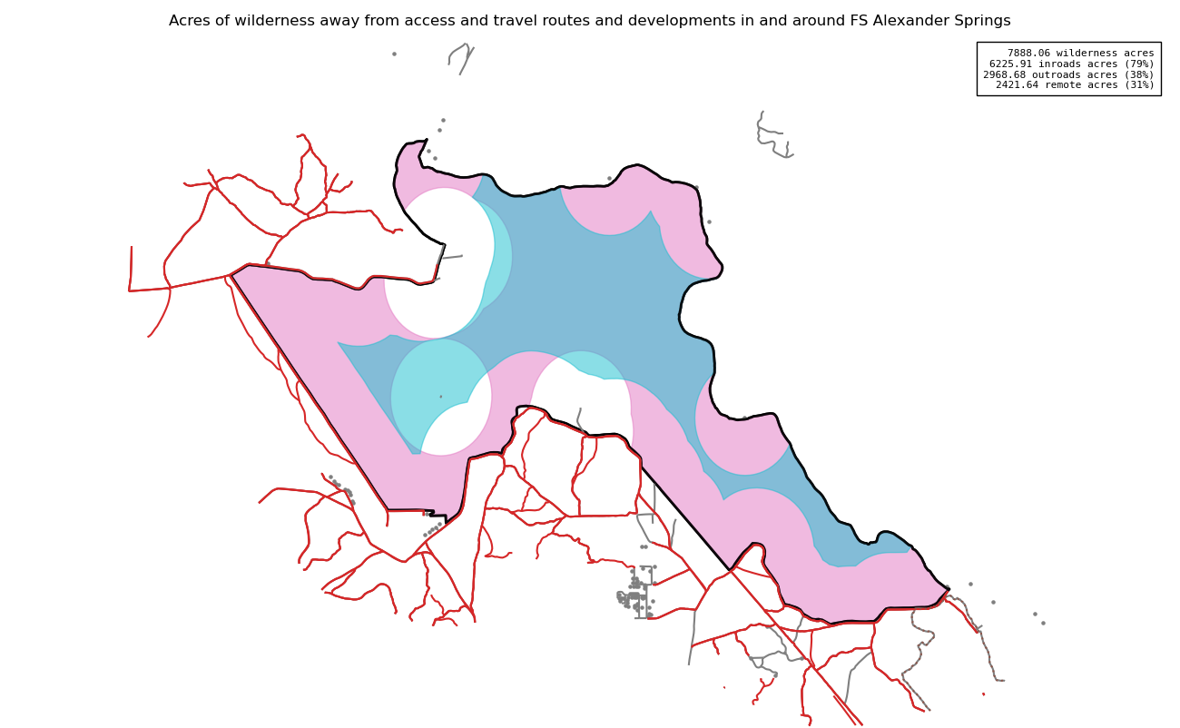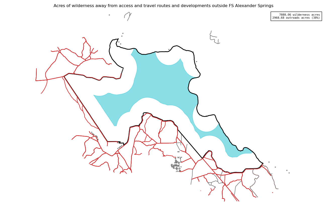 Note that roads and developments located exactly on the wilderness boundary are included in this measure. Spatial data resolution and accuracy can vary greatly across sources, and determining the intersection of a road represented by a single infinitely thin line can produce incorrect results. These should always be verified locally and corrected.