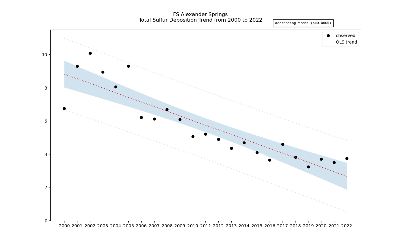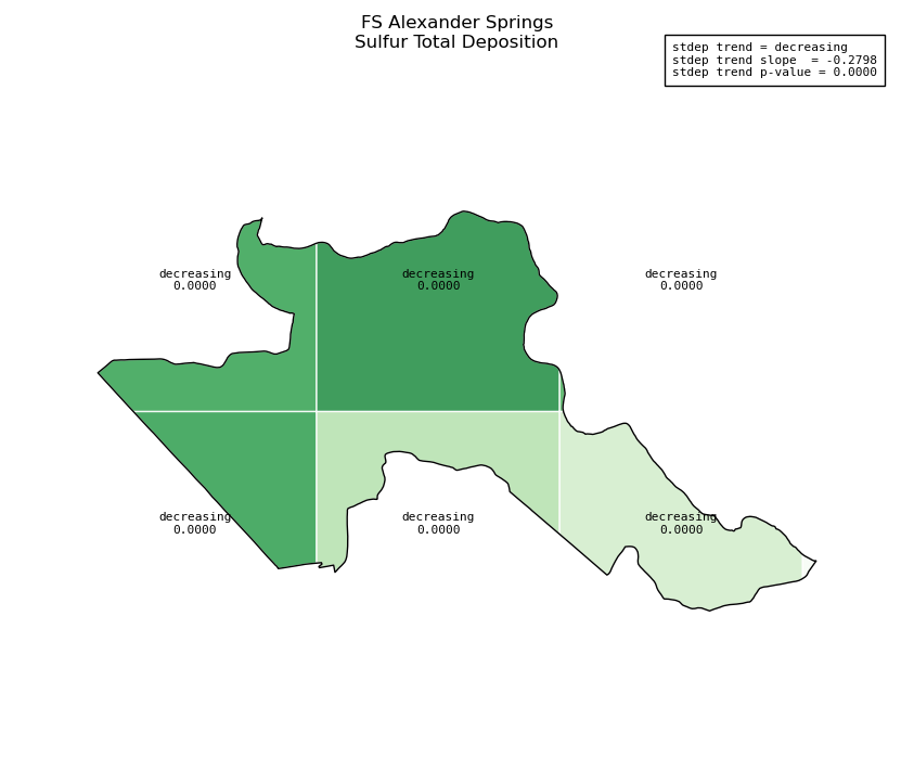Annual averages for sulfur total deposition are calculated by clipping the gridded stdep data to the wilderness boundary, multiplying the total deposition value for each grid cell by its area inside the wilderness, summing stdep for all cells, then dividing that sum by the total area of the wilderness. These annual averages are then used to determine sulfur deposition trend inside the wilderness. Decreasing sulfur deposition indicates an improvement in wilderness character.