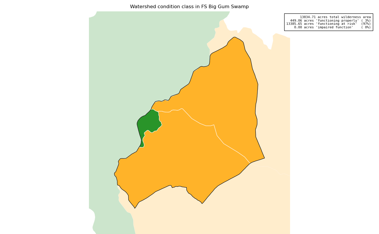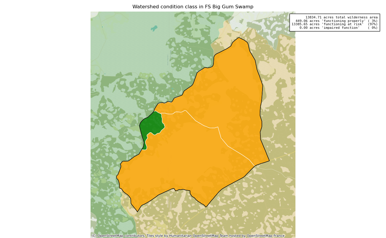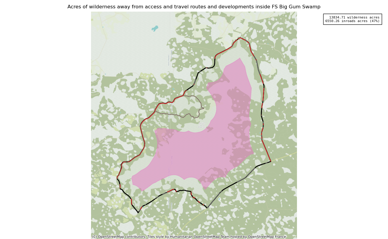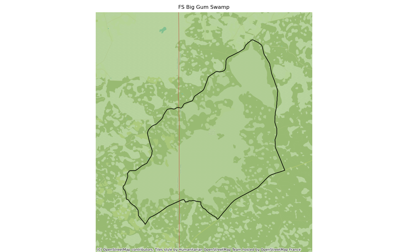 The 13835 acre Big Gum Swamp was designated as a National Wilderness on or around 1984-01-01, and Wilderness Character Monitoring baseline work was done in 2024. The maps in this section are made with USFS data, with terrain maps from the internet.