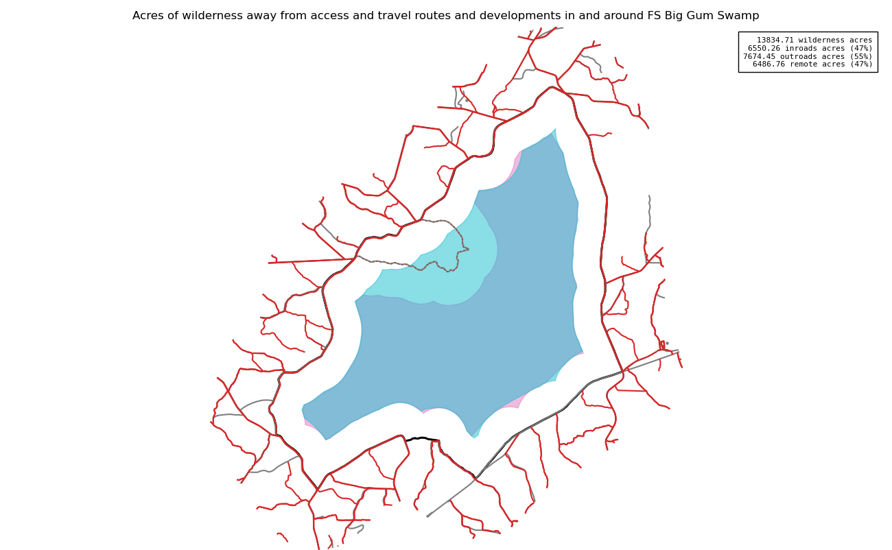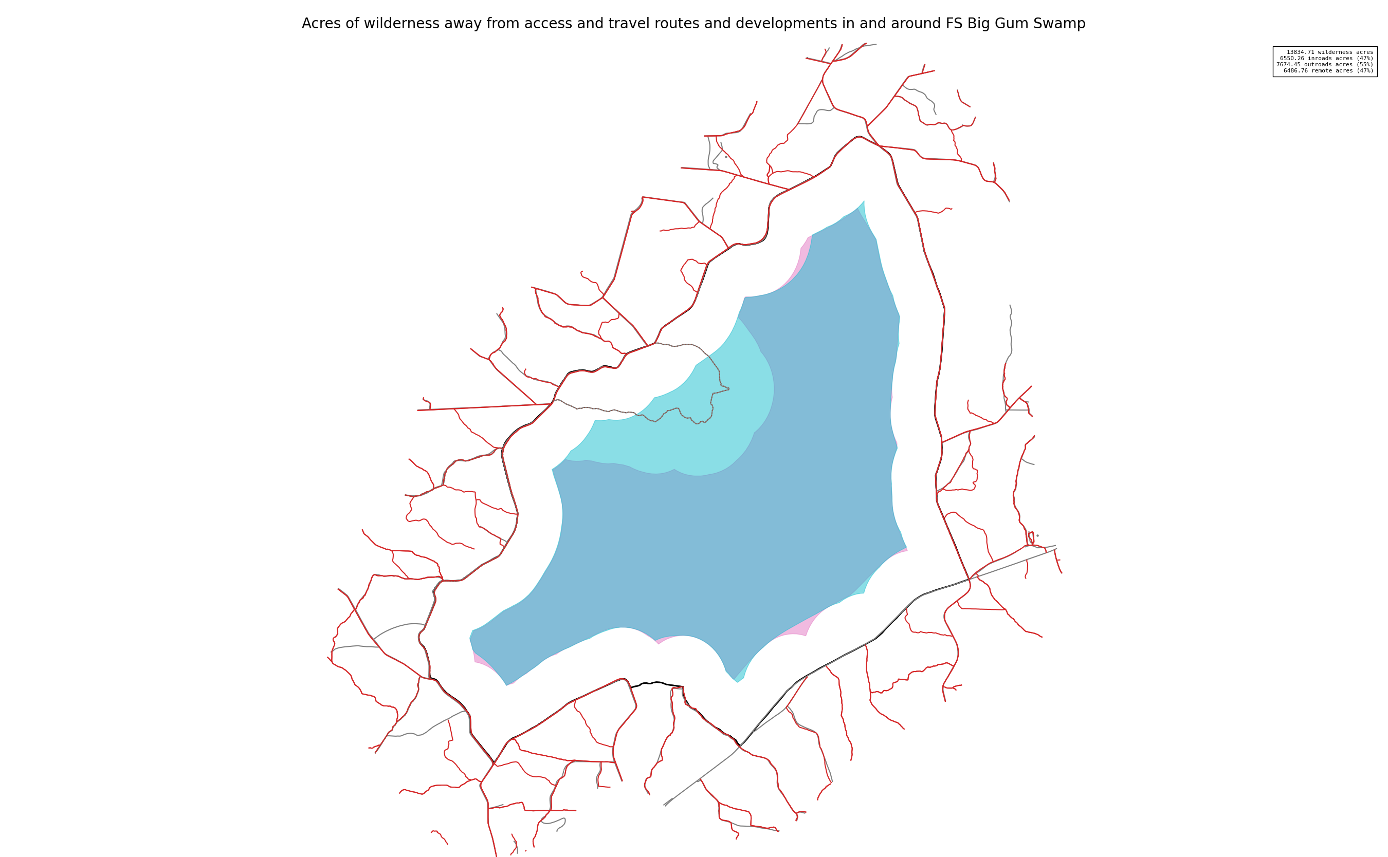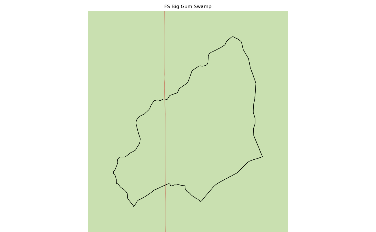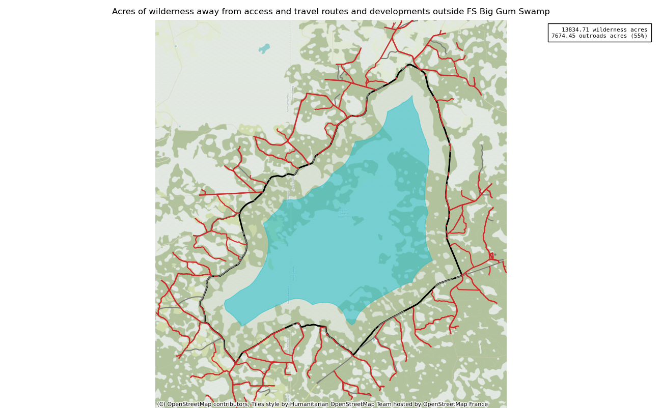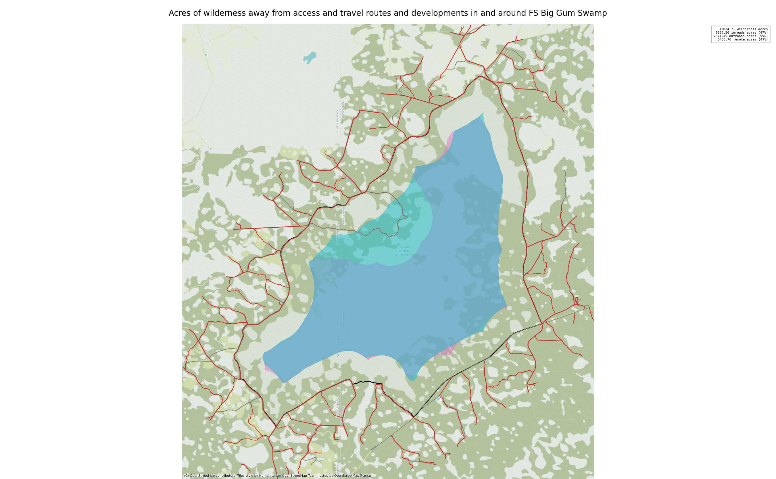 The 13835 acre Big Gum Swamp was designated as a National Wilderness on or around 1984-01-01, and Wilderness Character Monitoring baseline work was done in 2024. The maps in this section are made with USFS data, with terrain maps from the internet.