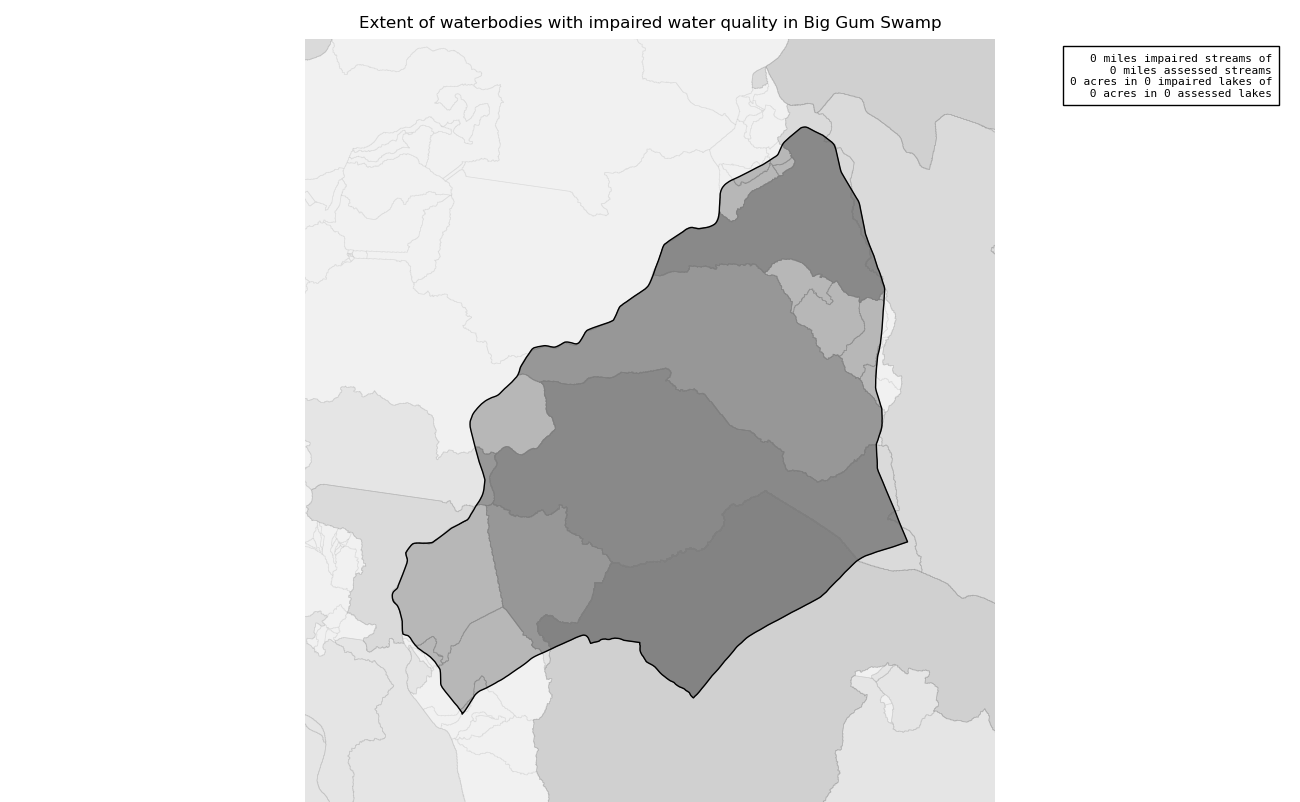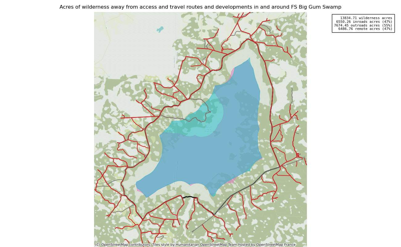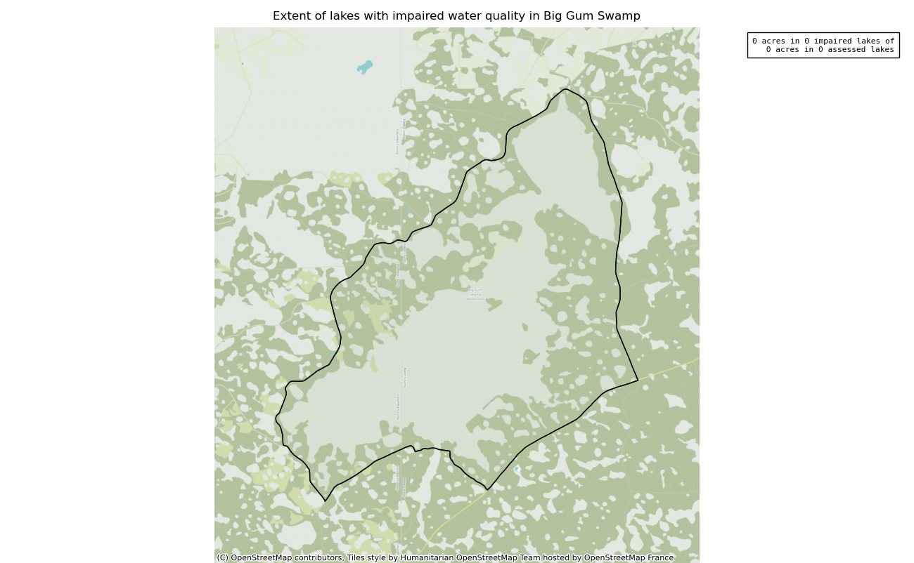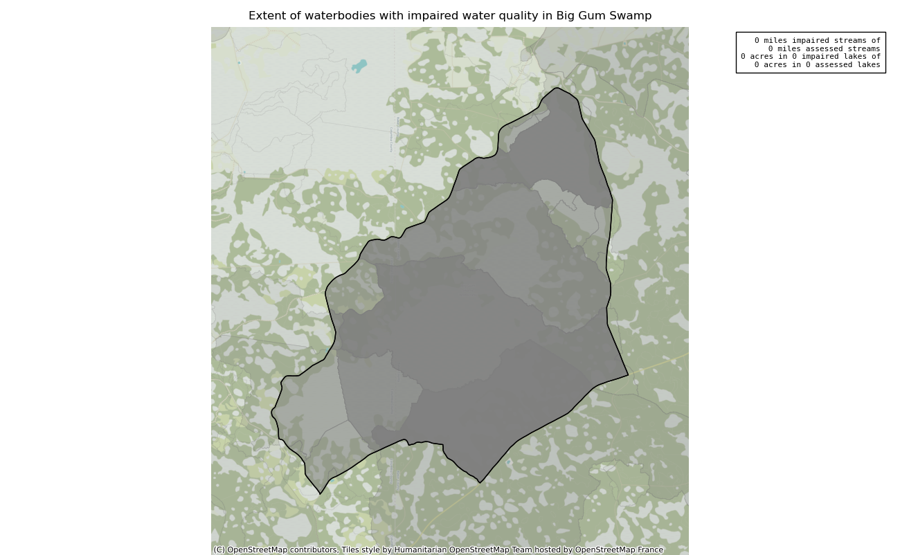 The 13835 acre Big Gum Swamp was designated as a National Wilderness on or around 1984-01-01, and Wilderness Character Monitoring baseline work was done in 2024. The maps in this section are made with USFS data, with terrain maps from the internet.