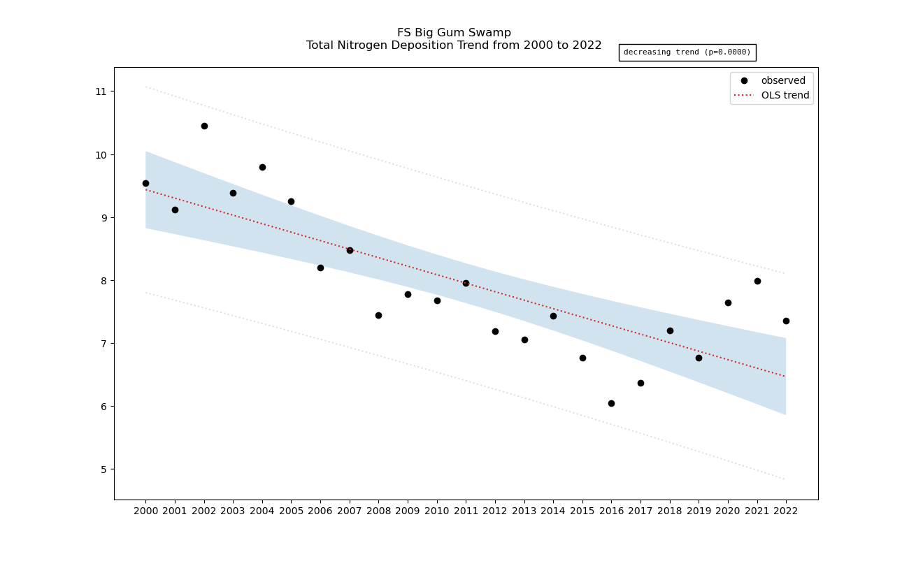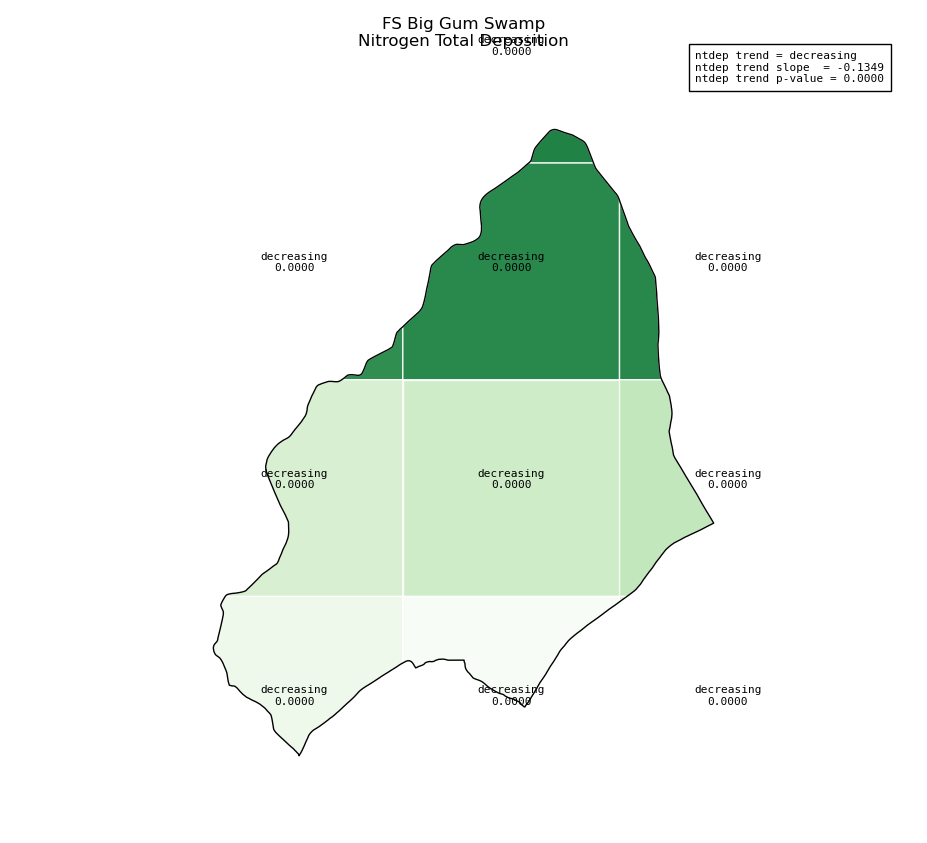 Annual averages for nitrogen total deposition are calculated by clipping the gridded ntdep data to the wilderness boundary, multiplying the total deposition value for each grid cell by its area inside the wilderness, summing ntdep for all cells, then dividing that sum by the total area of the wilderness. These annual averages are then used to determine nitrogen deposition trend inside the wilderness. Decreasing nitrogen deposition indicates an improvement in wilderness character.