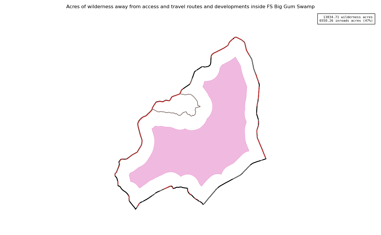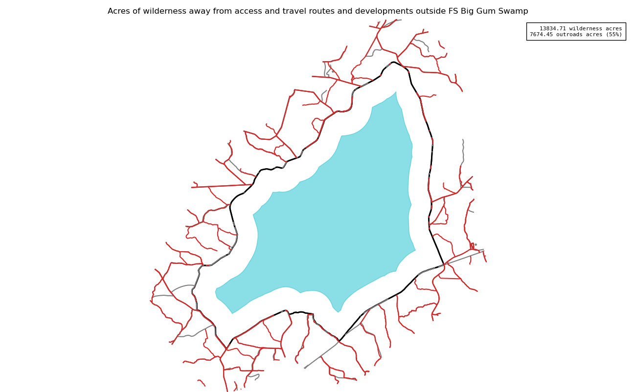 Note that roads and developments located exactly on the wilderness boundary are included in this measure. Spatial data resolution and accuracy can vary greatly across sources, and determining the intersection of a road represented by a single infinitely thin line can produce incorrect results. These should always be verified locally and corrected.