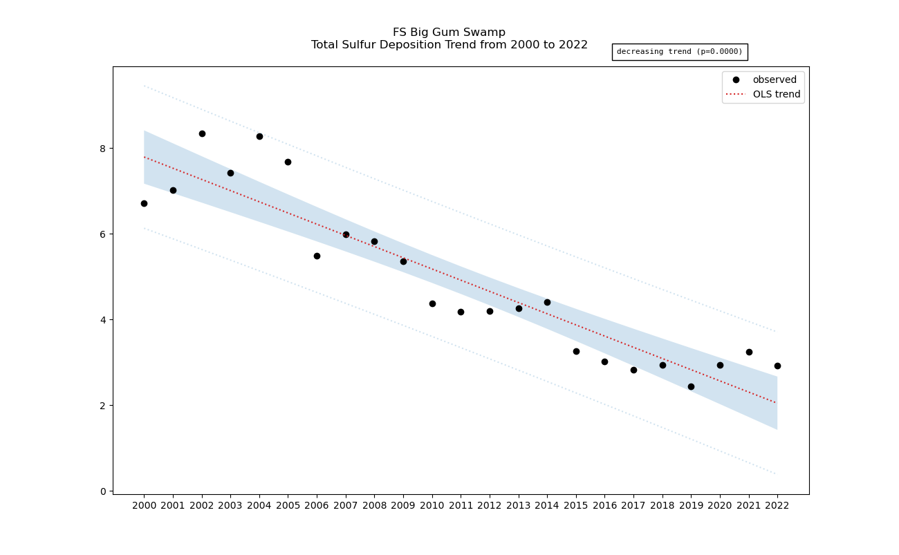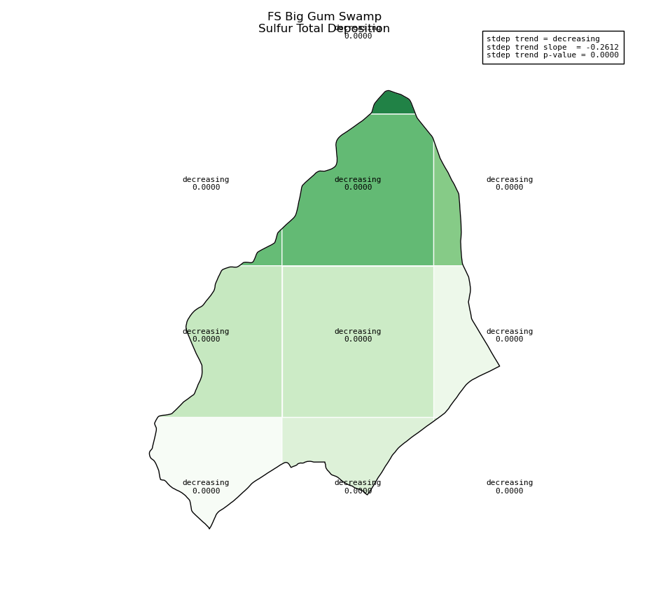 Annual averages for sulfur total deposition are calculated by clipping the gridded stdep data to the wilderness boundary, multiplying the total deposition value for each grid cell by its area inside the wilderness, summing stdep for all cells, then dividing that sum by the total area of the wilderness. These annual averages are then used to determine sulfur deposition trend inside the wilderness. Decreasing sulfur deposition indicates an improvement in wilderness character.