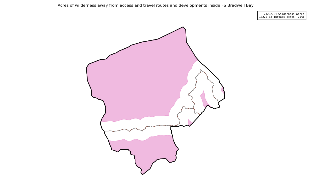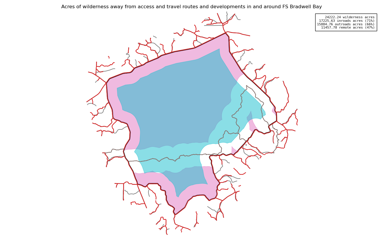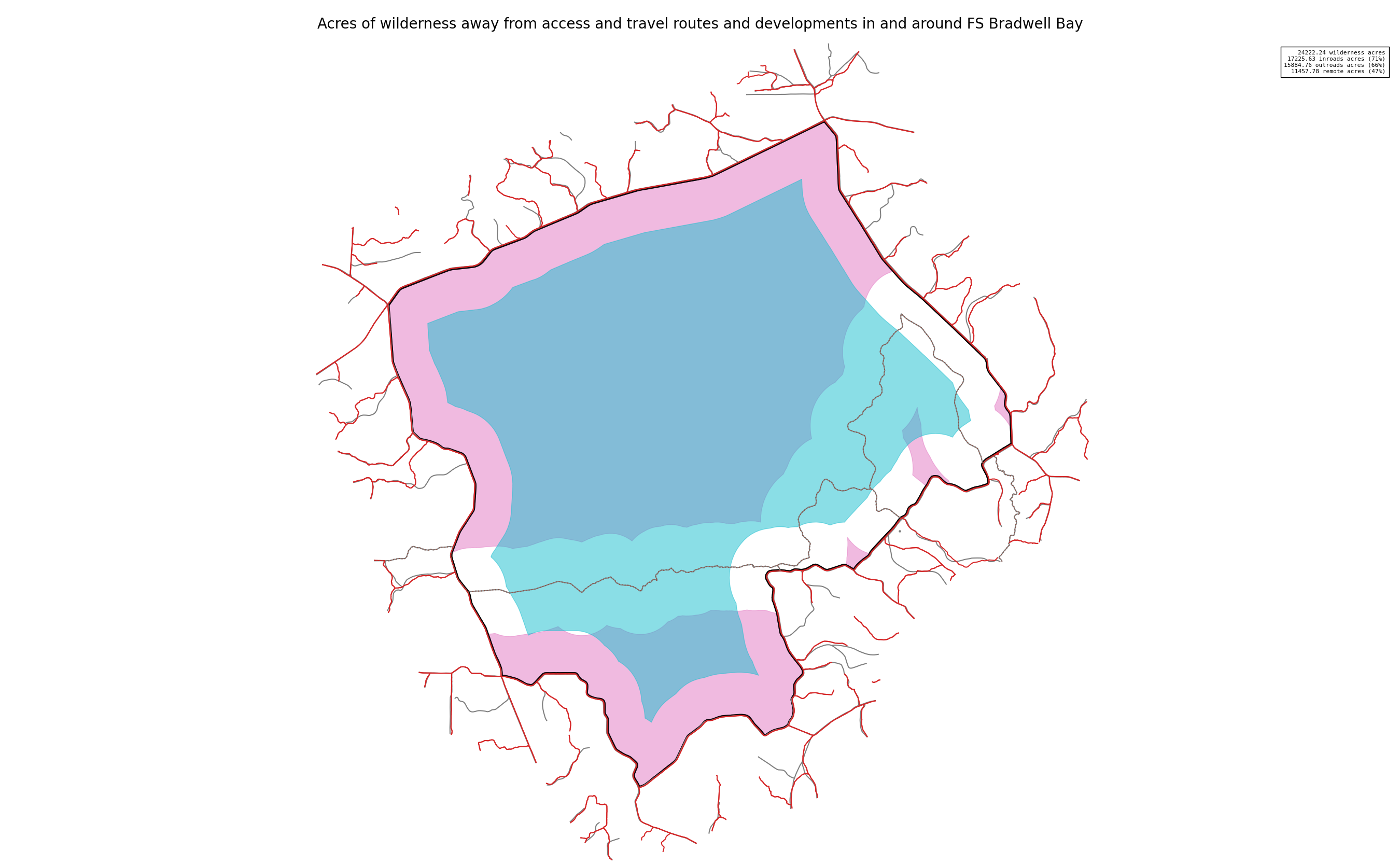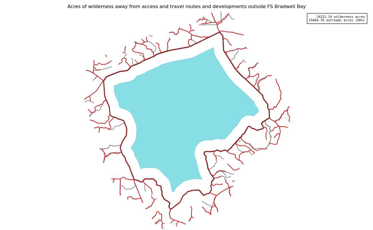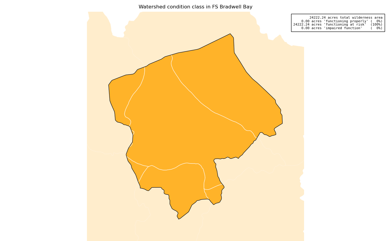 The 24222 acre Bradwell Bay was designated as a National Wilderness on or around 1975-01-01, and Wilderness Character Monitoring baseline work was done in 2024. The maps in this section are made with USFS data, with terrain maps from the internet.