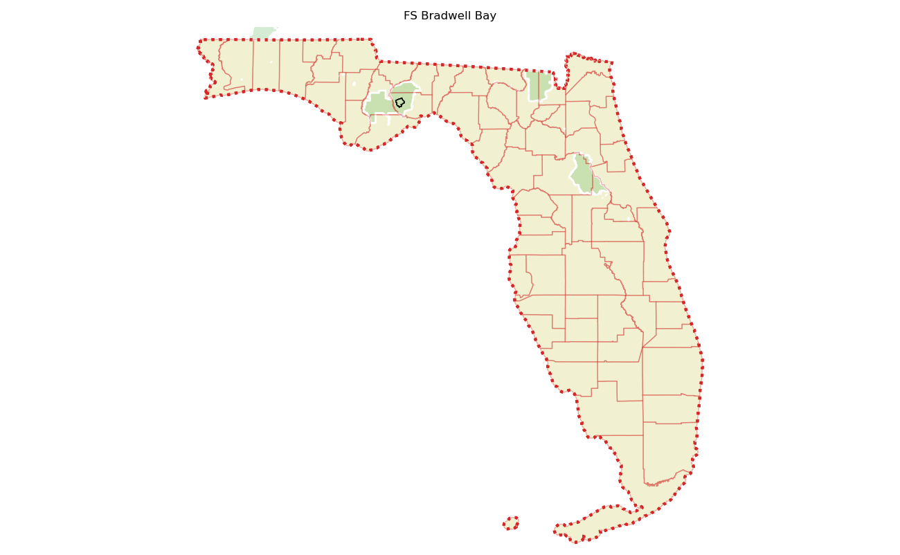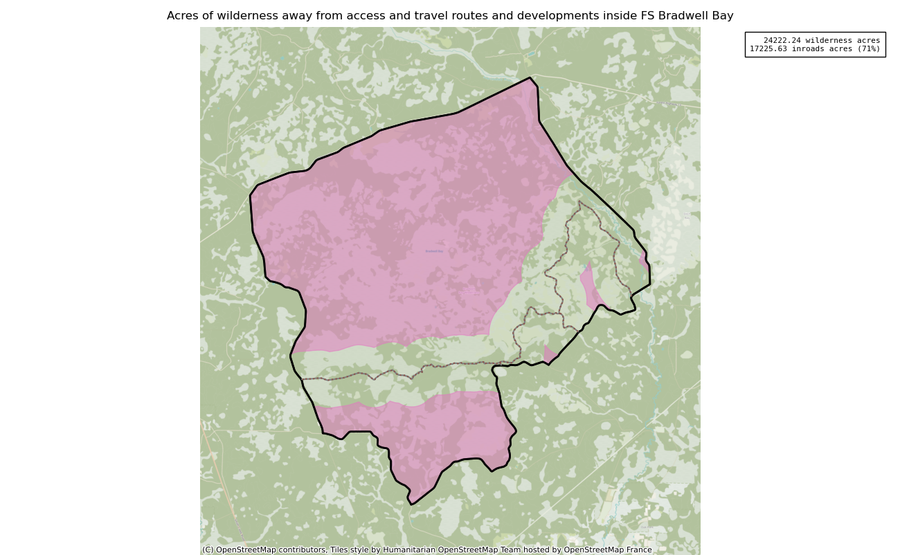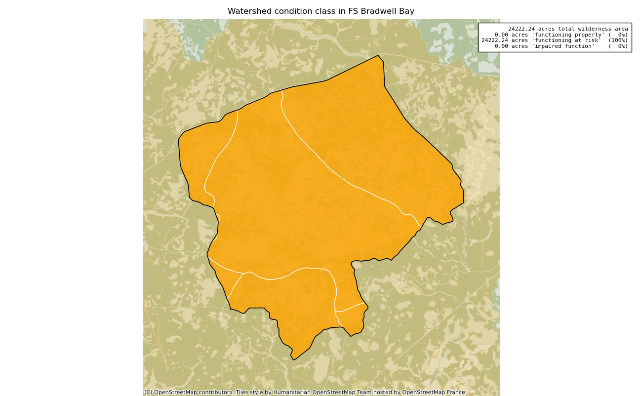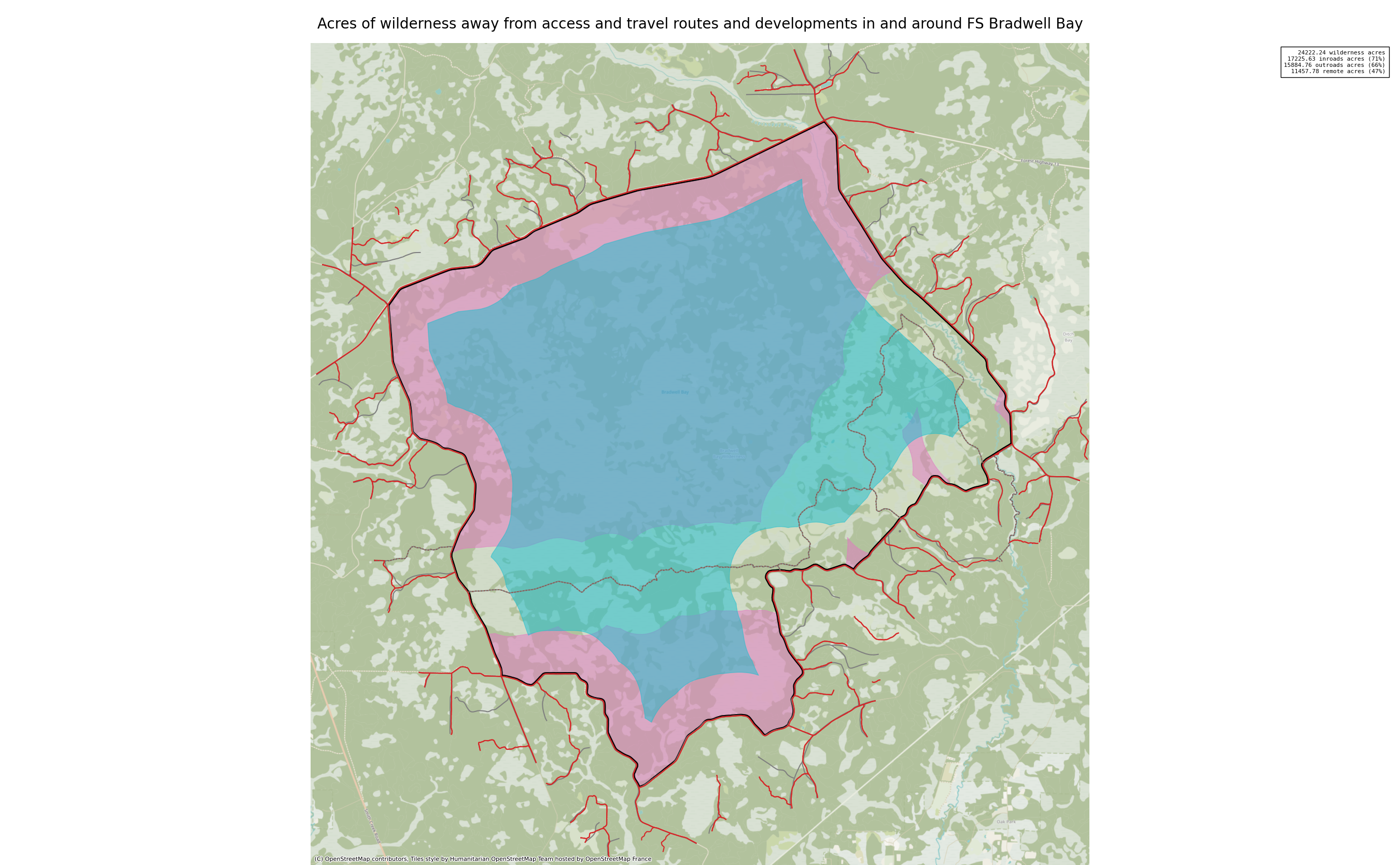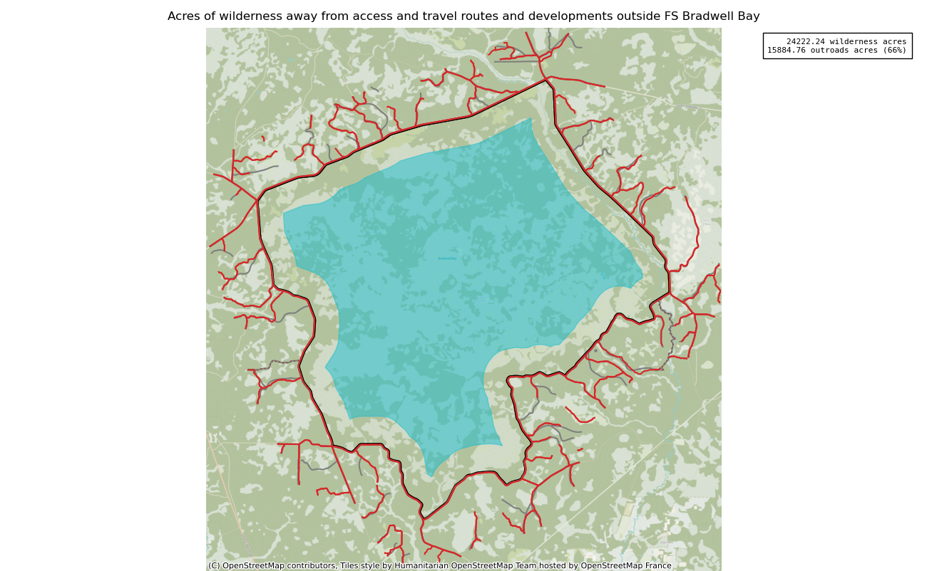 The 24222 acre Bradwell Bay was designated as a National Wilderness on or around 1975-01-01, and Wilderness Character Monitoring baseline work was done in 2024. The maps in this section are made with USFS data, with terrain maps from the internet.