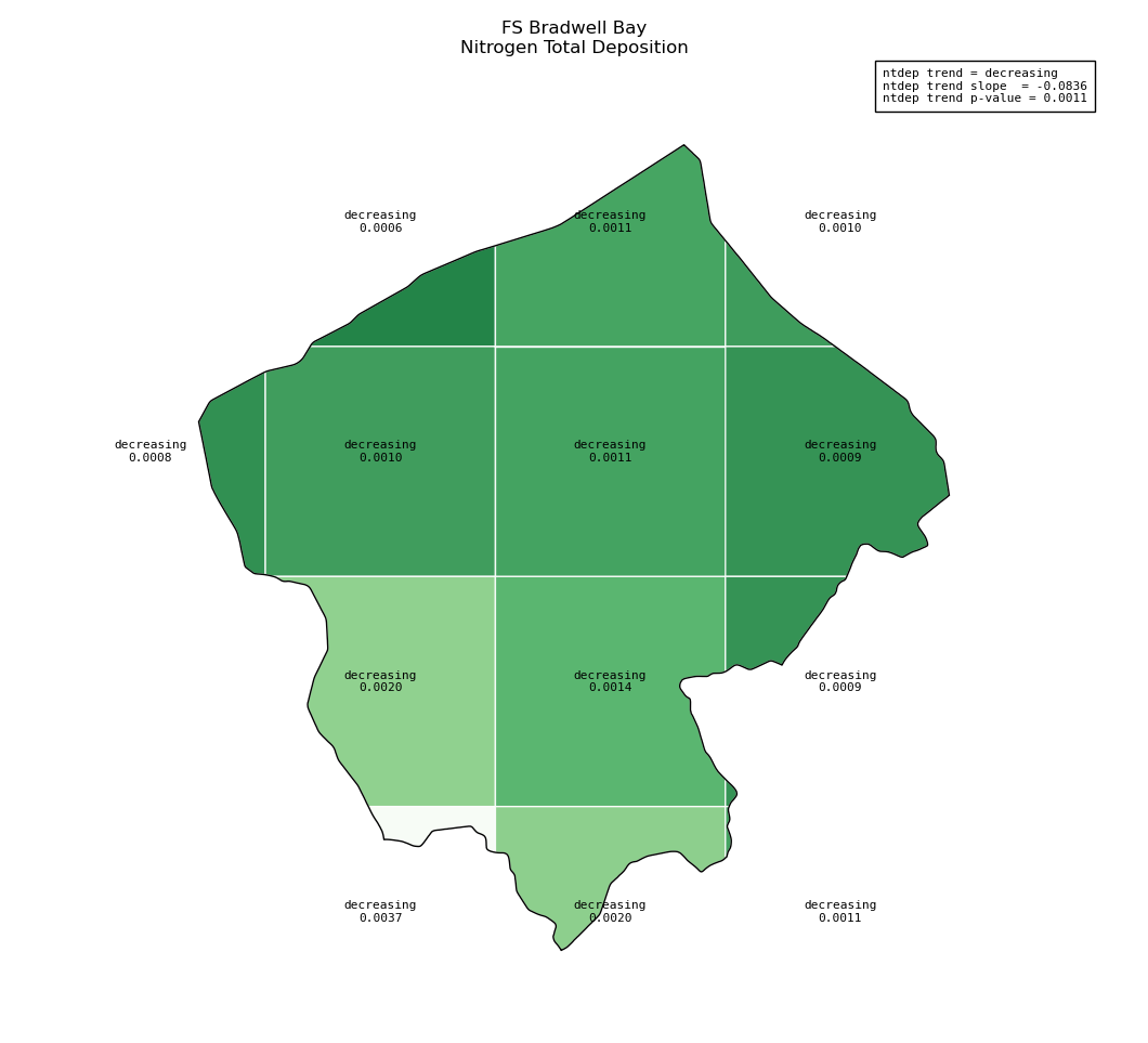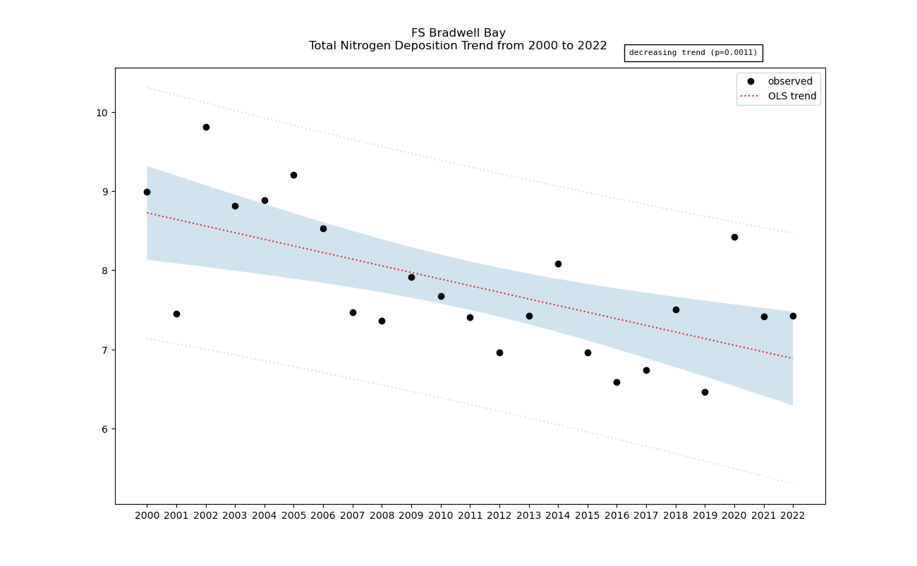 Annual averages for nitrogen total deposition are calculated by clipping the gridded ntdep data to the wilderness boundary, multiplying the total deposition value for each grid cell by its area inside the wilderness, summing ntdep for all cells, then dividing that sum by the total area of the wilderness. These annual averages are then used to determine nitrogen deposition trend inside the wilderness. Decreasing nitrogen deposition indicates an improvement in wilderness character.