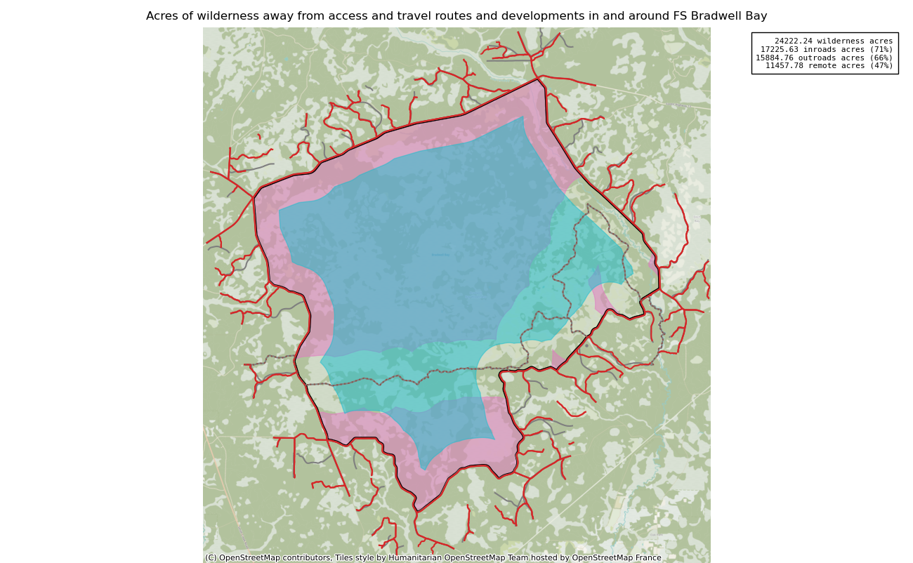 Note that roads and developments located exactly on the wilderness boundary are included in this measure. Spatial data resolution and accuracy can vary greatly across sources, and determining the intersection of a road represented by a single infinitely thin line can produce incorrect results. These should always be verified locally and corrected.
