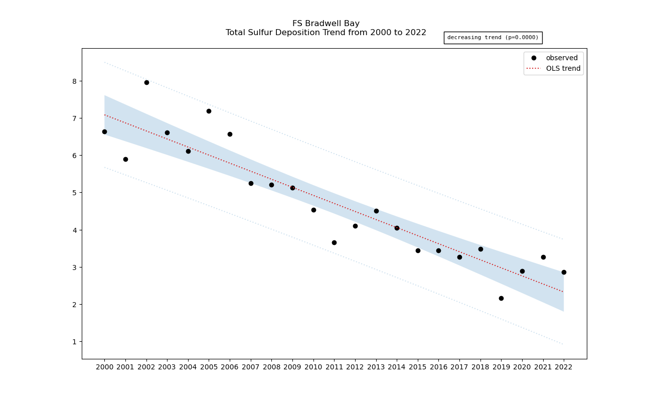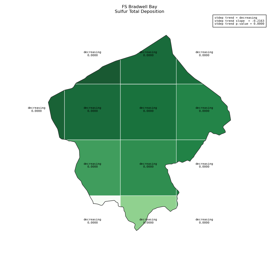 Annual averages for sulfur total deposition are calculated by clipping the gridded stdep data to the wilderness boundary, multiplying the total deposition value for each grid cell by its area inside the wilderness, summing stdep for all cells, then dividing that sum by the total area of the wilderness. These annual averages are then used to determine sulfur deposition trend inside the wilderness. Decreasing sulfur deposition indicates an improvement in wilderness character.