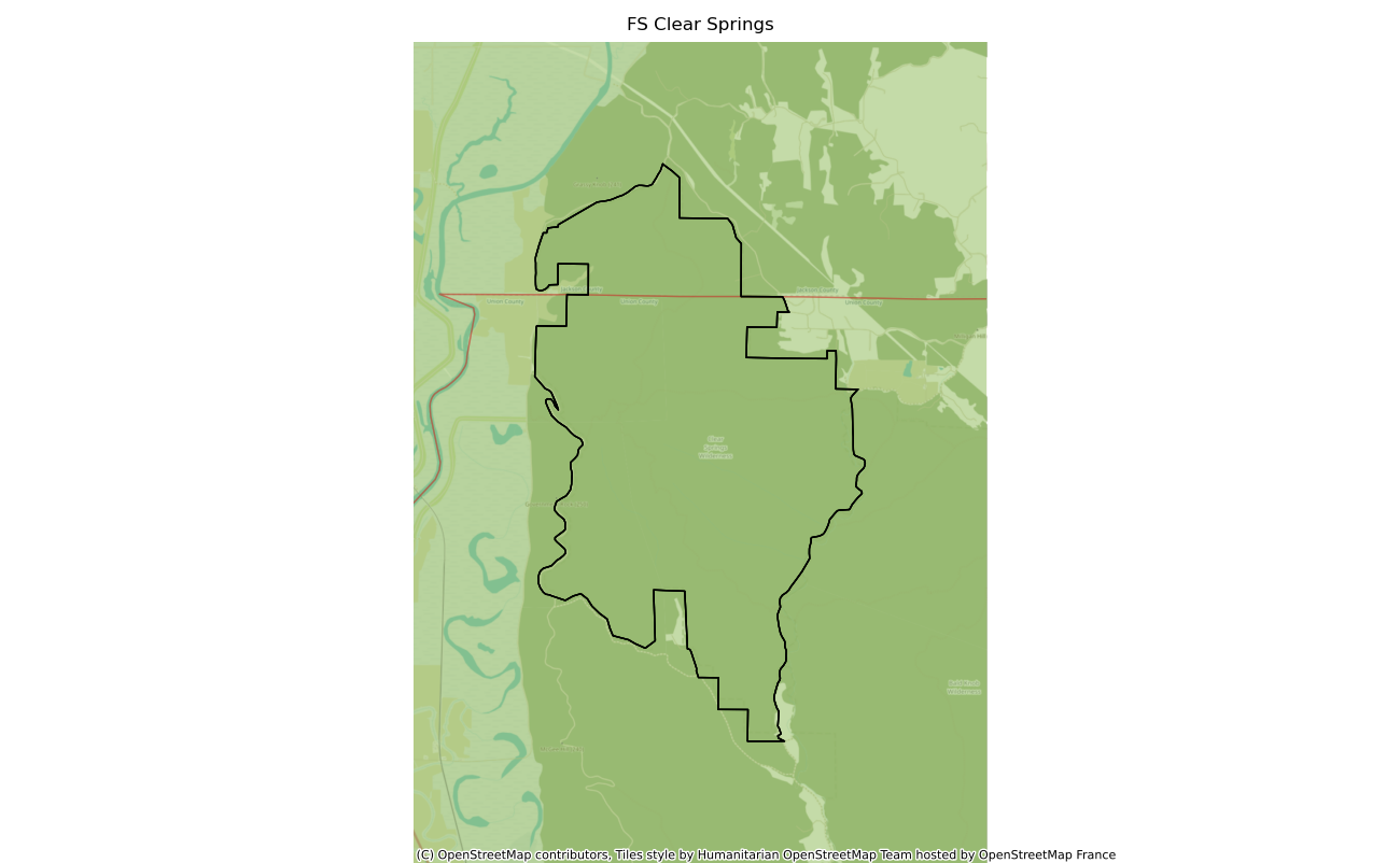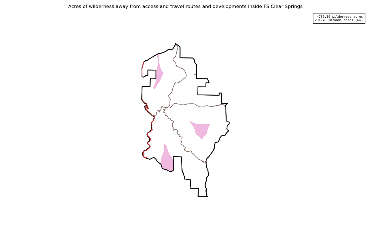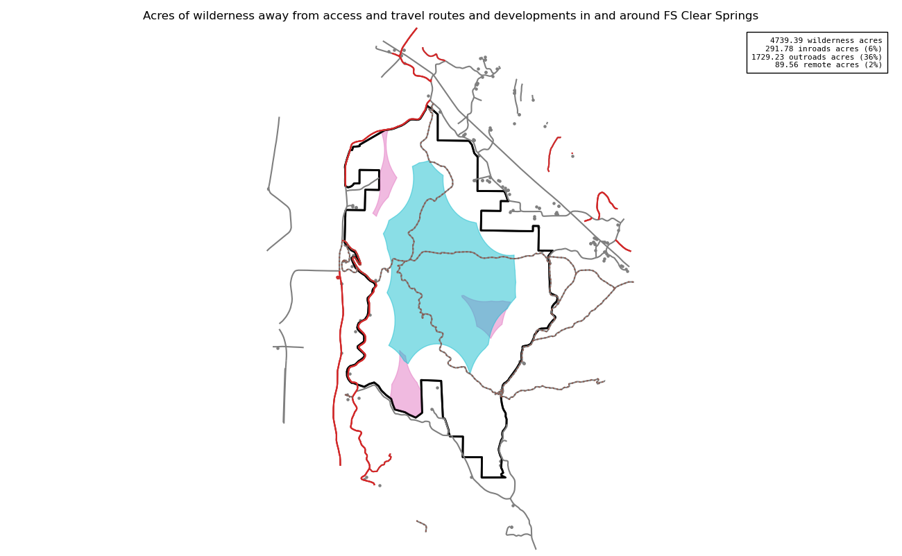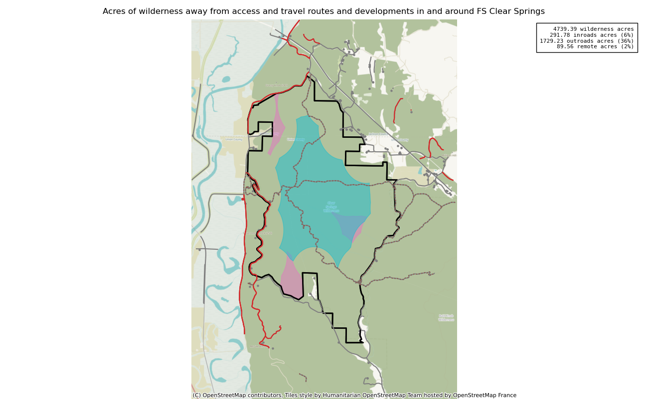 The 4739 acre Clear Springs was designated as a National Wilderness on or around 1990-01-01, and Wilderness Character Monitoring baseline work was done in 2025. The maps in this section are made with USFS data, with terrain maps from the internet.