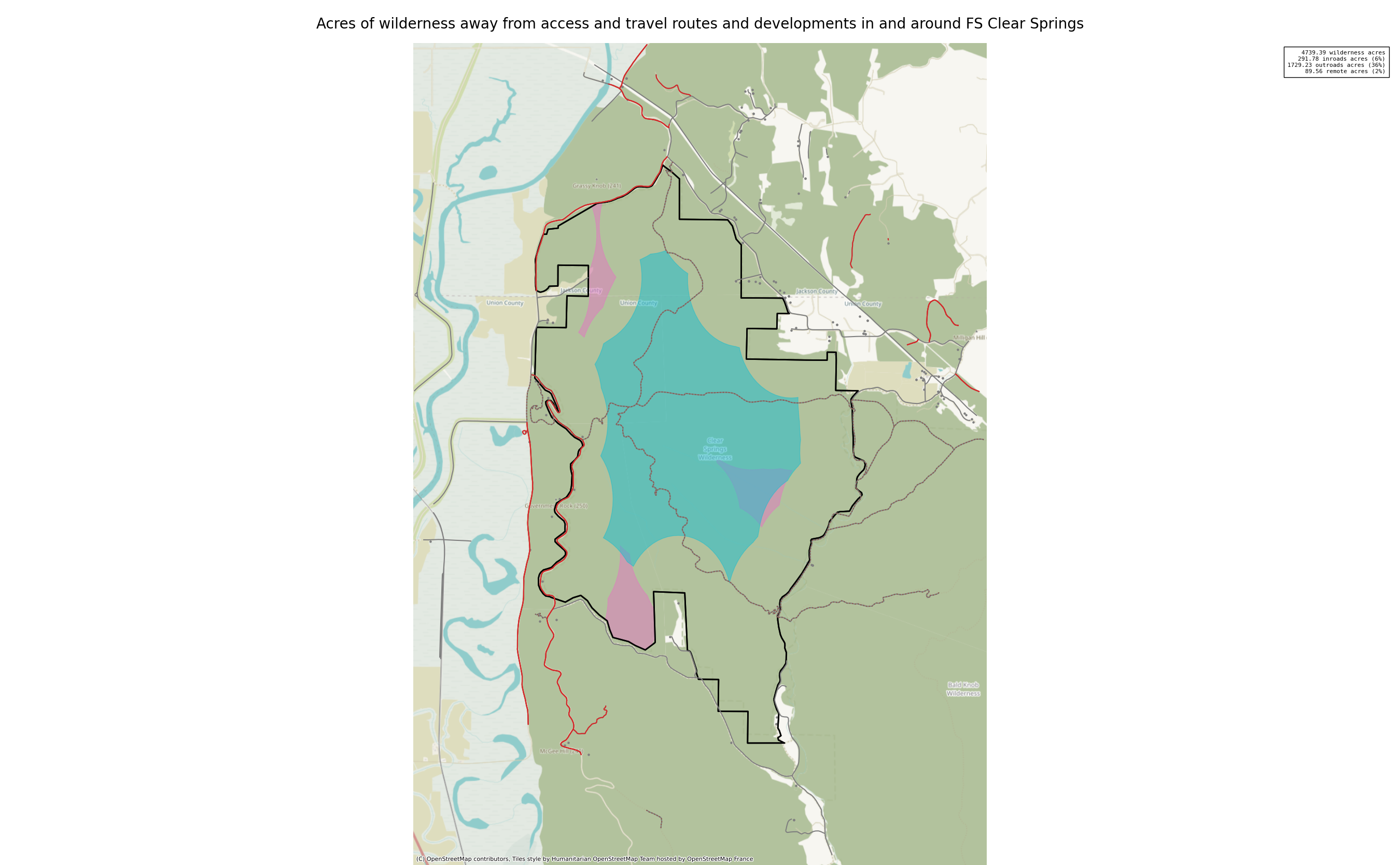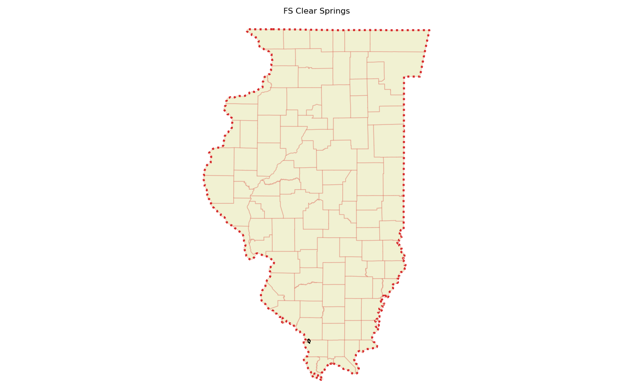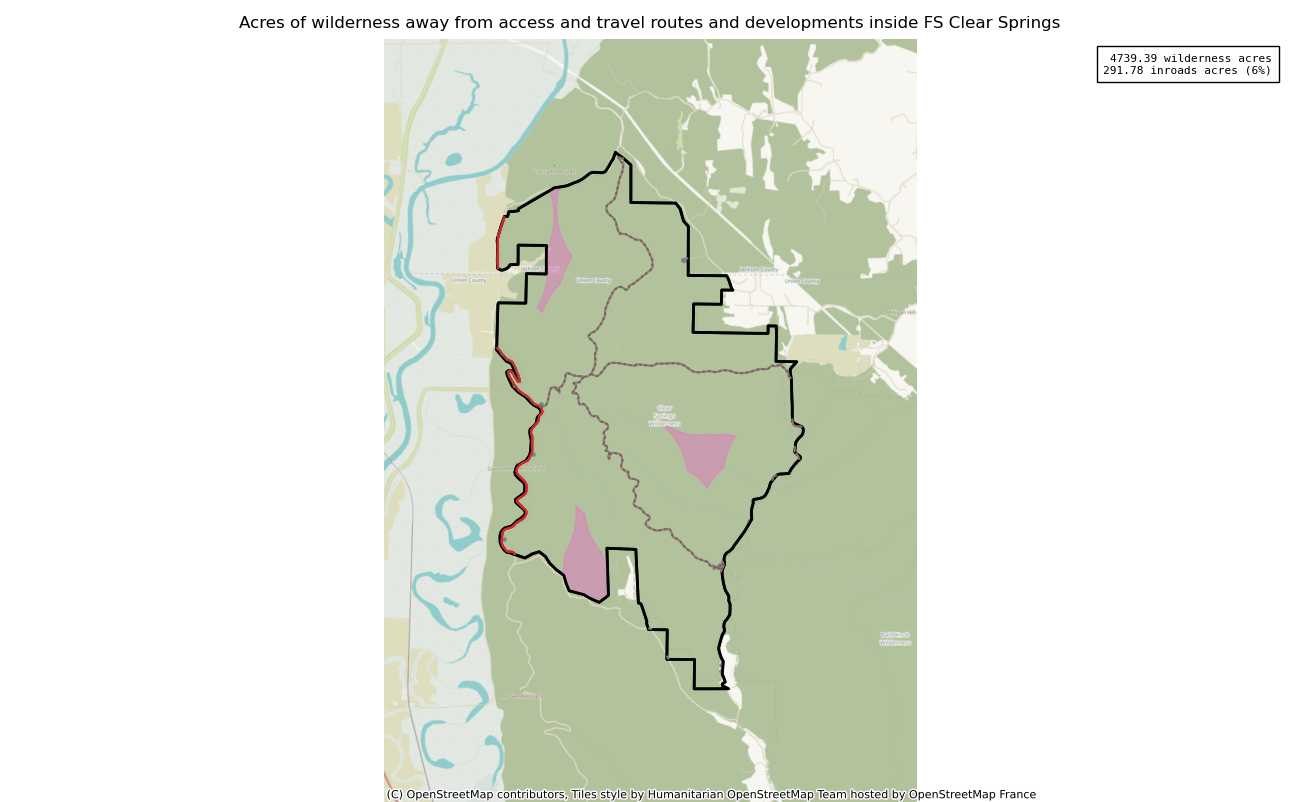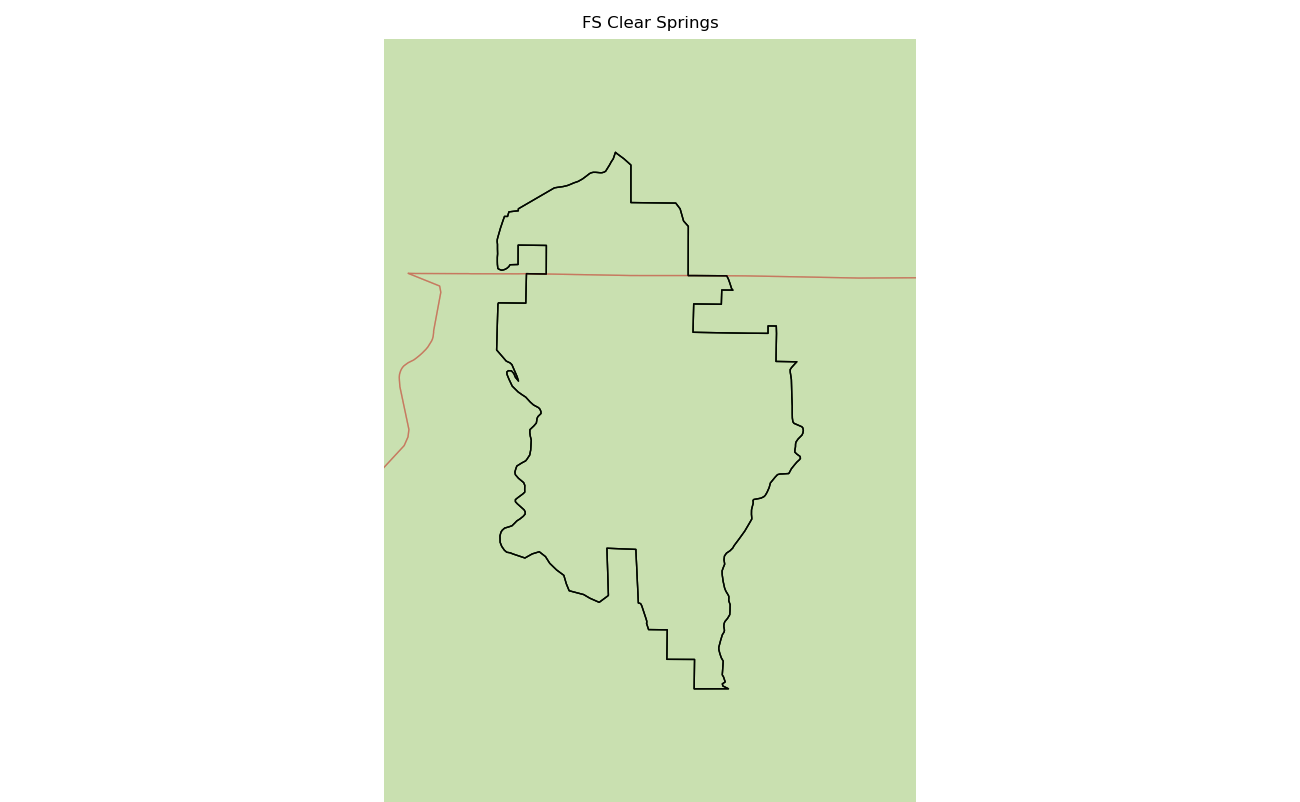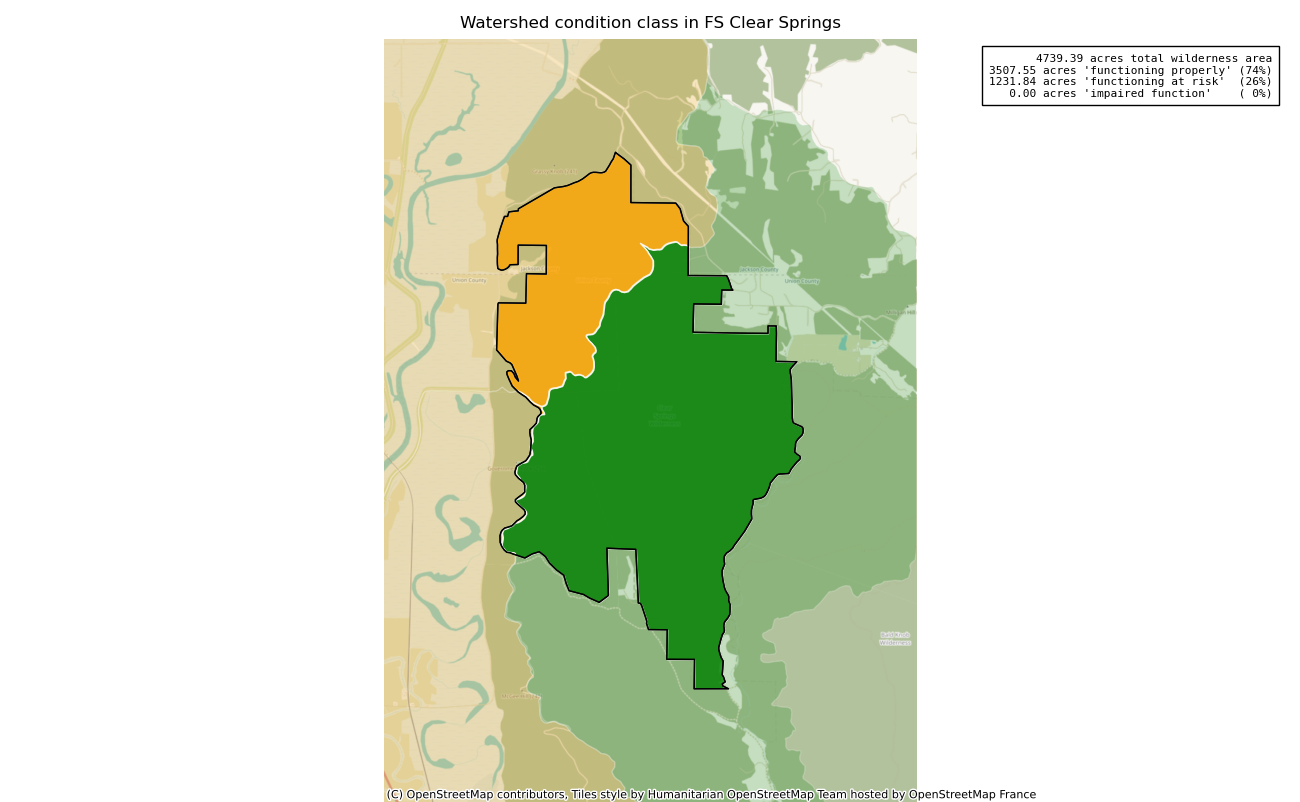 The 4739 acre Clear Springs was designated as a National Wilderness on or around 1990-01-01, and Wilderness Character Monitoring baseline work was done in 2025. The maps in this section are made with USFS data, with terrain maps from the internet.