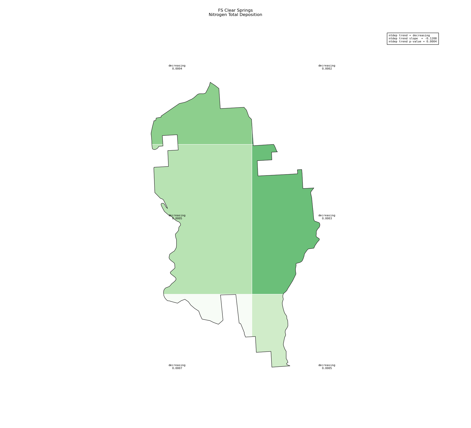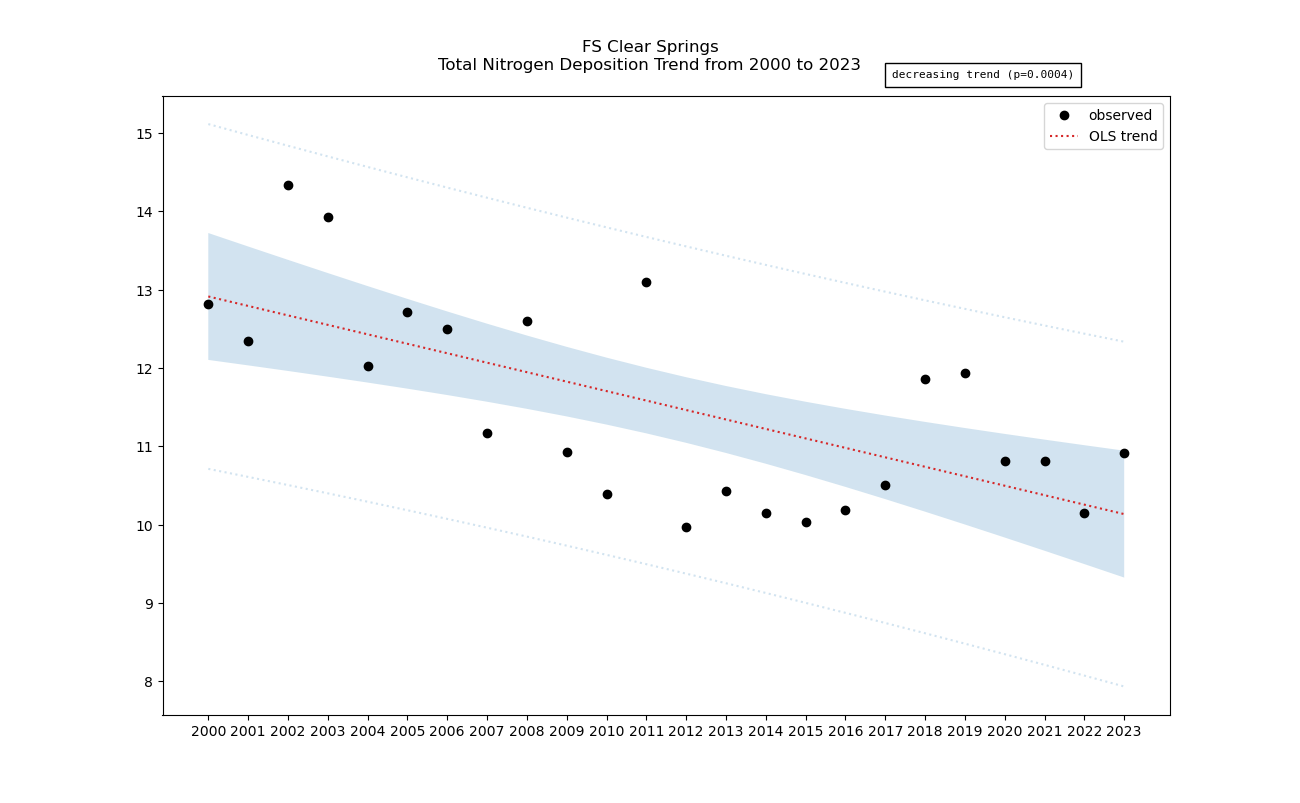 Annual averages for nitrogen total deposition are calculated by clipping the gridded ntdep data to the wilderness boundary, multiplying the total deposition value for each grid cell by its area inside the wilderness, summing ntdep for all cells, then dividing that sum by the total area of the wilderness. These annual averages are then used to determine nitrogen deposition trend inside the wilderness. Decreasing nitrogen deposition indicates an improvement in wilderness character.