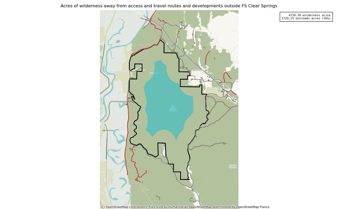 Note that roads and developments located exactly on the wilderness boundary are included in this measure. Spatial data resolution and accuracy can vary greatly across sources, and determining the intersection of a road represented by a single infinitely thin line can produce incorrect results. These should always be verified locally and corrected.