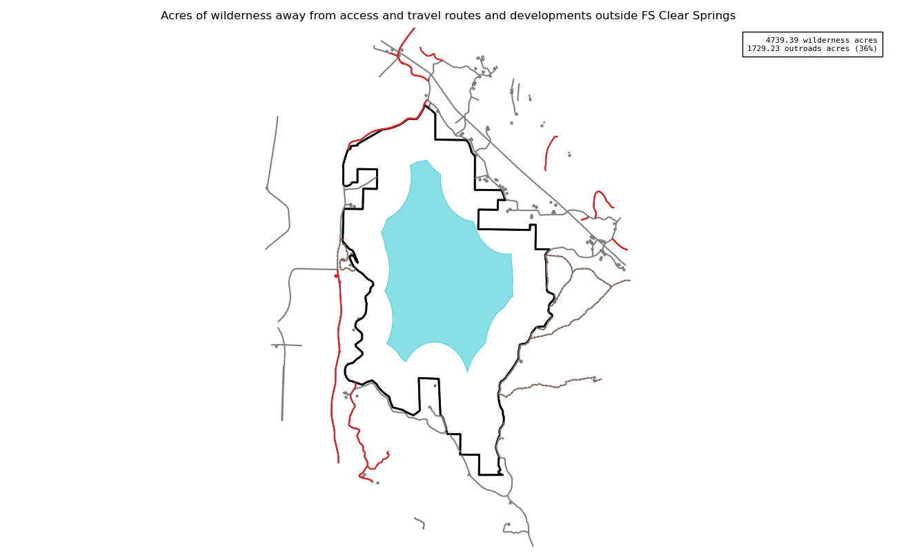 This measure assesses the total number of wilderness acres more than 1/2 mile from roads, structures, and other developments located outside a wilderness or on the boundary, including cherry-stemmed access road corridors and developed inholdings. Although legal protections and restrictions of wilderness do not extend to activities occurring outside a wilderness boundary, these activities can still degrade the wilderness experience. Signs of human activity and development outside wilderness manifest in many ways, including sounds from automobiles and off-highway vehicles on nearby travel routes, decreased visibility from air and light pollution, and visual evidence of increasing urbanization from high ridges and peaks.