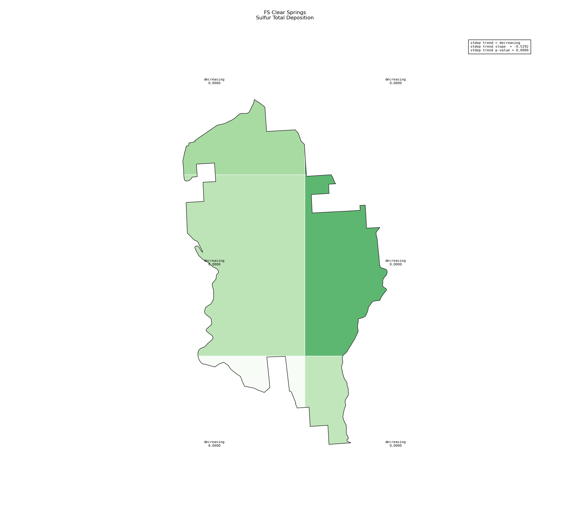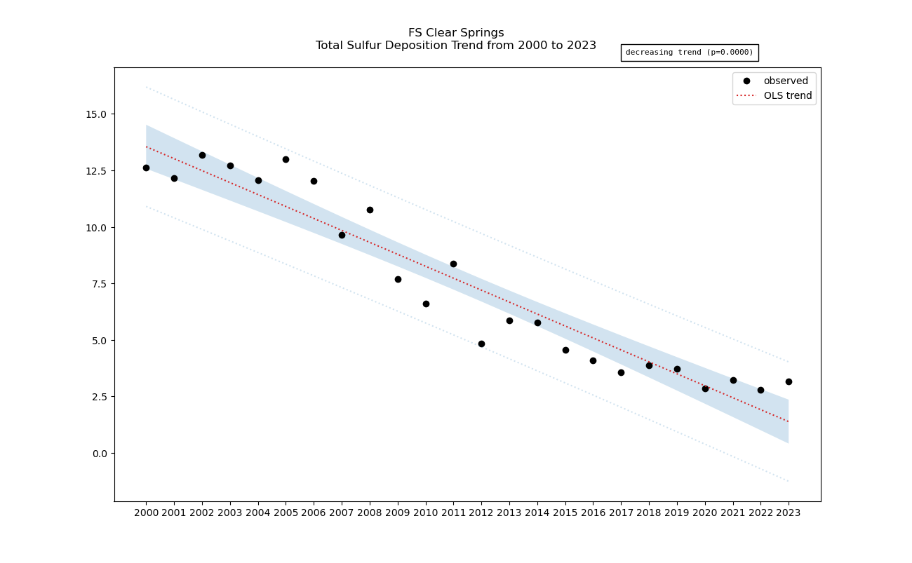 Annual averages for sulfur total deposition are calculated by clipping the gridded stdep data to the wilderness boundary, multiplying the total deposition value for each grid cell by its area inside the wilderness, summing stdep for all cells, then dividing that sum by the total area of the wilderness. These annual averages are then used to determine sulfur deposition trend inside the wilderness. Decreasing sulfur deposition indicates an improvement in wilderness character.