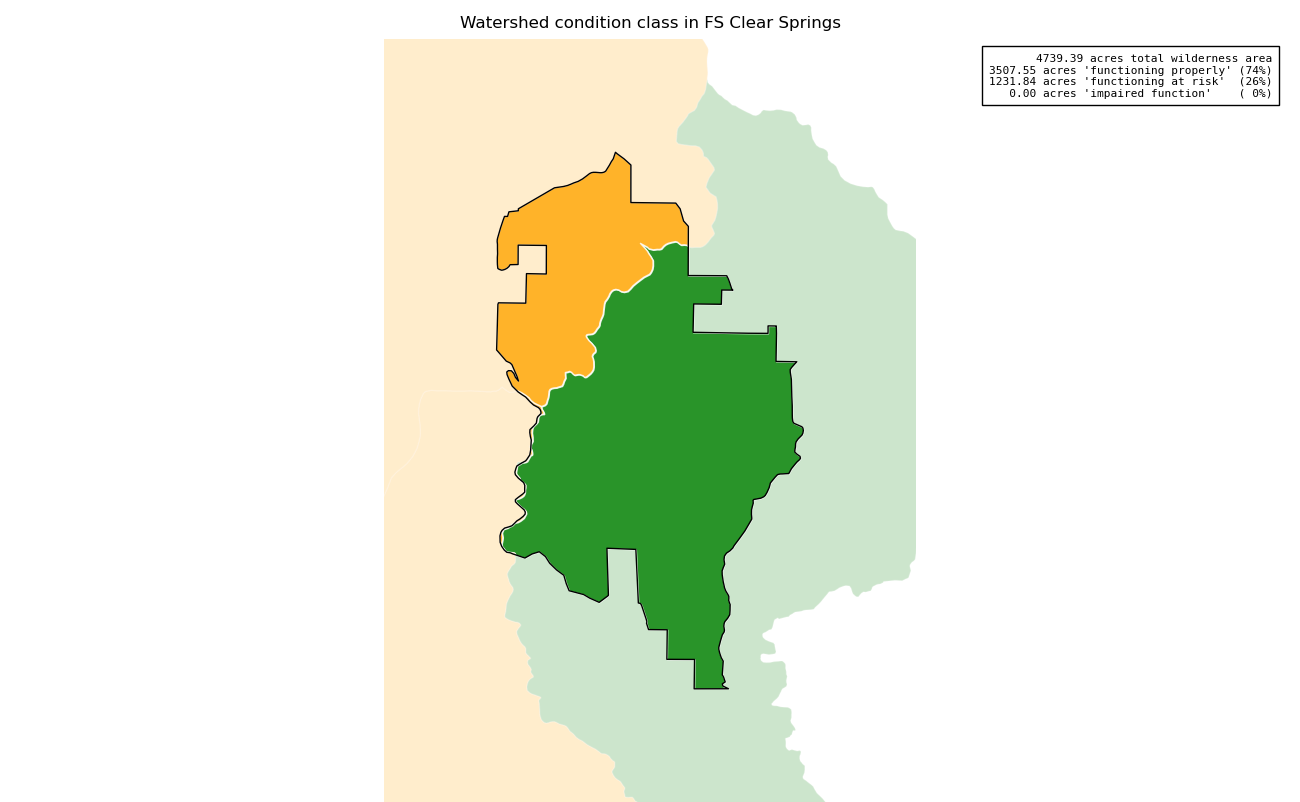 The Watershed Condition Class measure is intended to monitor changes in the watershed functions supporting aquatic ecosystems inside the wilderness. USFS Watershed Condition Class is derived from 12 different indicators -- water quality, water quantity, aquatic habitat, aquatic biota, roads and trails, soils, riparian/wetland vegetation, fire regime or wildfire, forest cover, rangeland vegetation, terrestrial invasive species, and forest health -- resulting in a single score describing watershed integrity for each watershed: