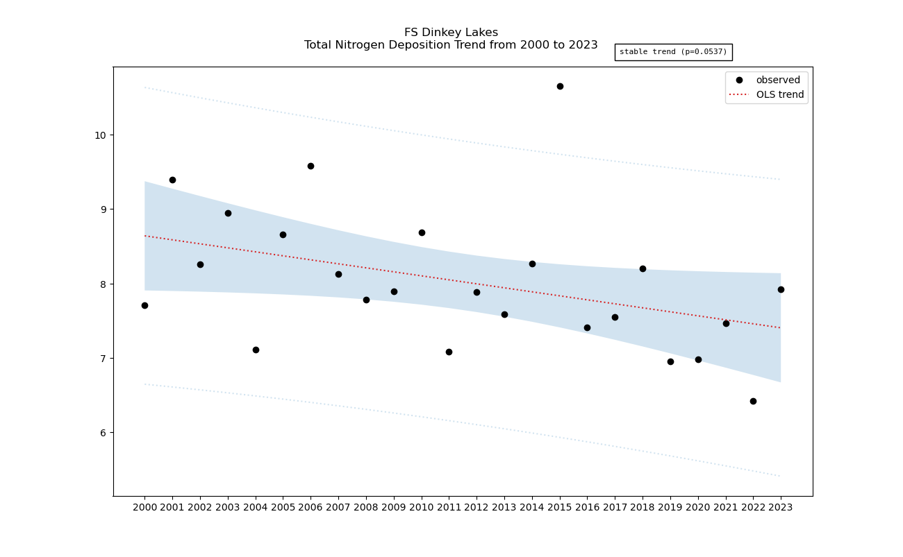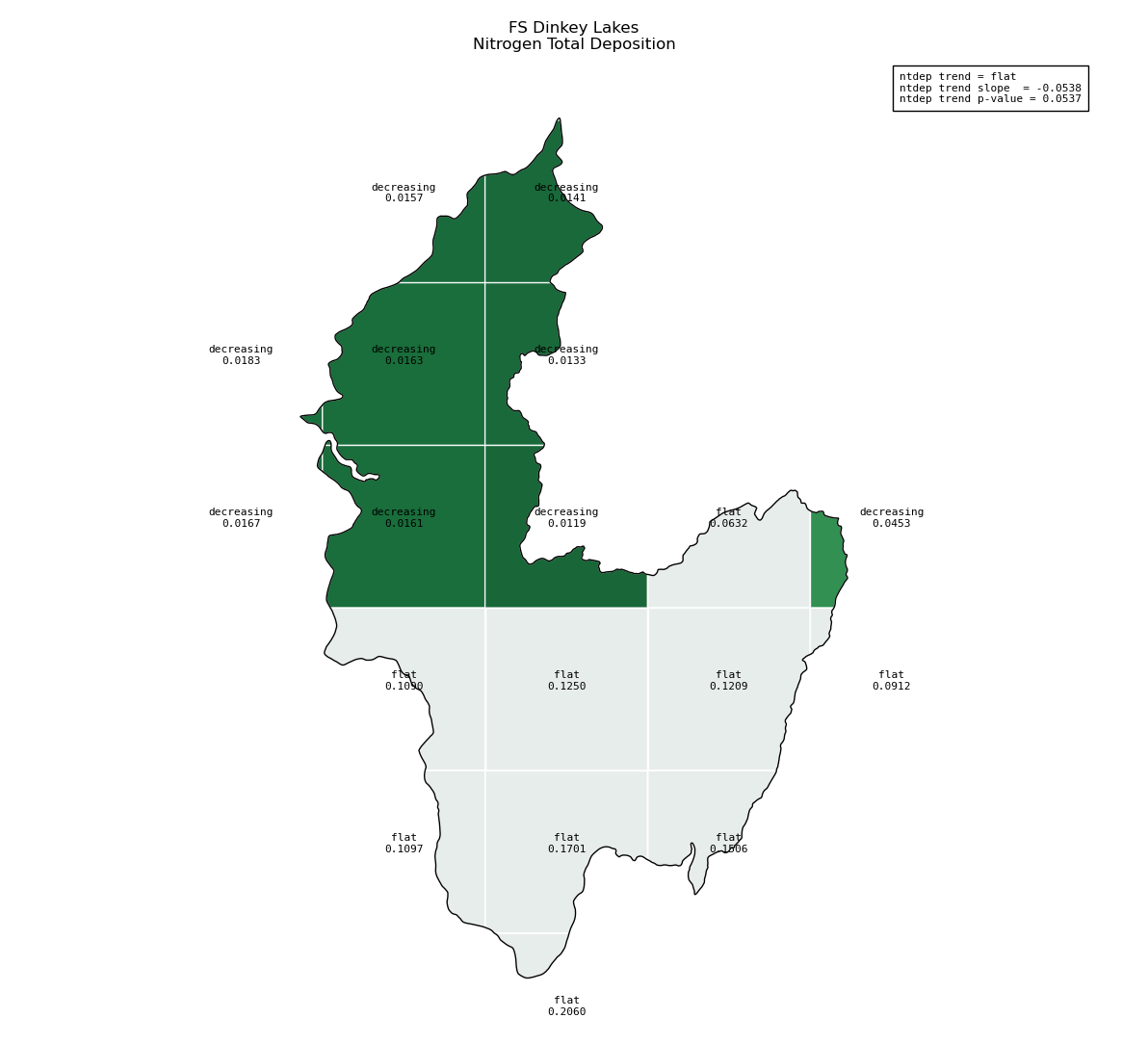 Annual averages for nitrogen total deposition are calculated by clipping the gridded ntdep data to the wilderness boundary, multiplying the total deposition value for each grid cell by its area inside the wilderness, summing ntdep for all cells, then dividing that sum by the total area of the wilderness. These annual averages are then used to determine nitrogen deposition trend inside the wilderness. Decreasing nitrogen deposition indicates an improvement in wilderness character.