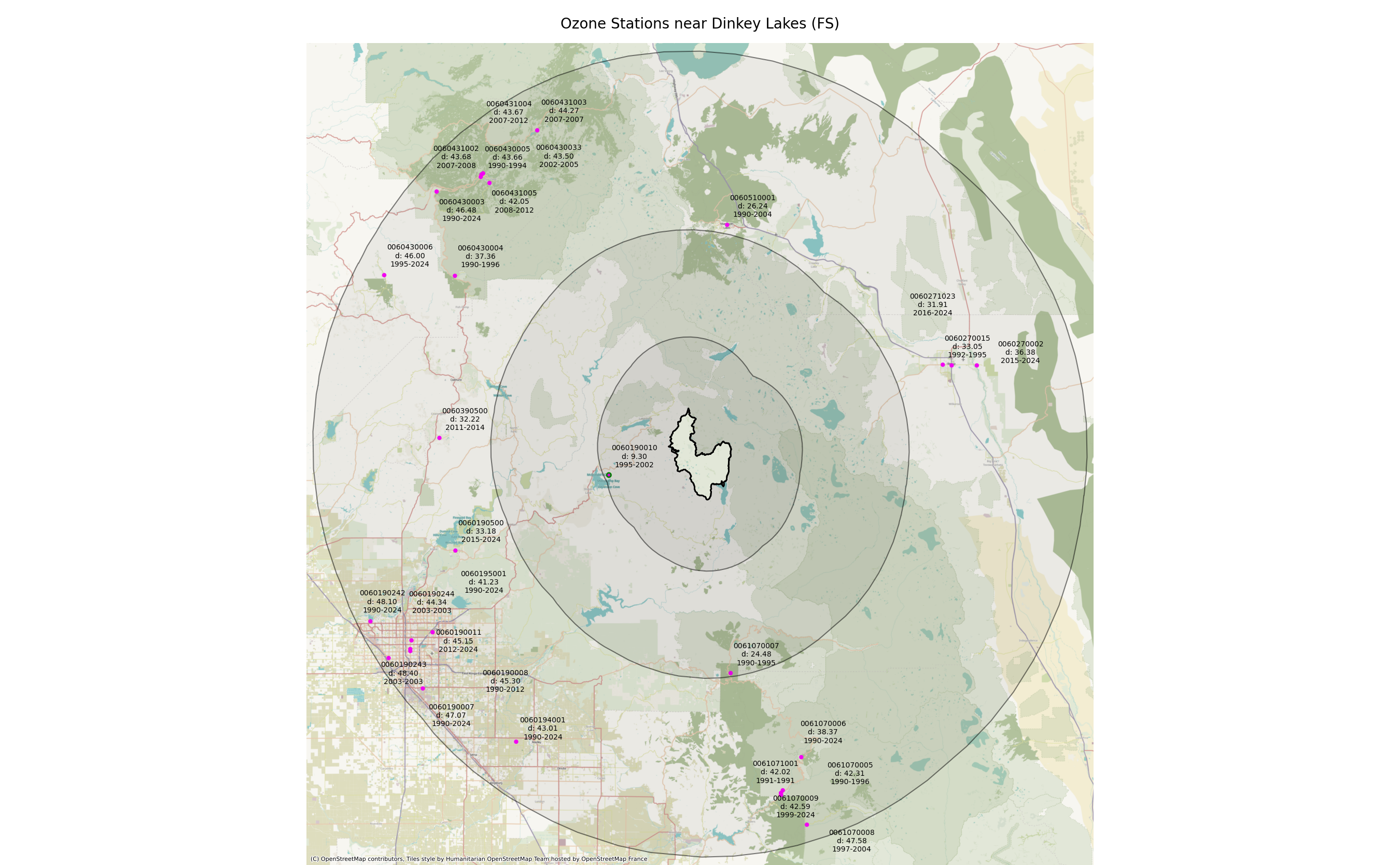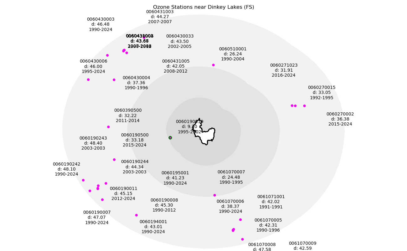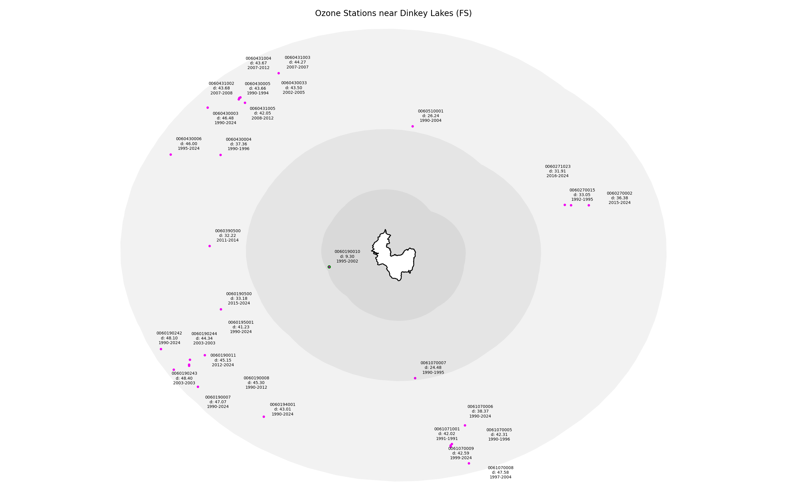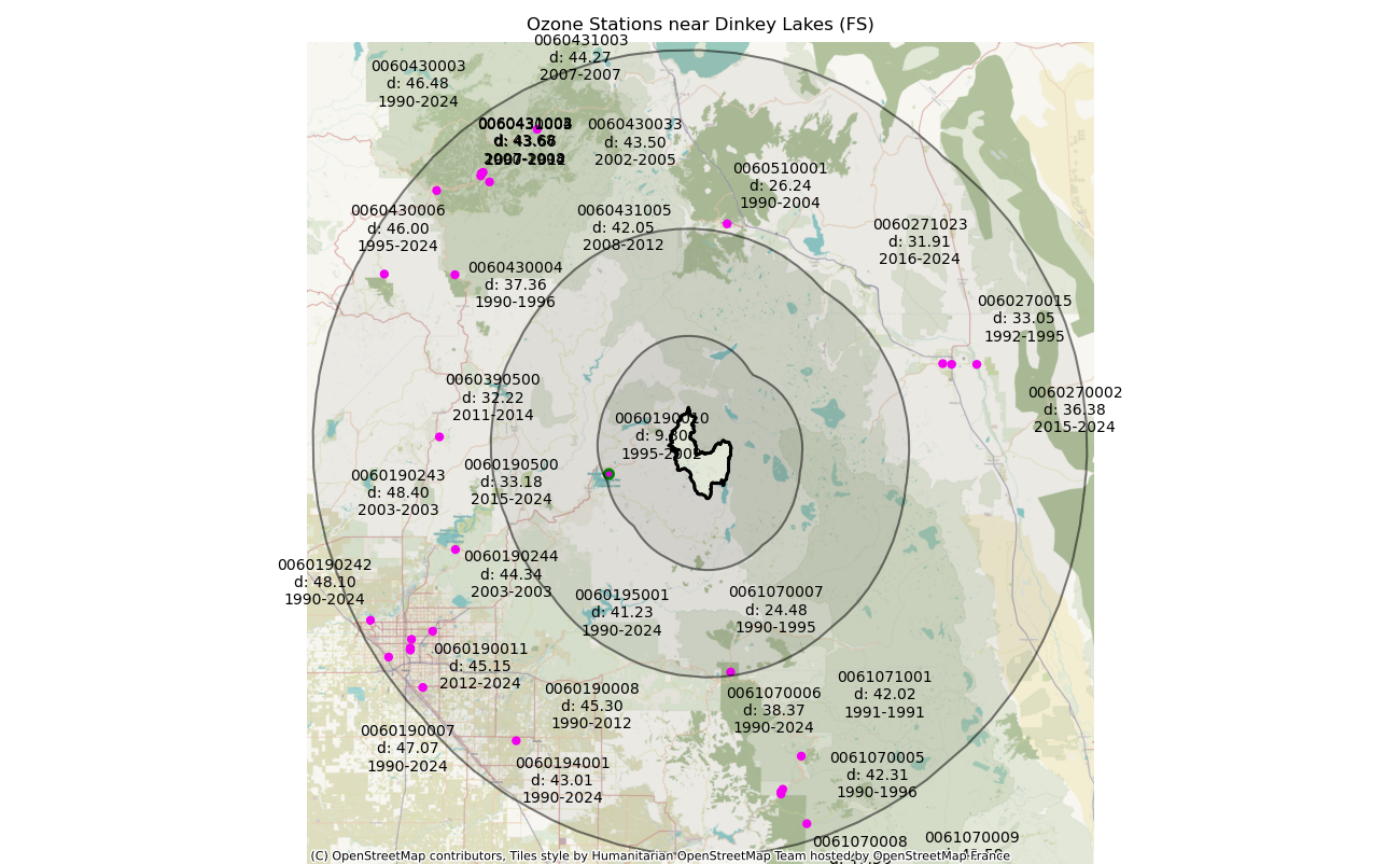 Monitoring data from sites located within 25 miles of a wilderness boundary are generally considered representative. Only ozone data from 1990 forward are considered valid for this measure, so the earliest 3-year moving average used for any wilderness should be 1992. Period of record otherwise begins at the year of wilderness designation. A wilderness designated in 2000, for example, would use data from 2000, and the first 3-year average would be from 2002. Not all ozone monitoring sites have legacy data dating from the year of designation, in which case the baseline trend uses the ozone data when monitoring began.