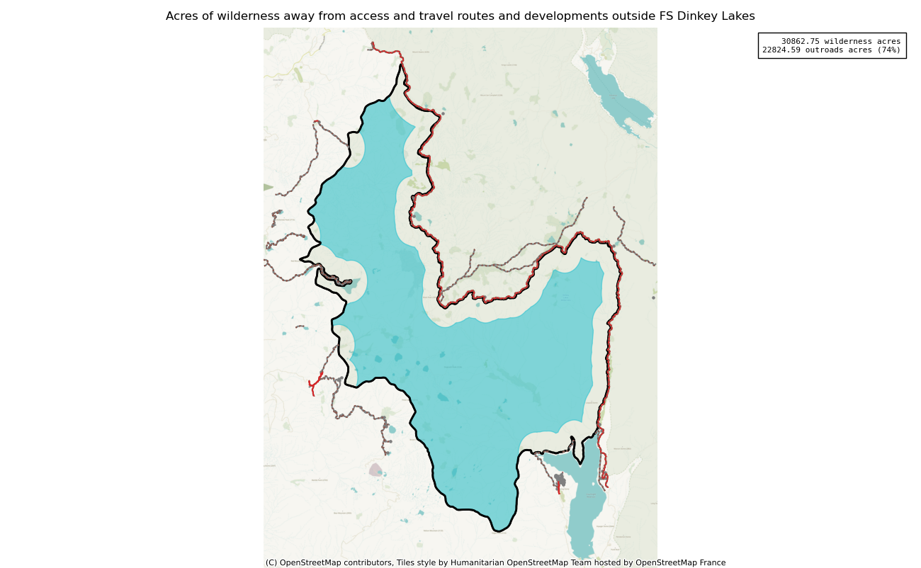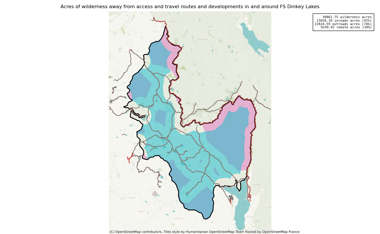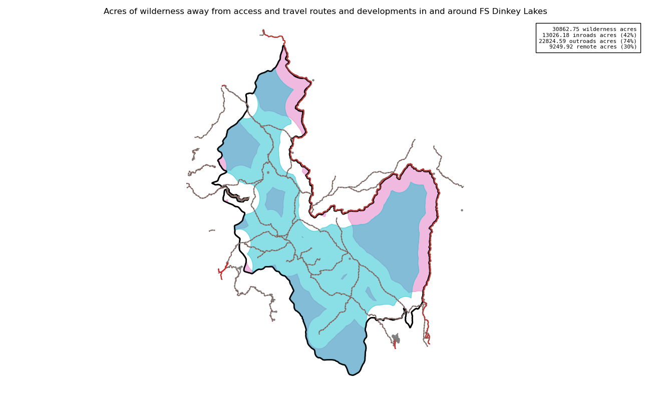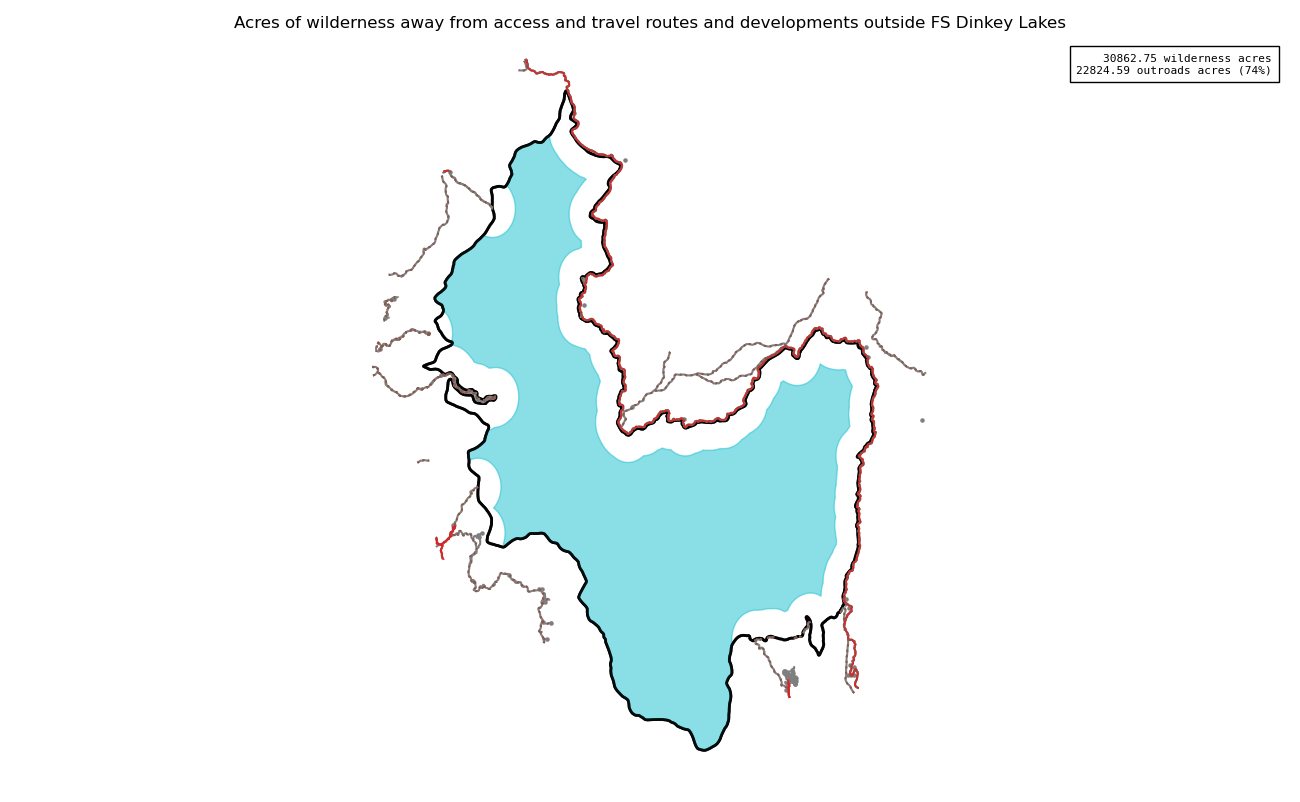 Note that roads and developments located exactly on the wilderness boundary are included in this measure. Spatial data resolution and accuracy can vary greatly across sources, and determining the intersection of a road represented by a single infinitely thin line can produce incorrect results. These should always be verified locally and corrected.