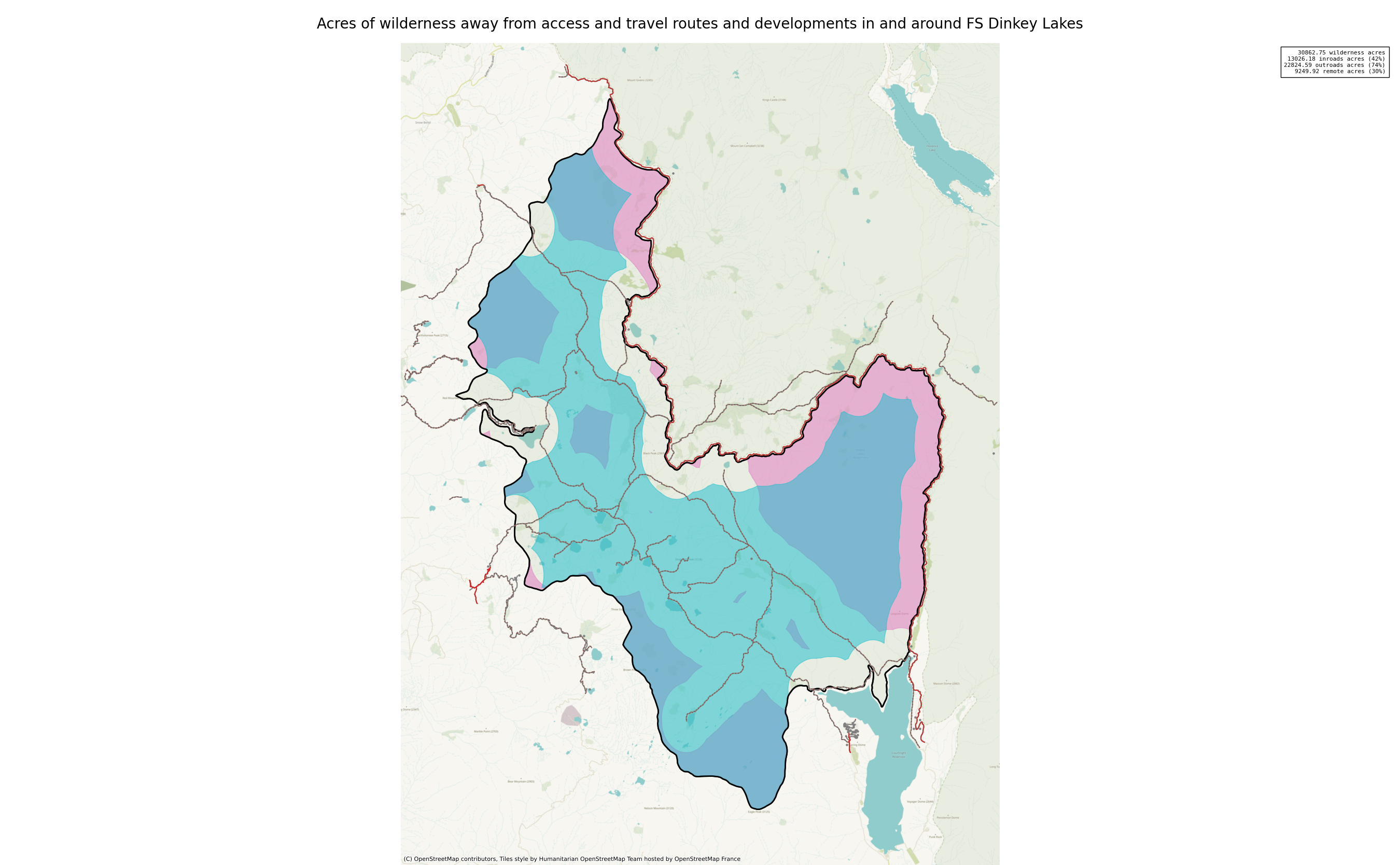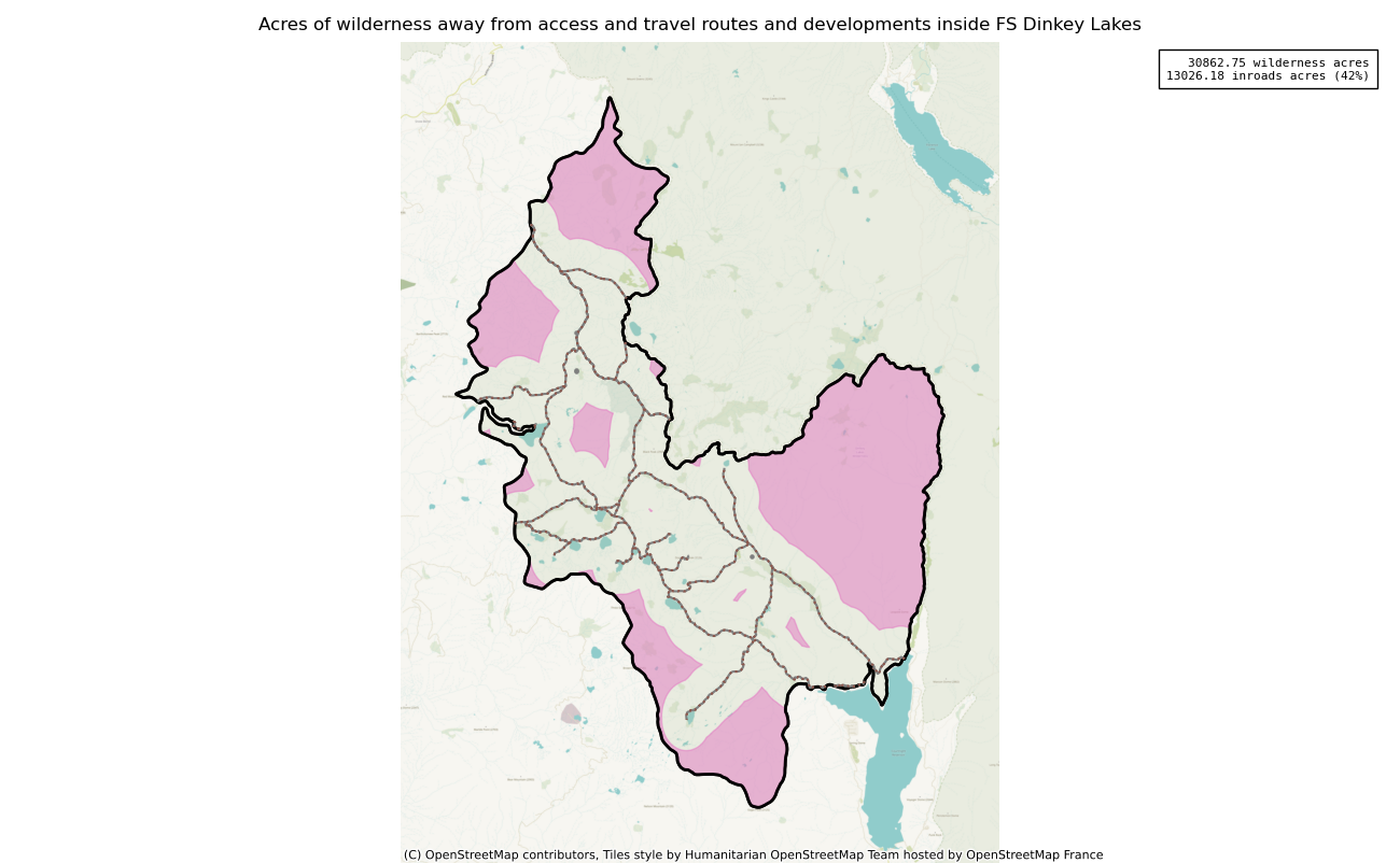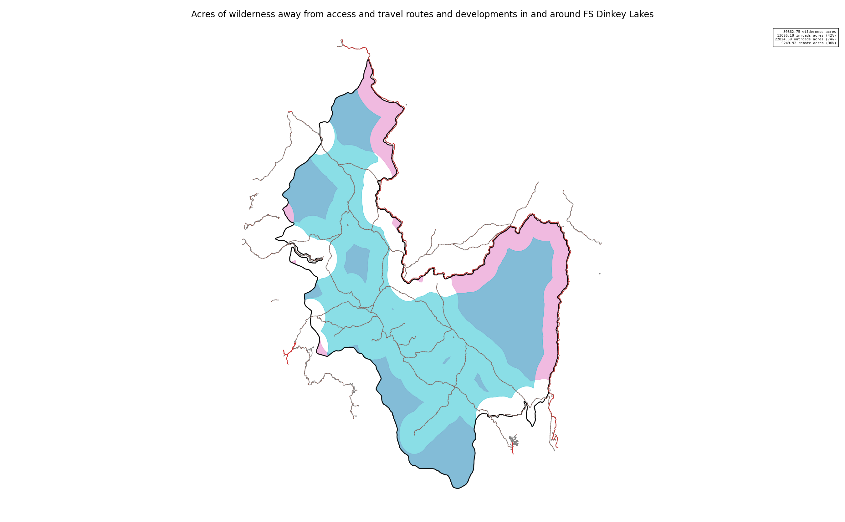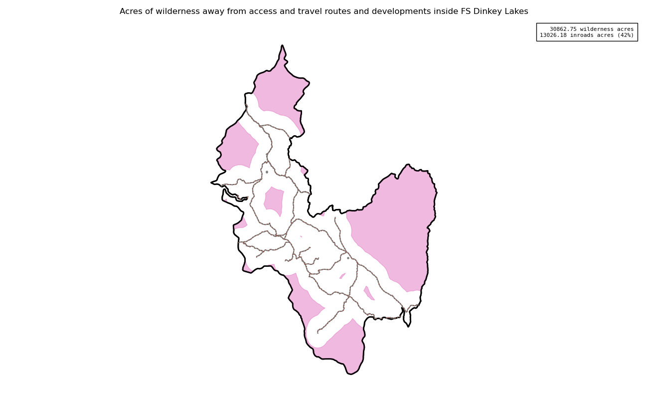 Note that roads and developments located exactly on the wilderness boundary are included in this measure. Spatial data resolution and accuracy can vary greatly across sources, and determining the intersection of a road represented by a single infinitely thin line can produce incorrect results. These should always be verified locally and corrected.