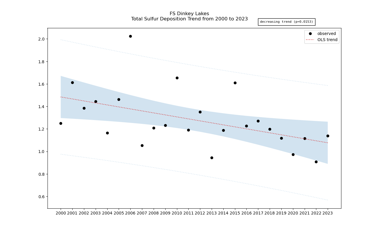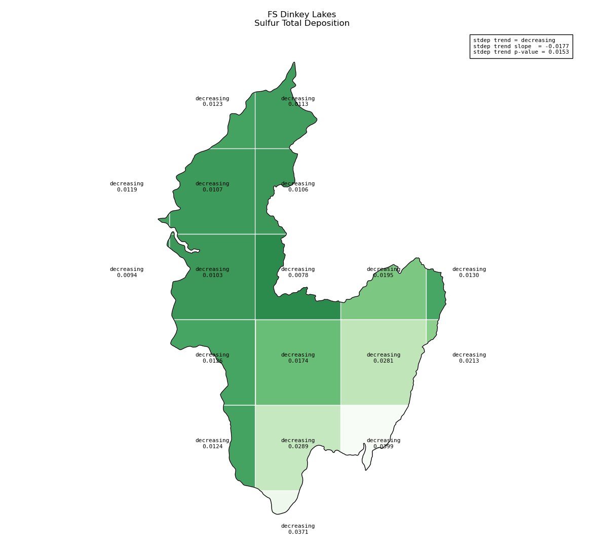 Annual averages for sulfur total deposition are calculated by clipping the gridded stdep data to the wilderness boundary, multiplying the total deposition value for each grid cell by its area inside the wilderness, summing stdep for all cells, then dividing that sum by the total area of the wilderness. These annual averages are then used to determine sulfur deposition trend inside the wilderness. Decreasing sulfur deposition indicates an improvement in wilderness character.