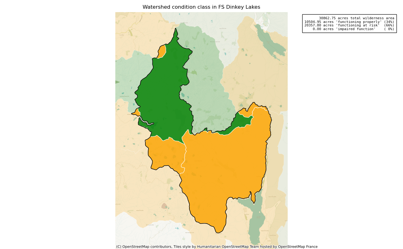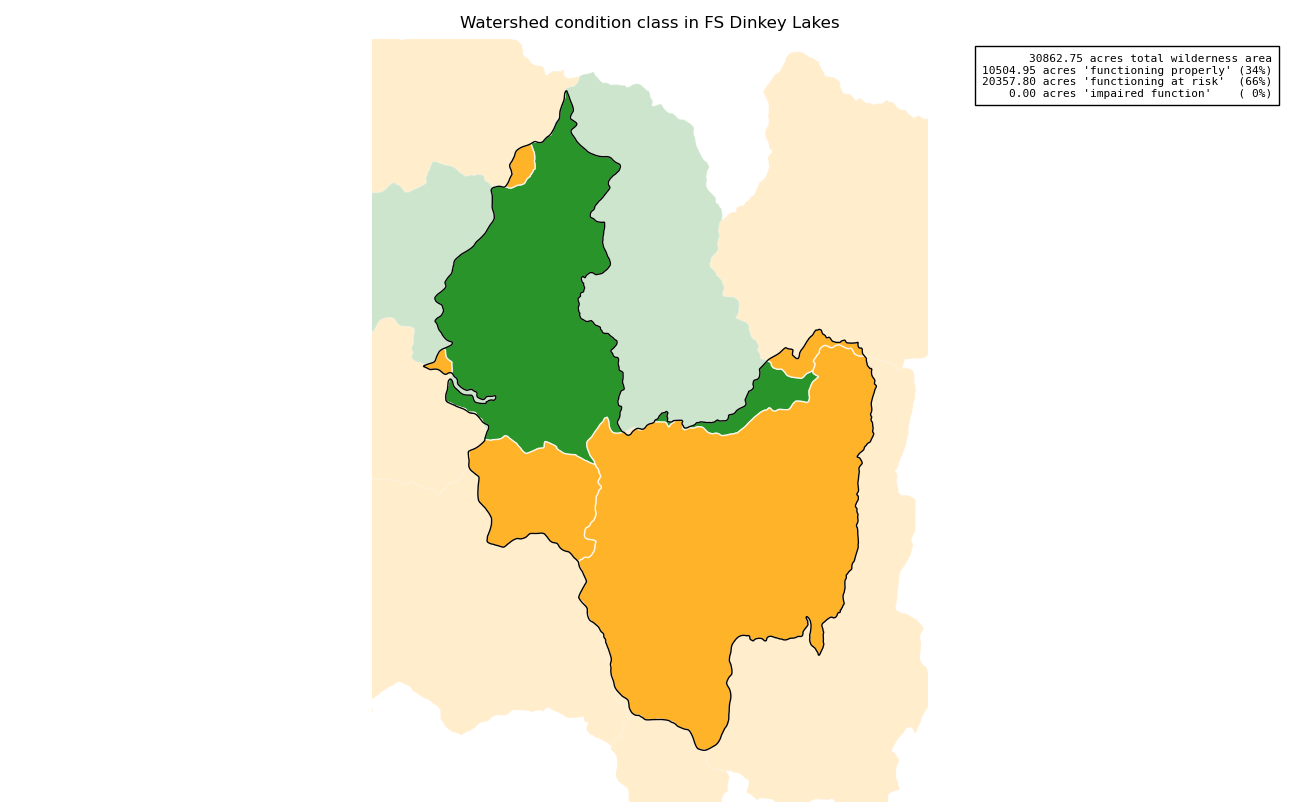 The Watershed Condition Class measure is intended to monitor changes in the watershed functions supporting aquatic ecosystems inside the wilderness. USFS Watershed Condition Class is derived from 12 different indicators -- water quality, water quantity, aquatic habitat, aquatic biota, roads and trails, soils, riparian/wetland vegetation, fire regime or wildfire, forest cover, rangeland vegetation, terrestrial invasive species, and forest health -- resulting in a single score describing watershed integrity for each watershed: