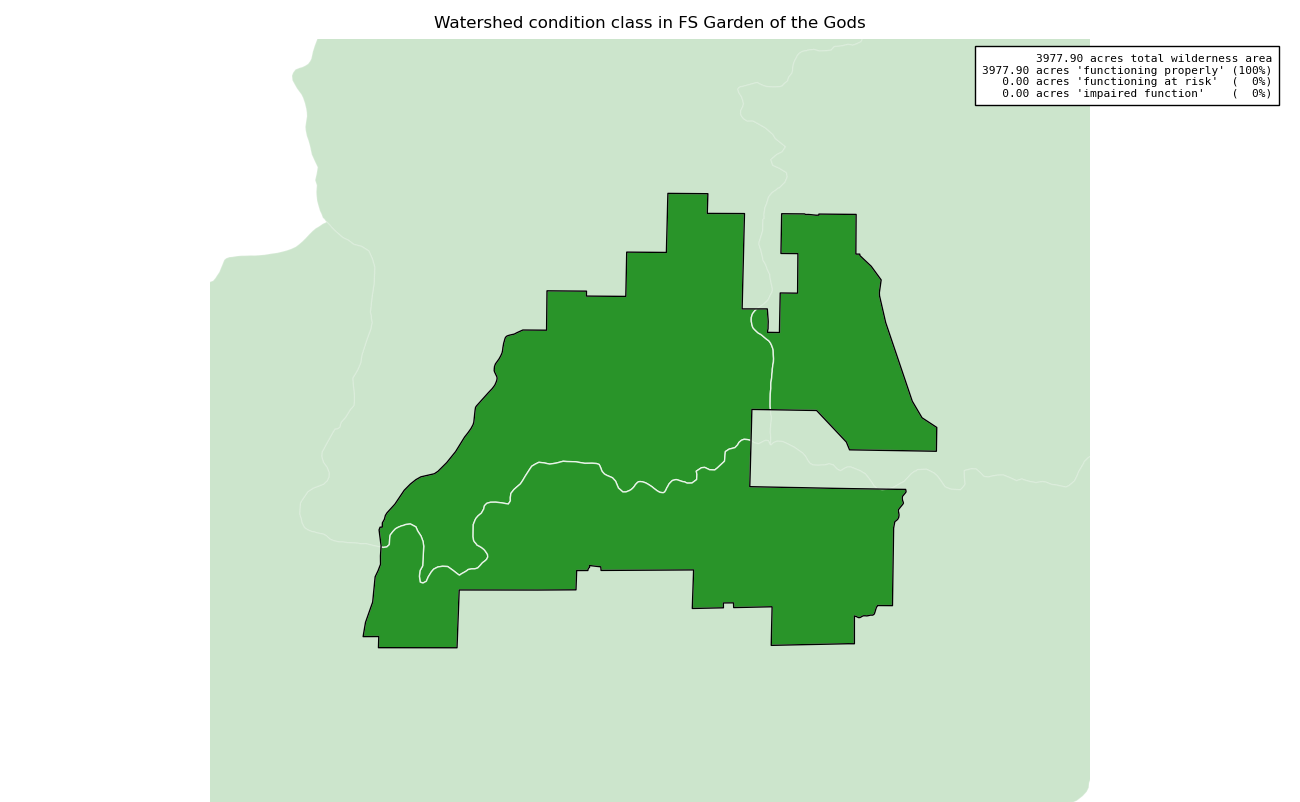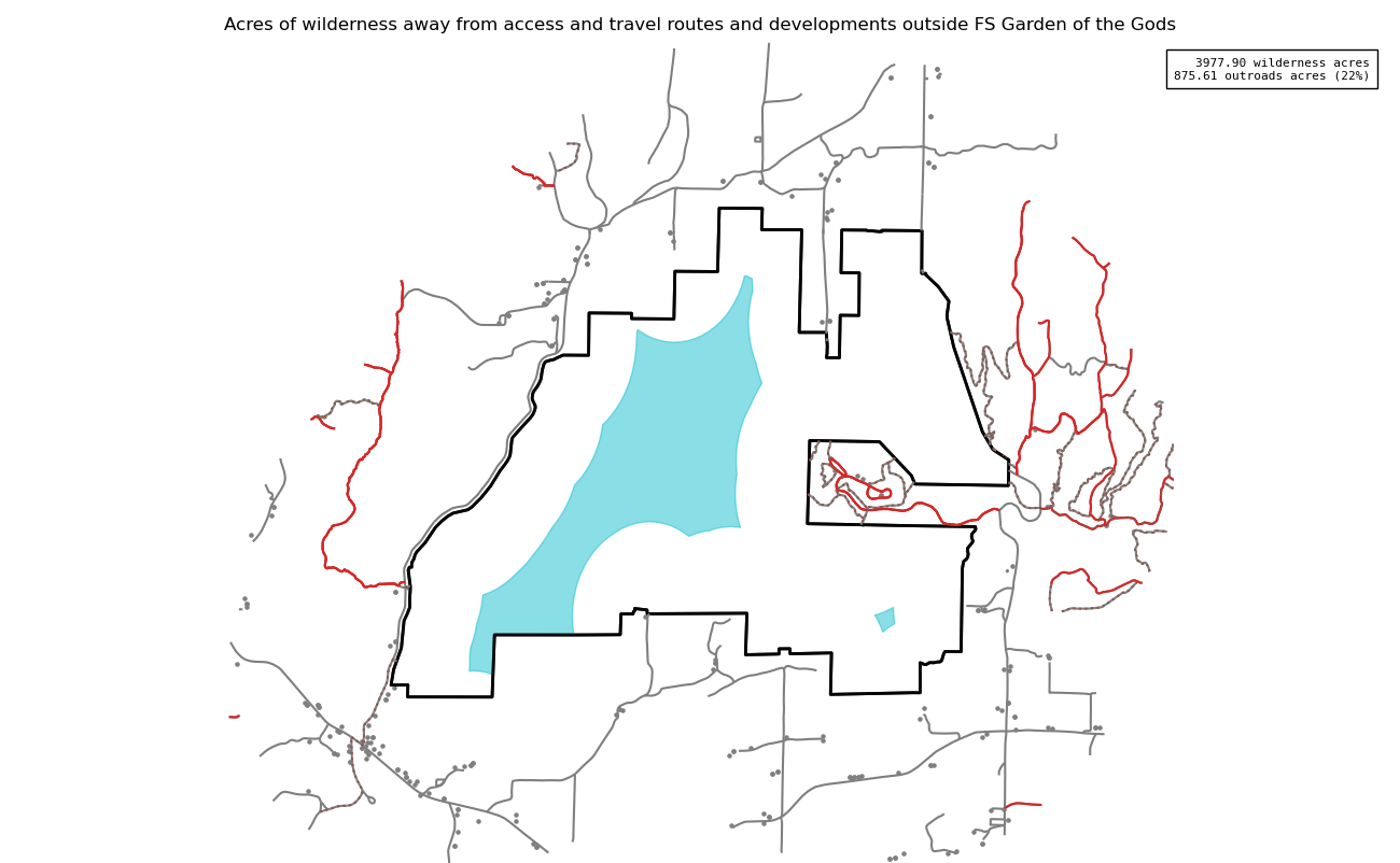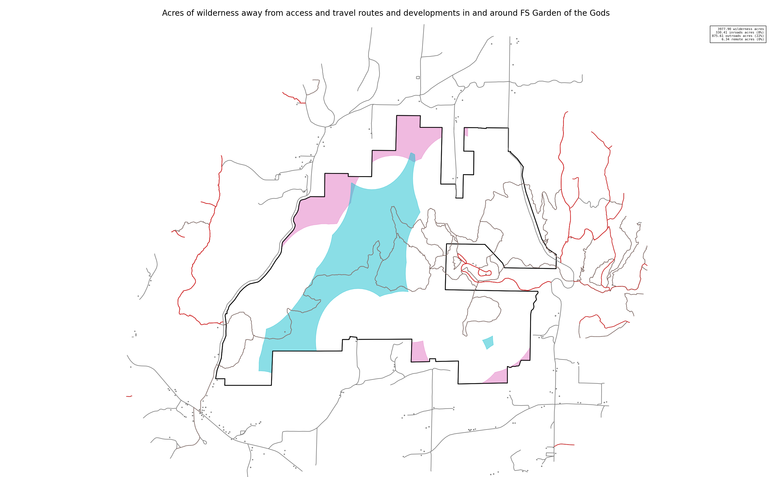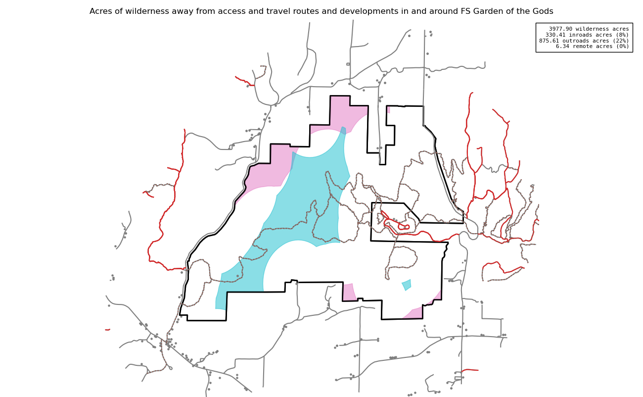 The 3978 acre Garden of the Gods was designated as a National Wilderness on or around 1990-01-01, and Wilderness Character Monitoring baseline work was done in 2025. The maps in this section are made with USFS data, with terrain maps from the internet.