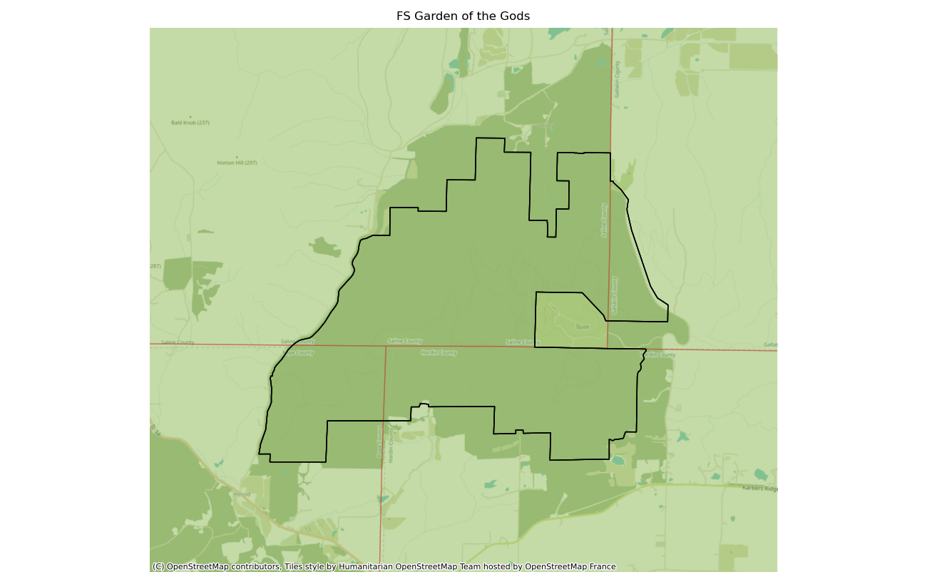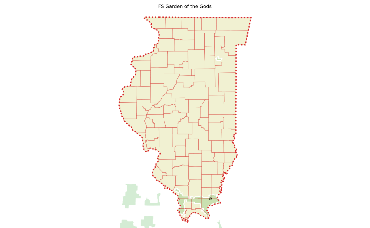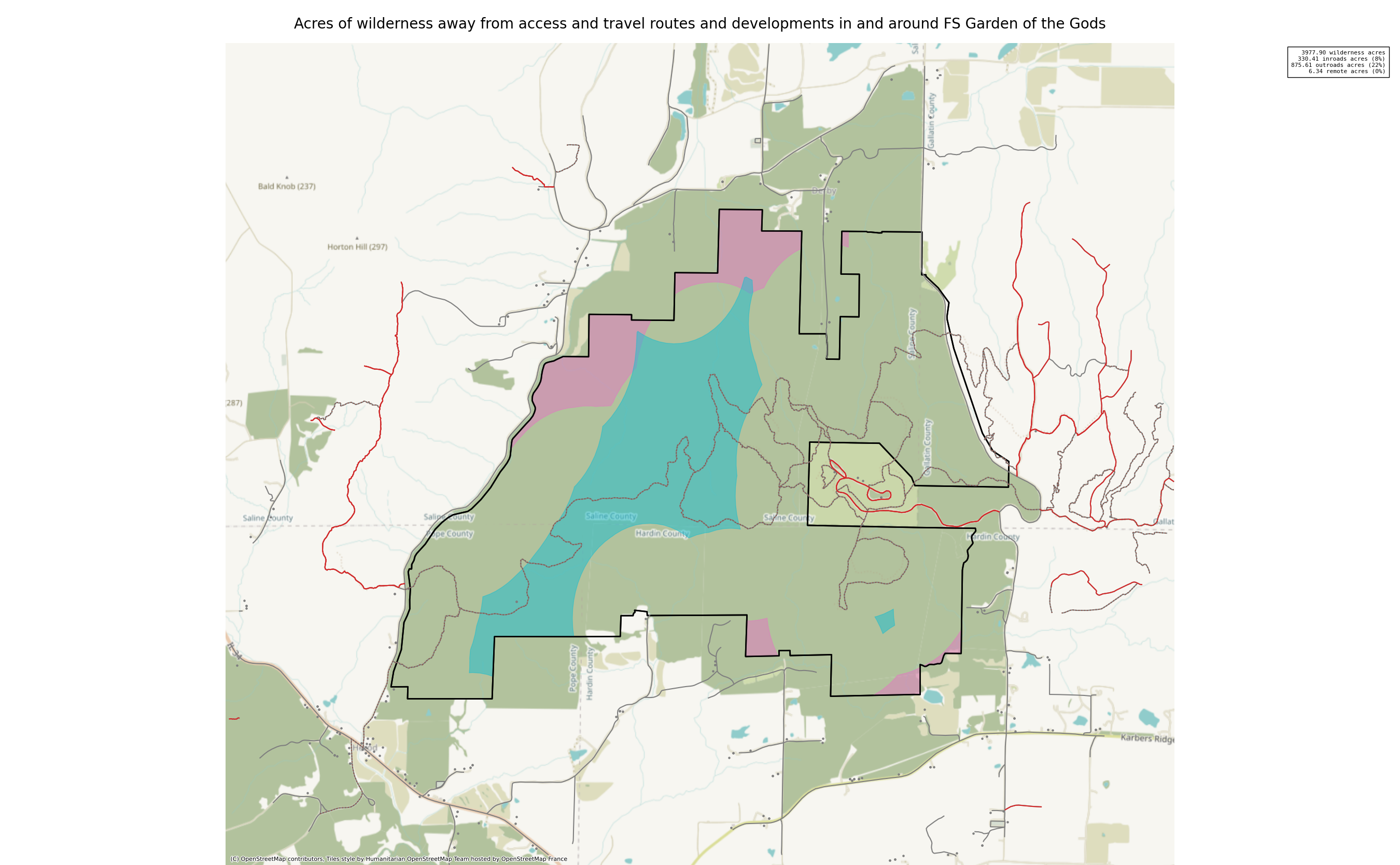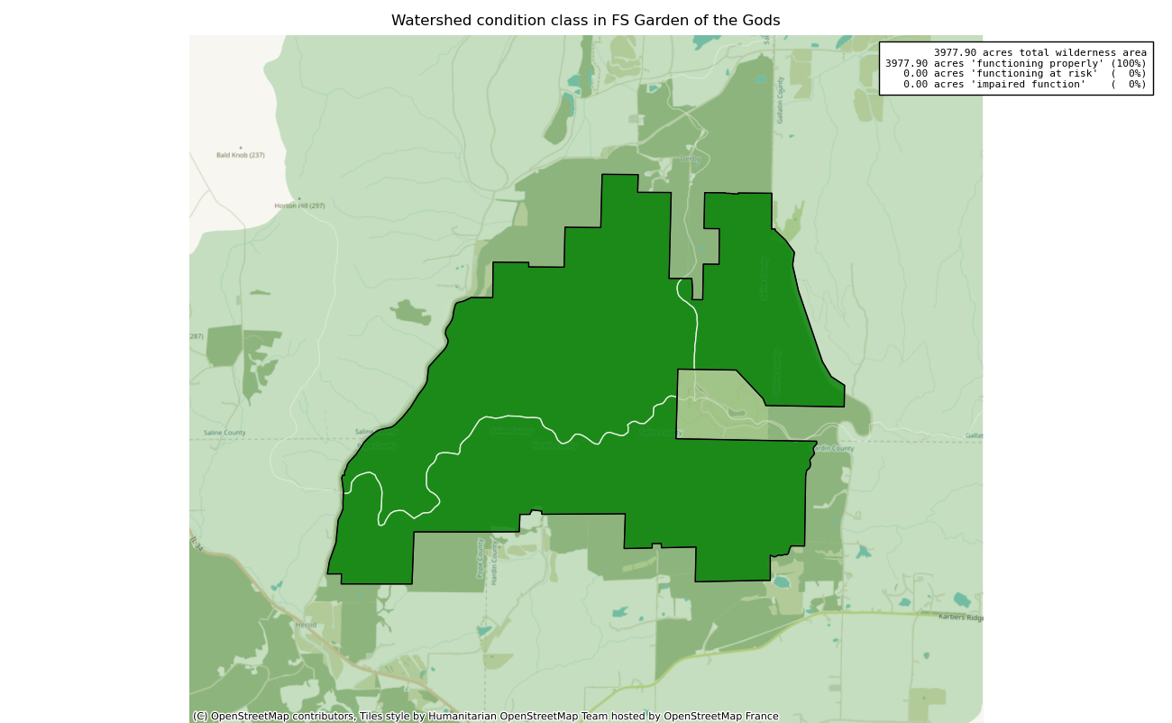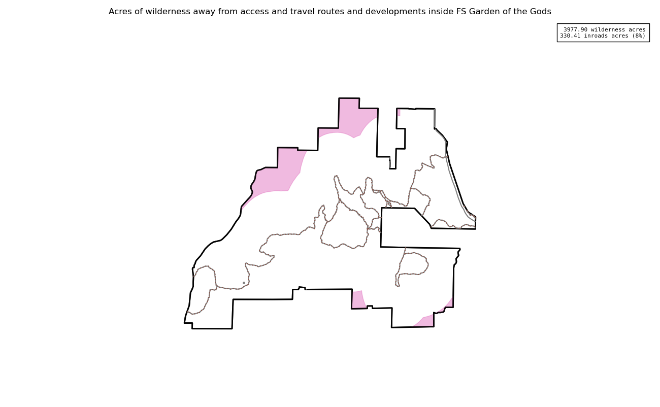 The 3978 acre Garden of the Gods was designated as a National Wilderness on or around 1990-01-01, and Wilderness Character Monitoring baseline work was done in 2025. The maps in this section are made with USFS data, with terrain maps from the internet.