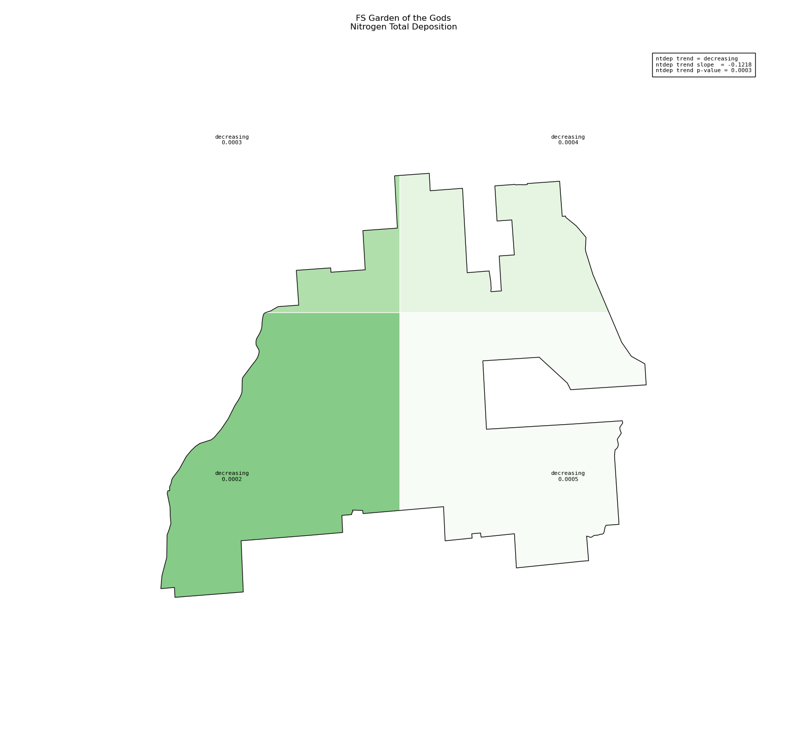 Annual averages for nitrogen total deposition are calculated by clipping the gridded ntdep data to the wilderness boundary, multiplying the total deposition value for each grid cell by its area inside the wilderness, summing ntdep for all cells, then dividing that sum by the total area of the wilderness. These annual averages are then used to determine nitrogen deposition trend inside the wilderness. Decreasing nitrogen deposition indicates an improvement in wilderness character.