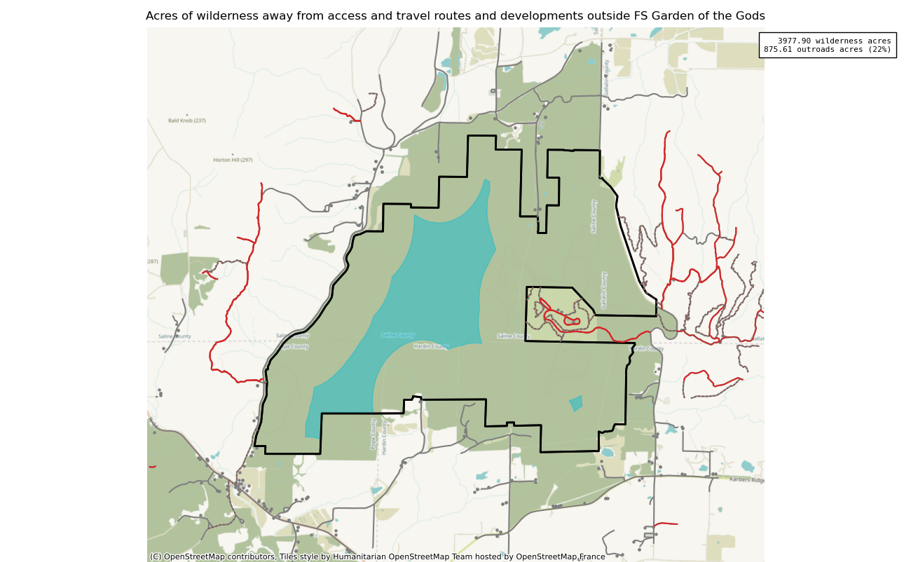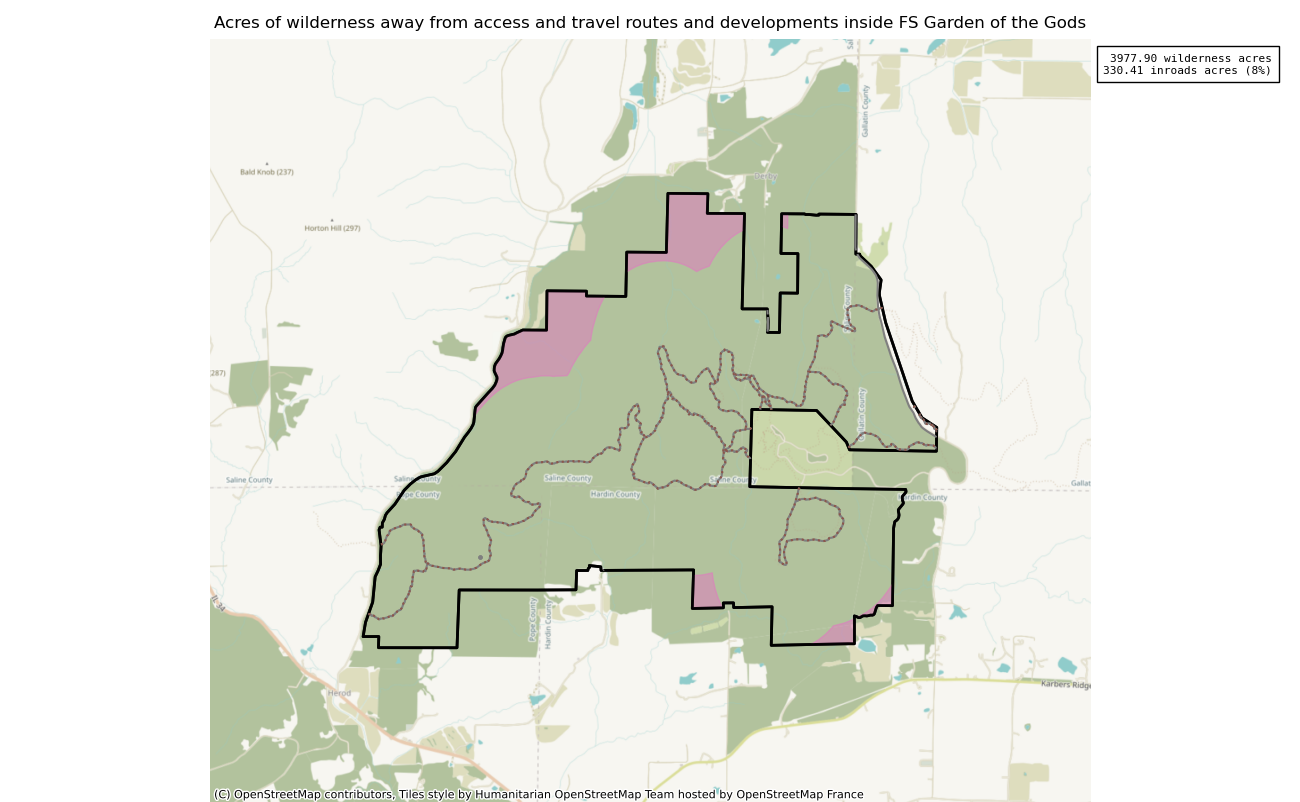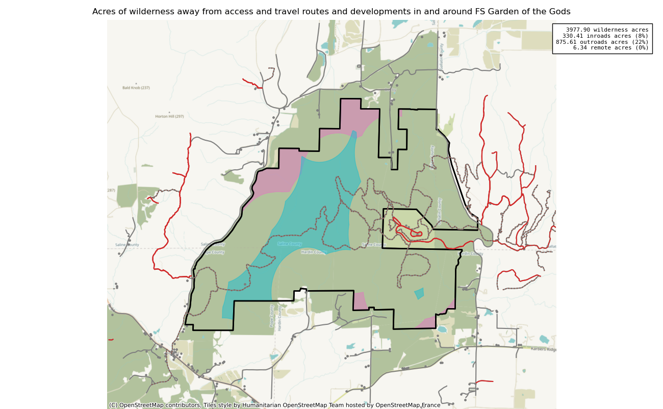 Note that roads and developments located exactly on the wilderness boundary are included in this measure. Spatial data resolution and accuracy can vary greatly across sources, and determining the intersection of a road represented by a single infinitely thin line can produce incorrect results. These should always be verified locally and corrected.
