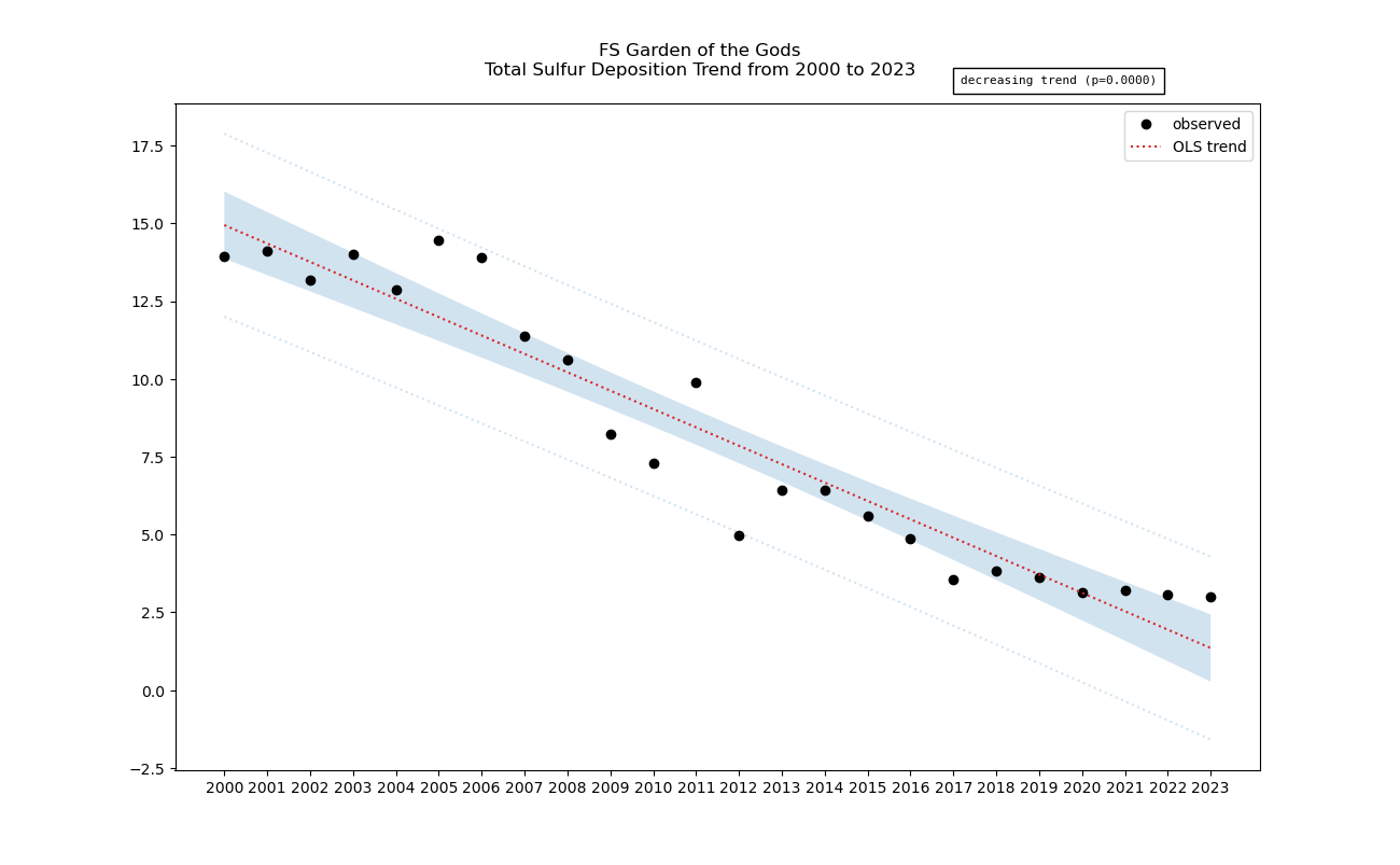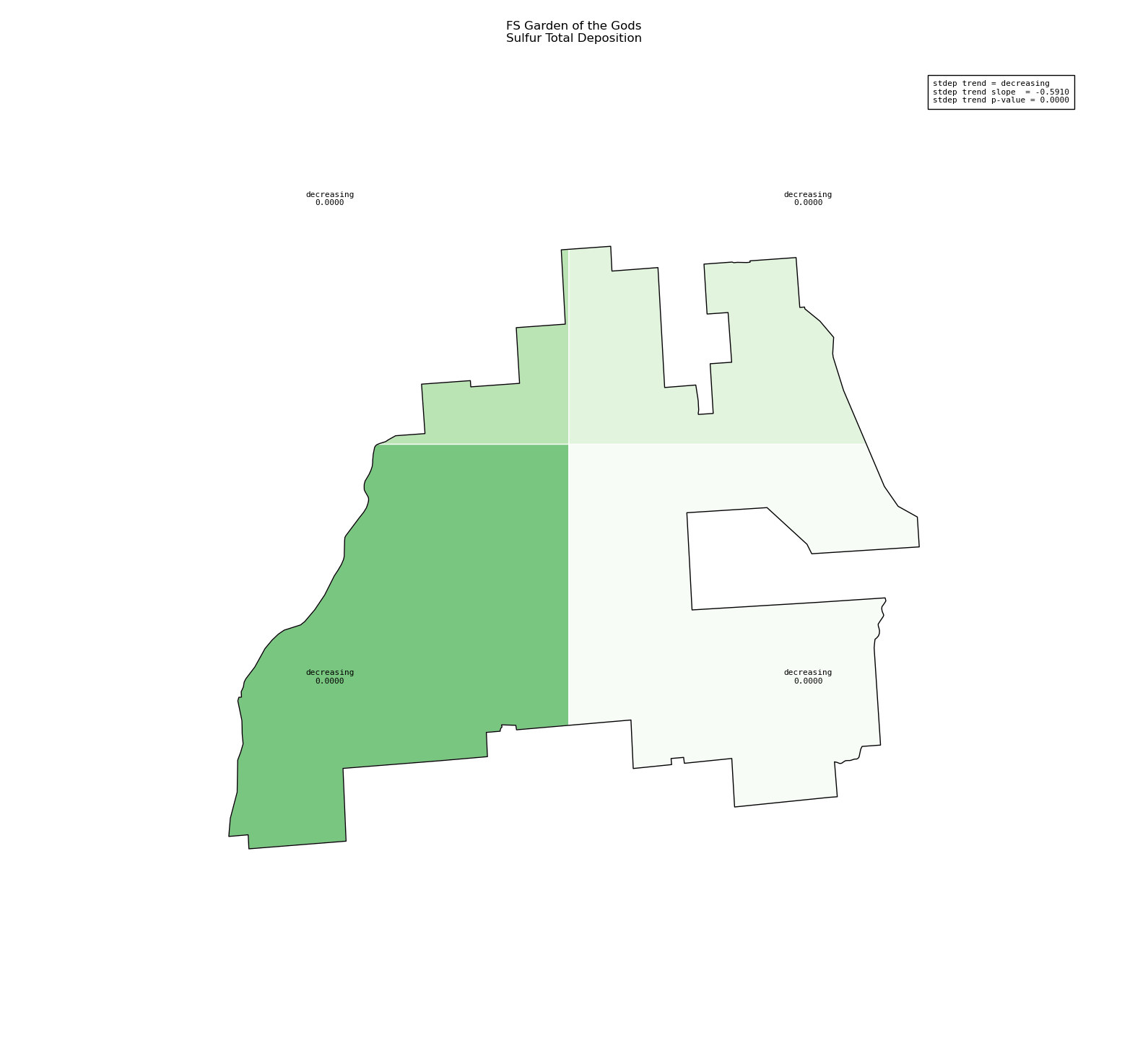 Annual averages for sulfur total deposition are calculated by clipping the gridded stdep data to the wilderness boundary, multiplying the total deposition value for each grid cell by its area inside the wilderness, summing stdep for all cells, then dividing that sum by the total area of the wilderness. These annual averages are then used to determine sulfur deposition trend inside the wilderness. Decreasing sulfur deposition indicates an improvement in wilderness character.