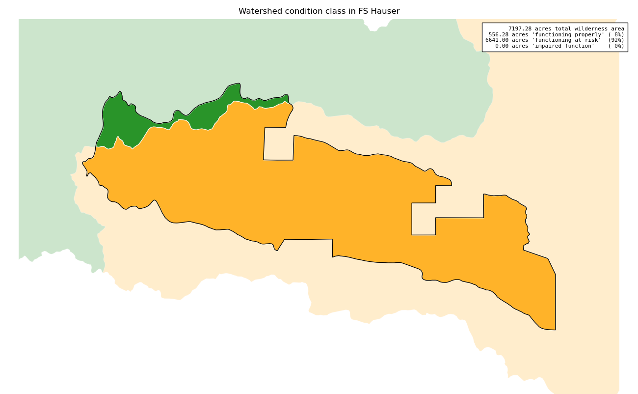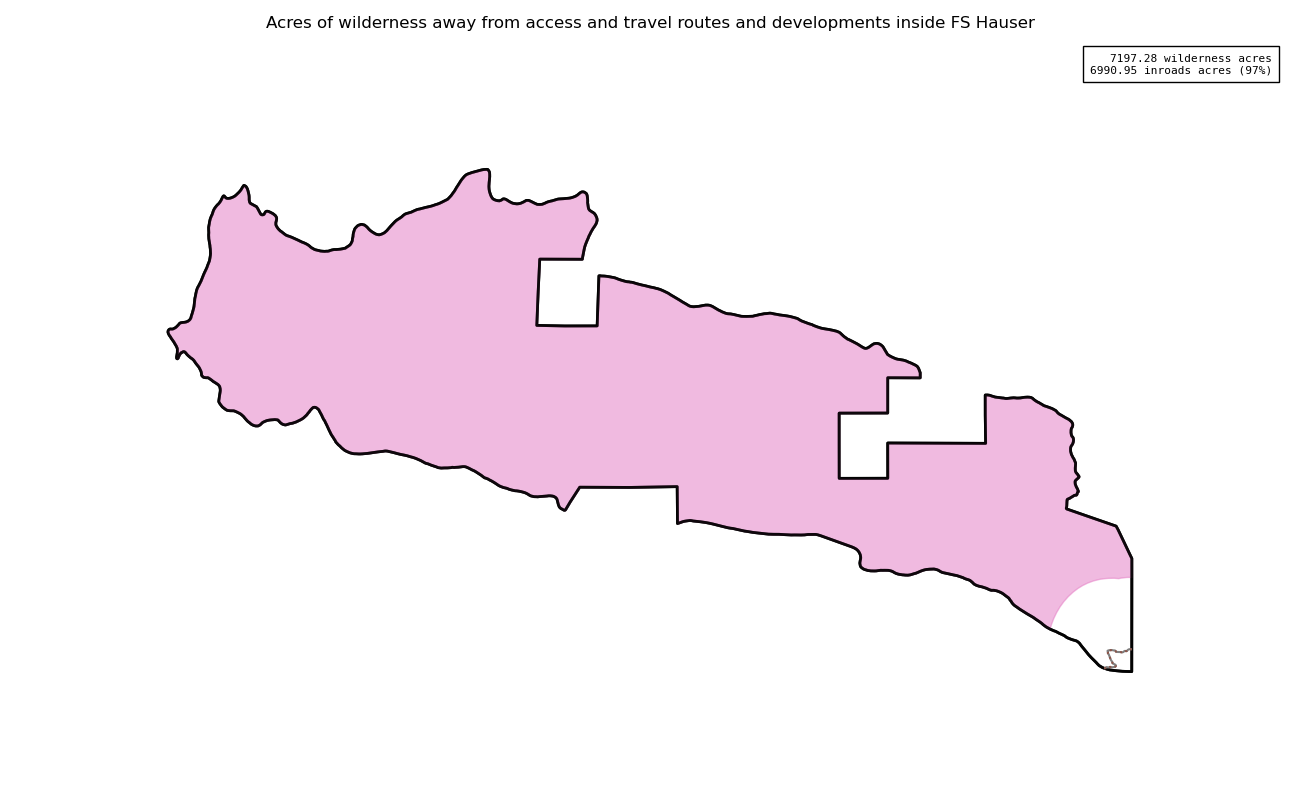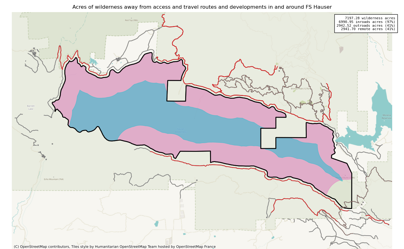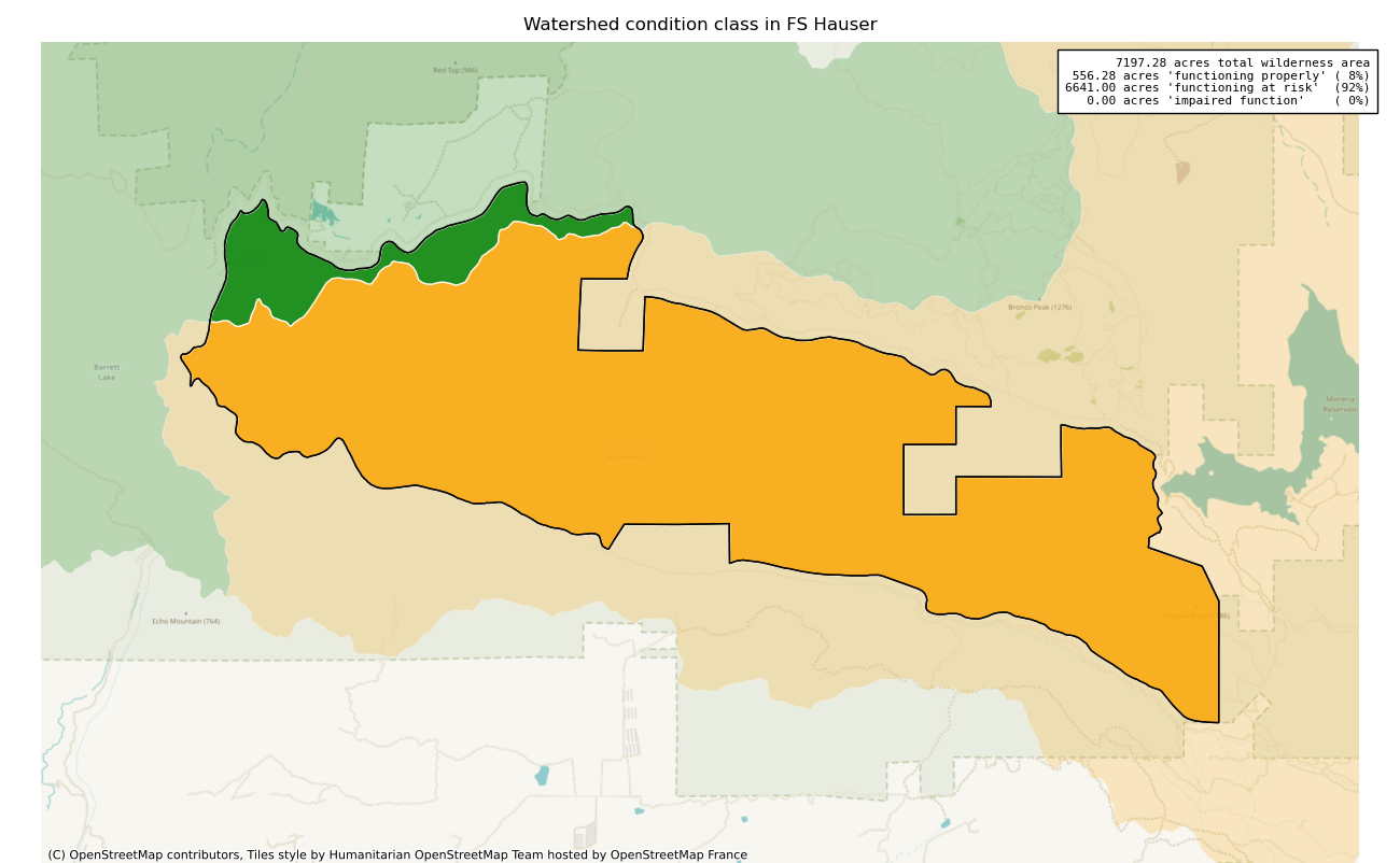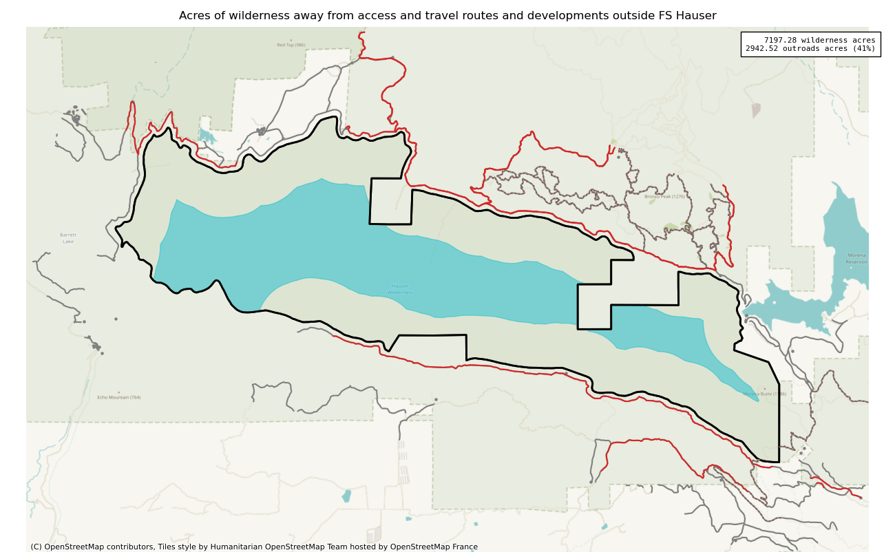 The 7197 acre Hauser was designated as a National Wilderness on or around 1984-01-01, and Wilderness Character Monitoring baseline work was done in 2025. The maps in this section are made with USFS data, with terrain maps from the internet.