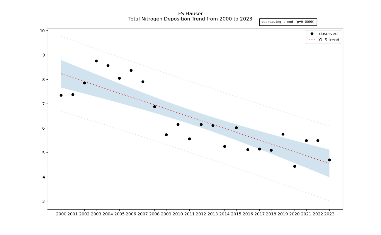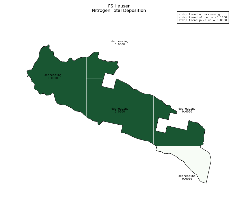 Annual averages for nitrogen total deposition are calculated by clipping the gridded ntdep data to the wilderness boundary, multiplying the total deposition value for each grid cell by its area inside the wilderness, summing ntdep for all cells, then dividing that sum by the total area of the wilderness. These annual averages are then used to determine nitrogen deposition trend inside the wilderness. Decreasing nitrogen deposition indicates an improvement in wilderness character.