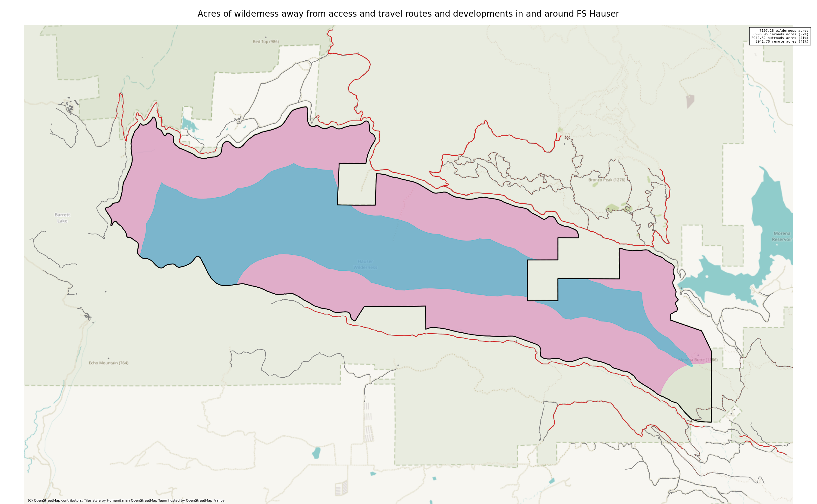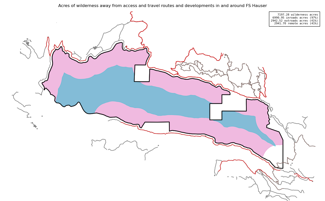Note that roads and developments located exactly on the wilderness boundary are included in this measure. Spatial data resolution and accuracy can vary greatly across sources, and determining the intersection of a road represented by a single infinitely thin line can produce incorrect results. These should always be verified locally and corrected.