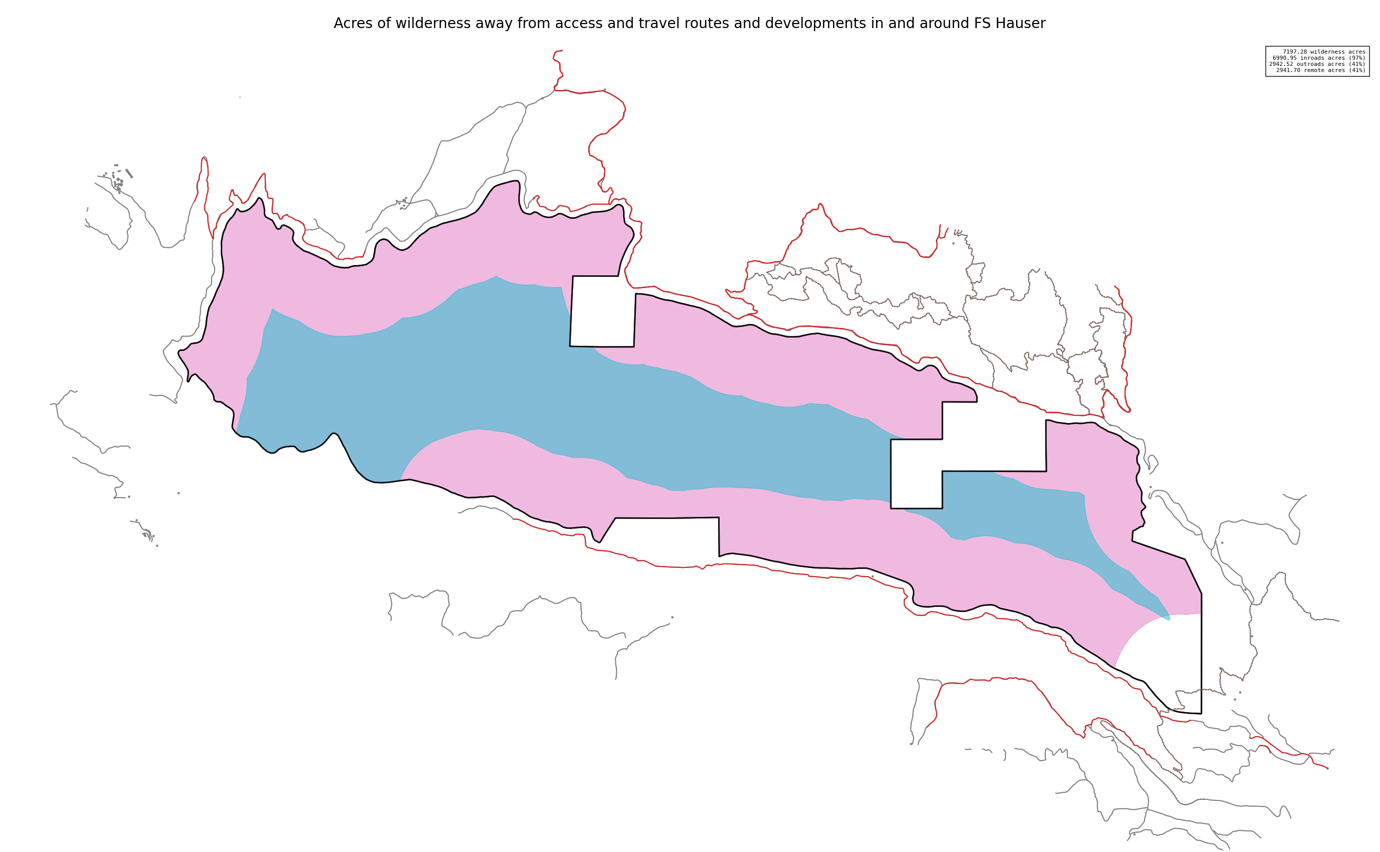 Note that roads and developments located exactly on the wilderness boundary are included in the 'remoteness away from development outside wilderness' measure below. Spatial data resolution and accuracy can vary greatly across sources, and determining the intersection of a road represented by a single infinitely thin line can produce incorrect results. These should always be verified locally and corrected.