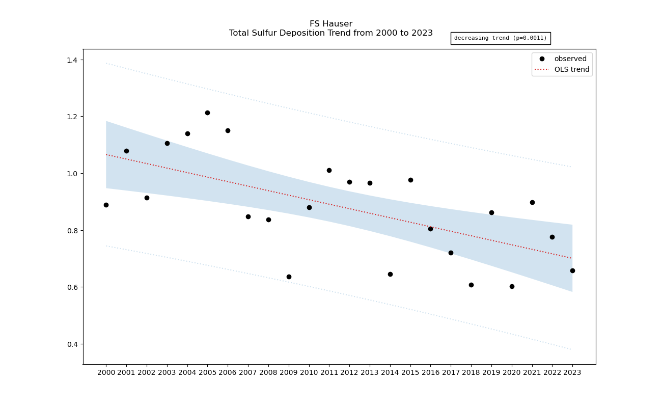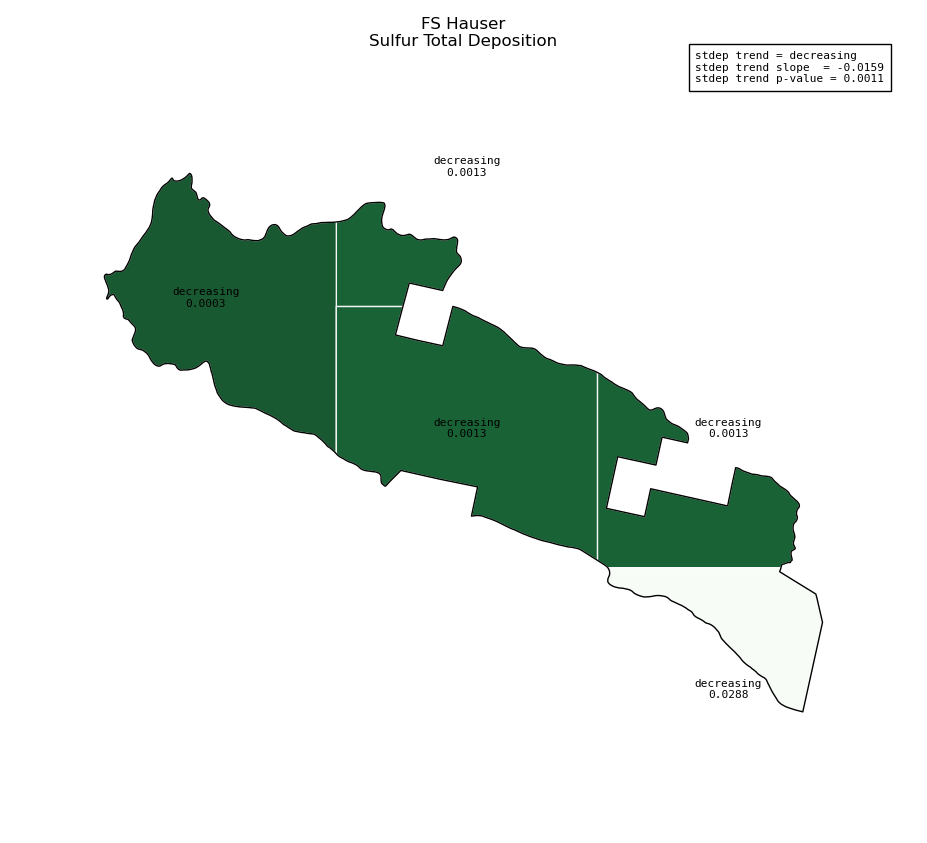 Annual averages for sulfur total deposition are calculated by clipping the gridded stdep data to the wilderness boundary, multiplying the total deposition value for each grid cell by its area inside the wilderness, summing stdep for all cells, then dividing that sum by the total area of the wilderness. These annual averages are then used to determine sulfur deposition trend inside the wilderness. Decreasing sulfur deposition indicates an improvement in wilderness character.