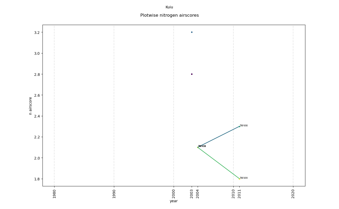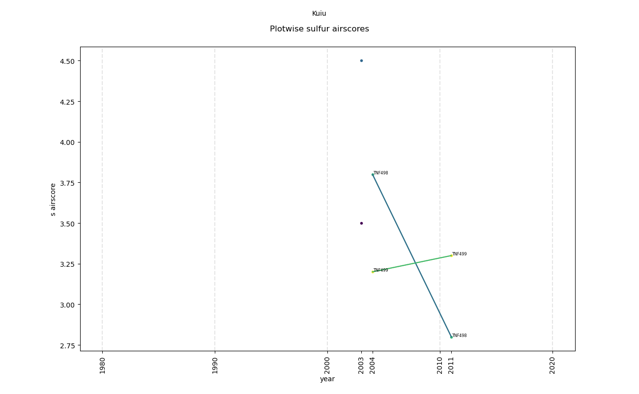 This measure assesses the trend in air pollution scores for nitrogen and sulfur derived from the presence and abundance of sensitive lichen species, based on analyses of local biomonitoring data. Air pollution scores are calculated for each wilderness biomonitoring plot by surveying epiphytic lichen species with varying sensitivities to nitrogen and sulfur air pollution.
