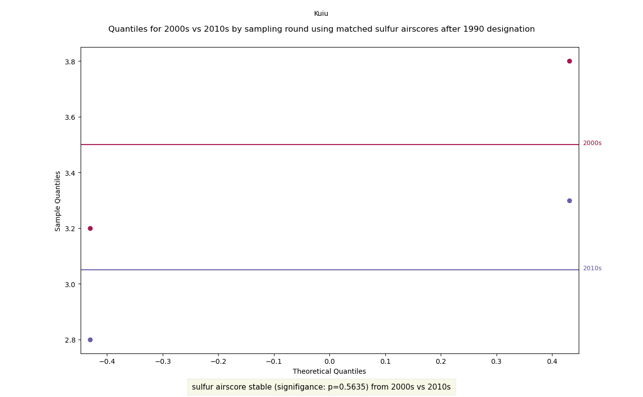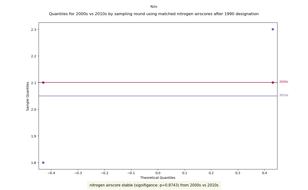 Once air scores for all plots are obtained, these are averaged across years. The earliest field collection date after the year of wilderness designation are compared to the most recent field collection date to complete this analysis. In instances where a wilderness has multiple sampling dates across a 10-year period, values from the earliest 10-year period can be compared with the most recent 10-year period.