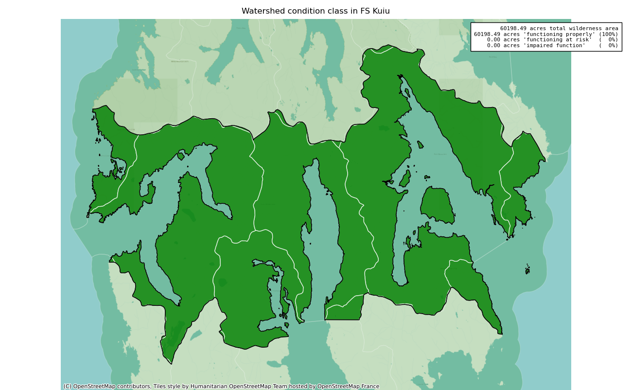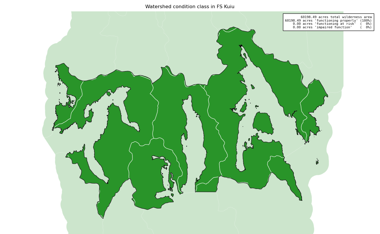 The Watershed Condition Class measure is intended to monitor changes in the watershed functions supporting aquatic ecosystems inside the wilderness. USFS Watershed Condition Class is derived from 12 different indicators -- water quality, water quantity, aquatic habitat, aquatic biota, roads and trails, soils, riparian/wetland vegetation, fire regime or wildfire, forest cover, rangeland vegetation, terrestrial invasive species, and forest health -- resulting in a single score describing watershed integrity for each watershed: