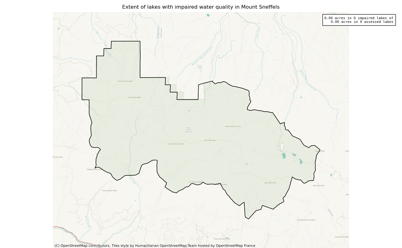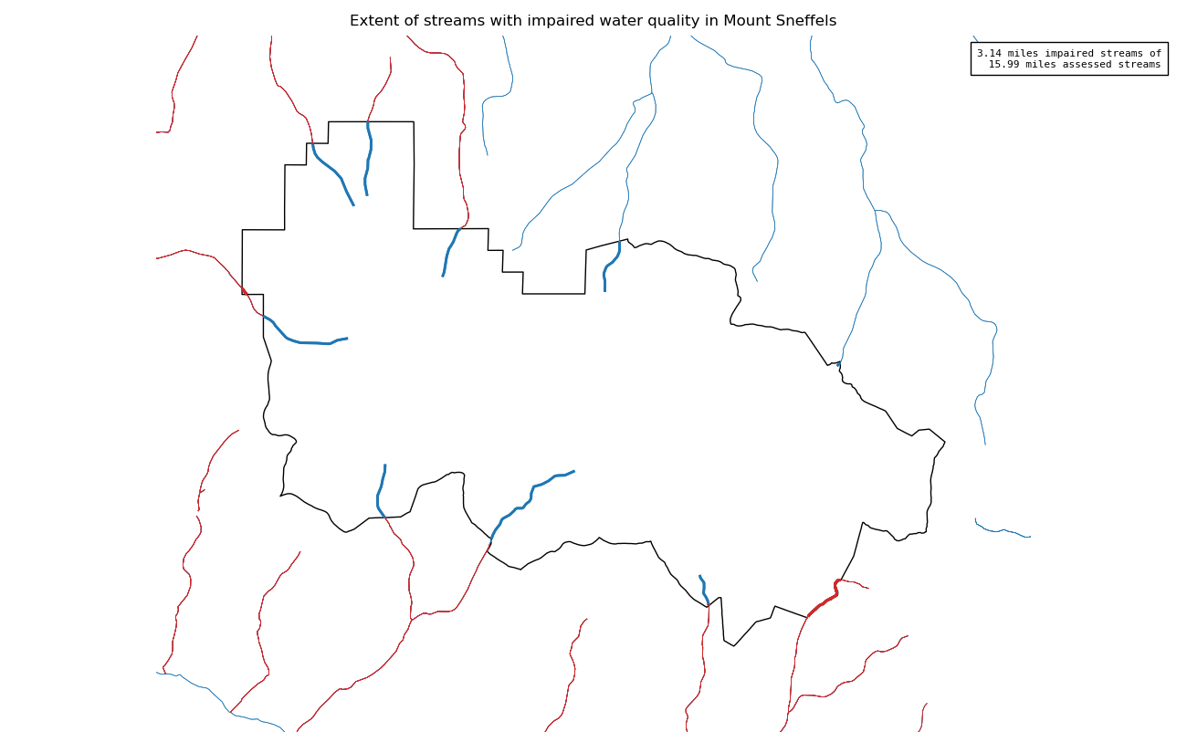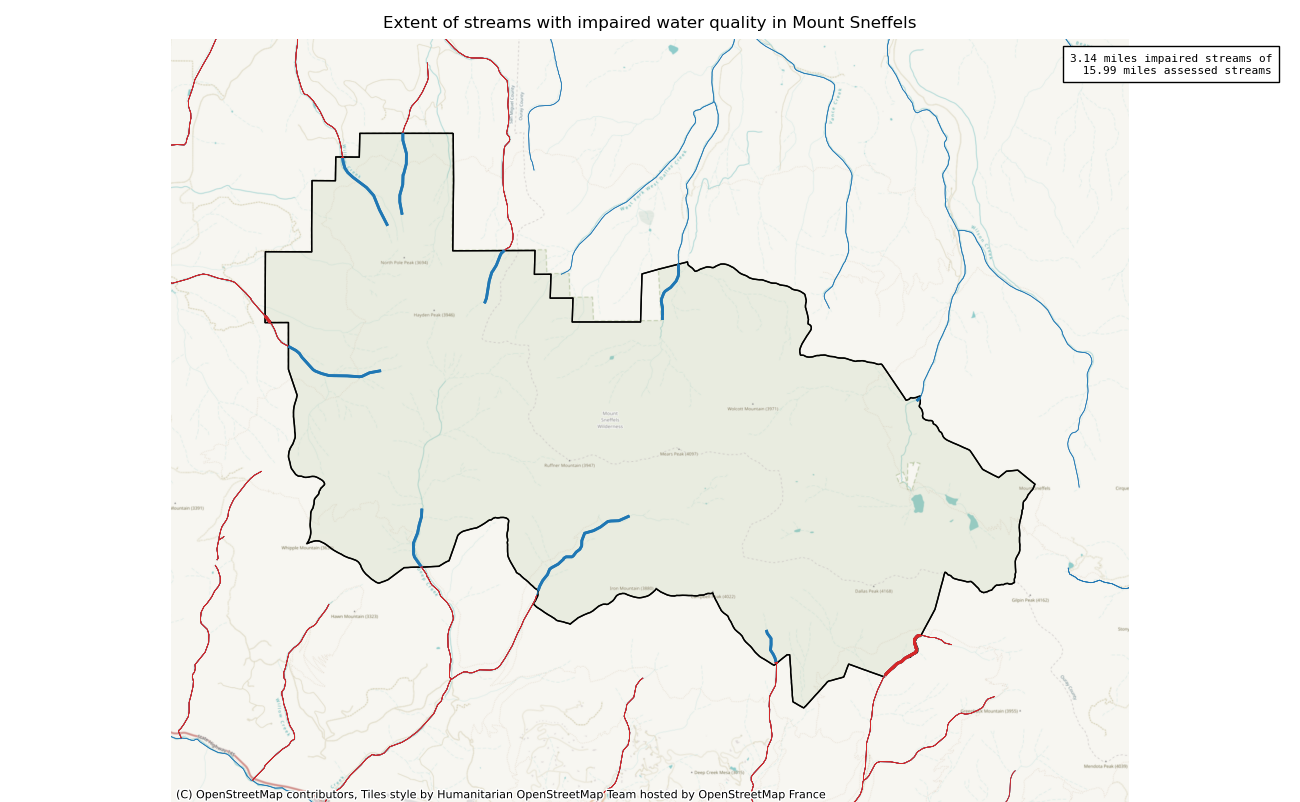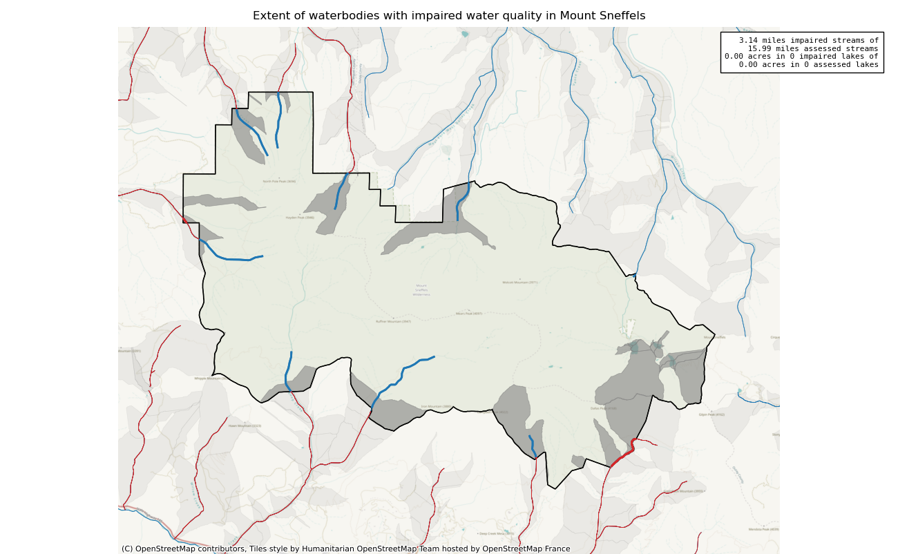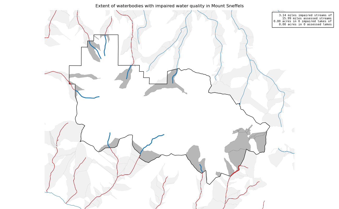 This measure assesses the miles of streams or number of lakes inside wilderness with impaired water quality, based on national or state 303(d) list of impaired water bodies or local monitoring data. Water quality directly influences the health of plant and animal communities. While many headwater wilderness watersheds have good water quality, degradation from historical activities such as mining or from upstream developments outside a wilderness may impact water quality in wilderness.