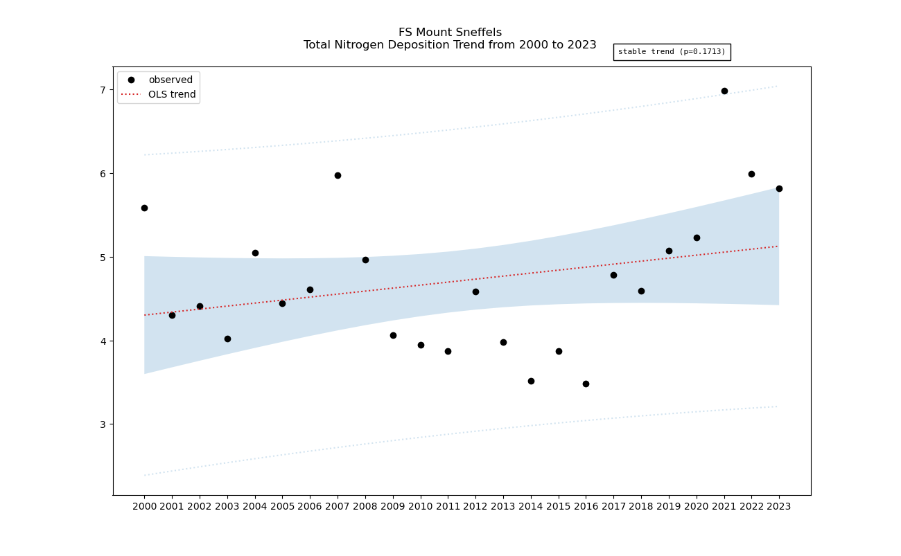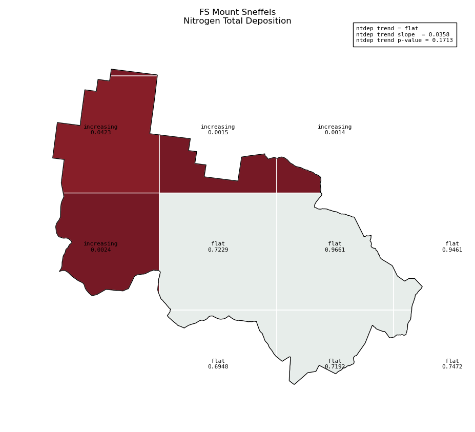 Annual averages for nitrogen total deposition are calculated by clipping the gridded ntdep data to the wilderness boundary, multiplying the total deposition value for each grid cell by its area inside the wilderness, summing ntdep for all cells, then dividing that sum by the total area of the wilderness. These annual averages are then used to determine nitrogen deposition trend inside the wilderness. Decreasing nitrogen deposition indicates an improvement in wilderness character.