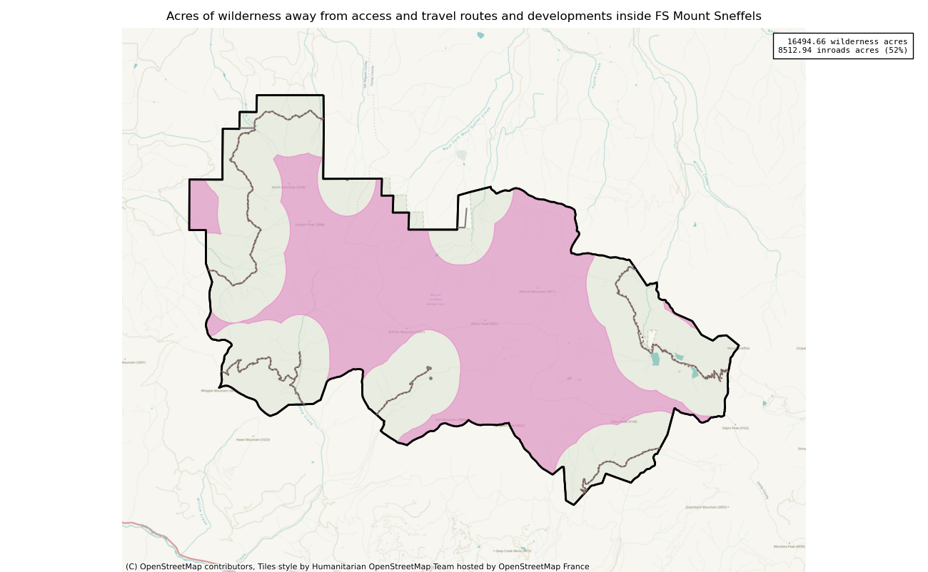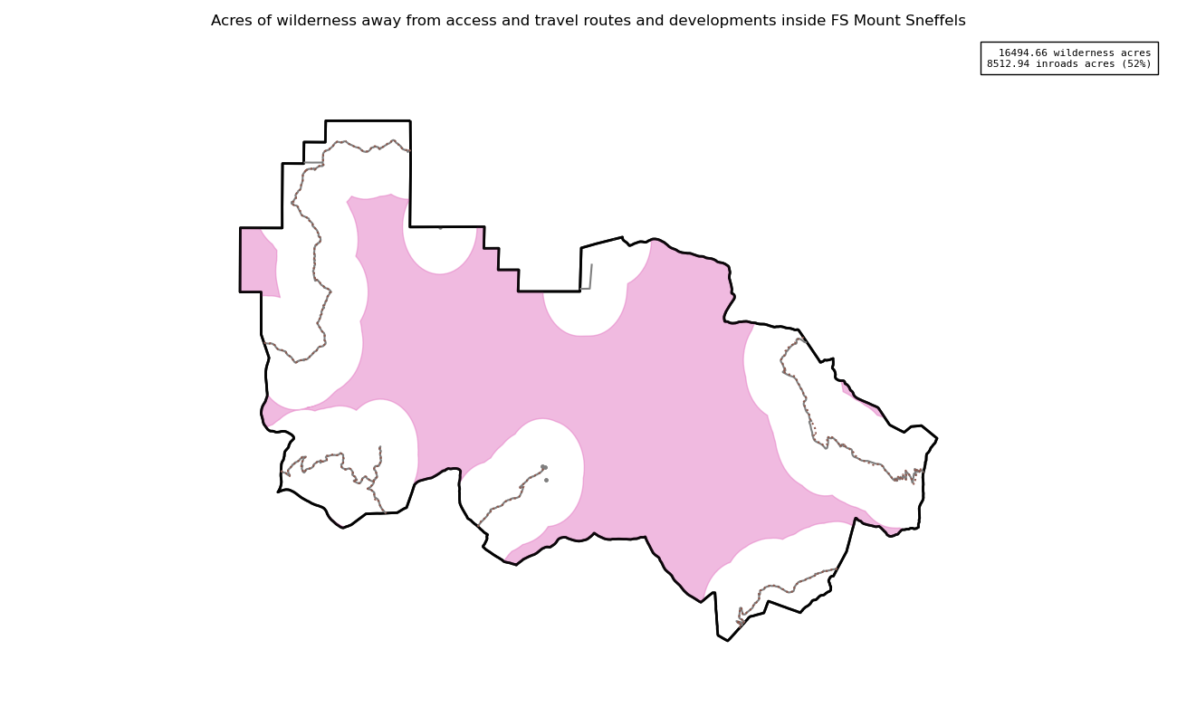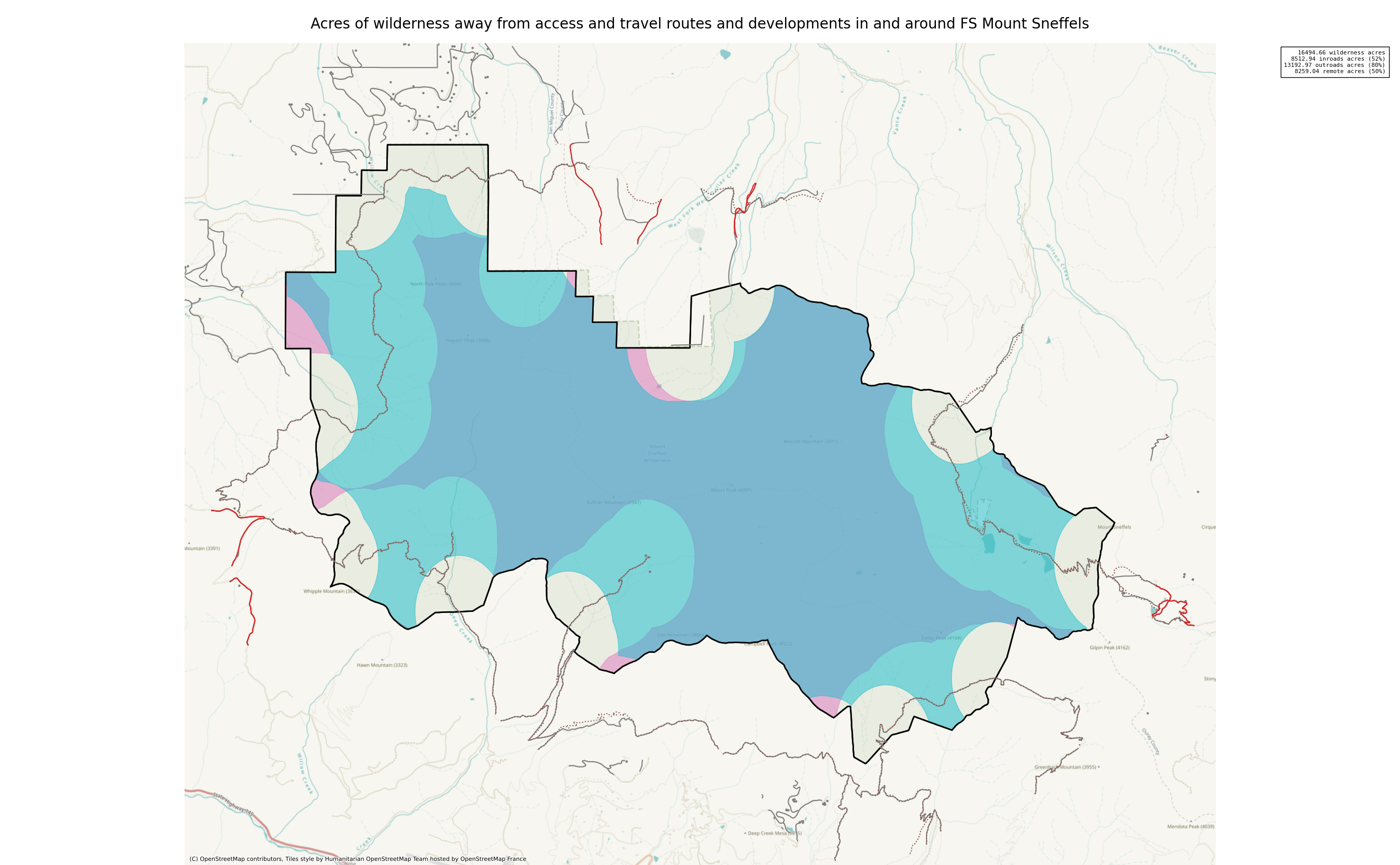 Note that roads and developments located exactly on the wilderness boundary are included in this measure. Spatial data resolution and accuracy can vary greatly across sources, and determining the intersection of a road represented by a single infinitely thin line can produce incorrect results. These should always be verified locally and corrected.