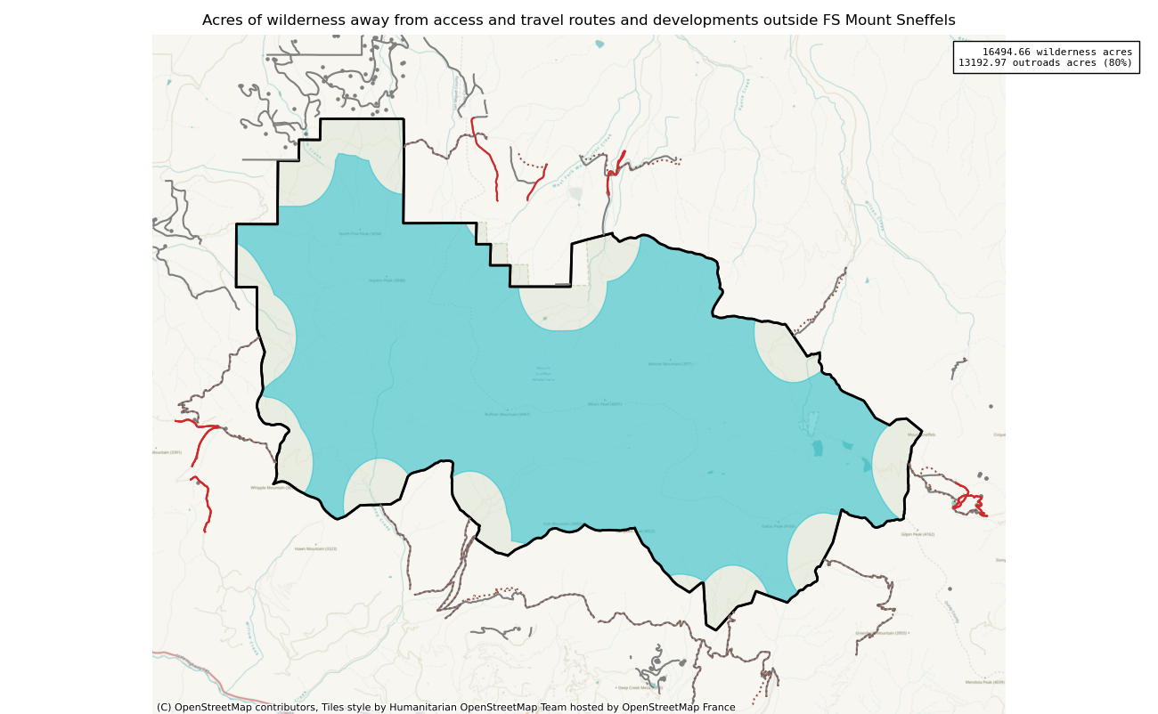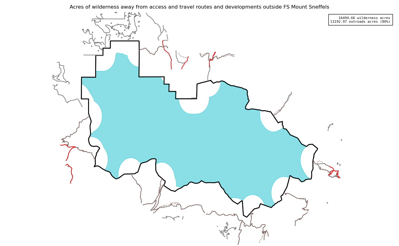 This measure assesses the total number of wilderness acres more than 1/2 mile from roads, structures, and other developments located outside a wilderness or on the boundary, including cherry-stemmed access road corridors and developed inholdings. Although legal protections and restrictions of wilderness do not extend to activities occurring outside a wilderness boundary, these activities can still degrade the wilderness experience. Signs of human activity and development outside wilderness manifest in many ways, including sounds from automobiles and off-highway vehicles on nearby travel routes, decreased visibility from air and light pollution, and visual evidence of increasing urbanization from high ridges and peaks.