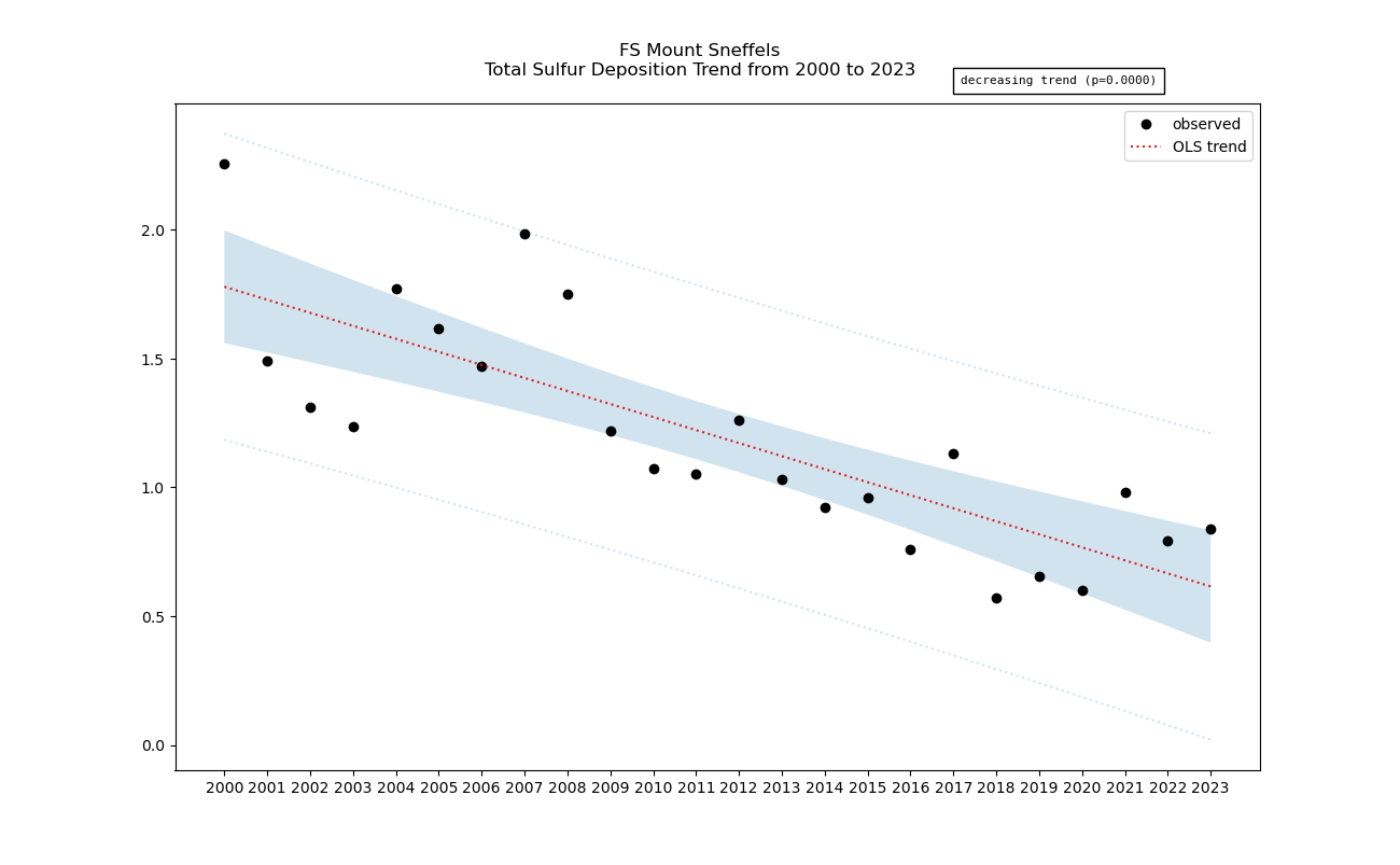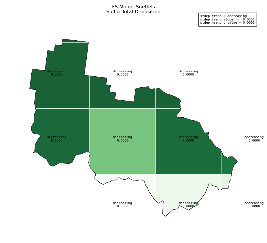 Annual averages for sulfur total deposition are calculated by clipping the gridded stdep data to the wilderness boundary, multiplying the total deposition value for each grid cell by its area inside the wilderness, summing stdep for all cells, then dividing that sum by the total area of the wilderness. These annual averages are then used to determine sulfur deposition trend inside the wilderness. Decreasing sulfur deposition indicates an improvement in wilderness character.