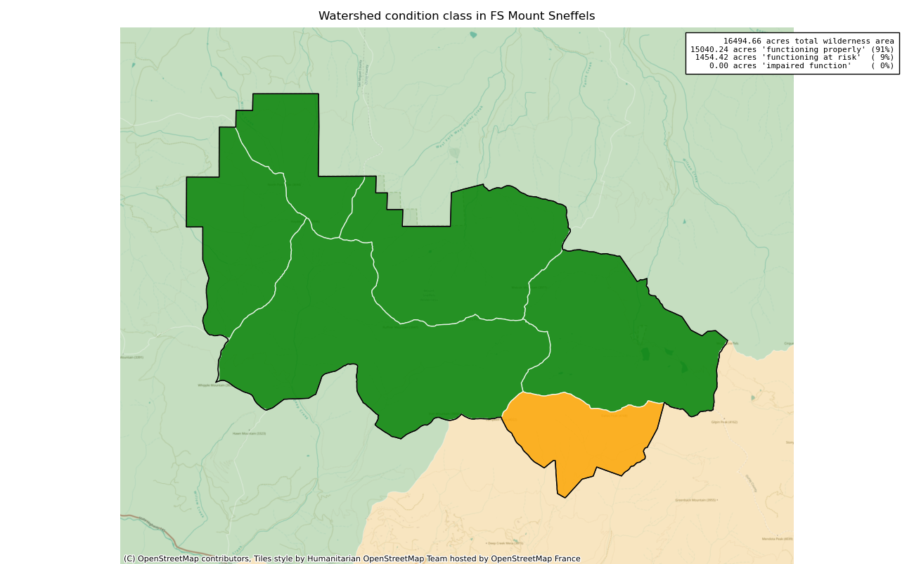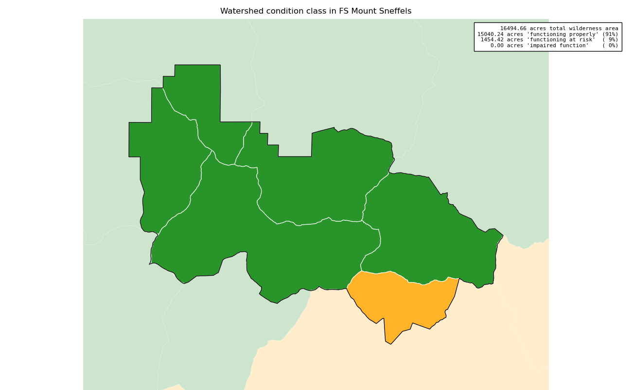 The Watershed Condition Class measure is intended to monitor changes in the watershed functions supporting aquatic ecosystems inside the wilderness. USFS Watershed Condition Class is derived from 12 different indicators -- water quality, water quantity, aquatic habitat, aquatic biota, roads and trails, soils, riparian/wetland vegetation, fire regime or wildfire, forest cover, rangeland vegetation, terrestrial invasive species, and forest health -- resulting in a single score describing watershed integrity for each watershed: