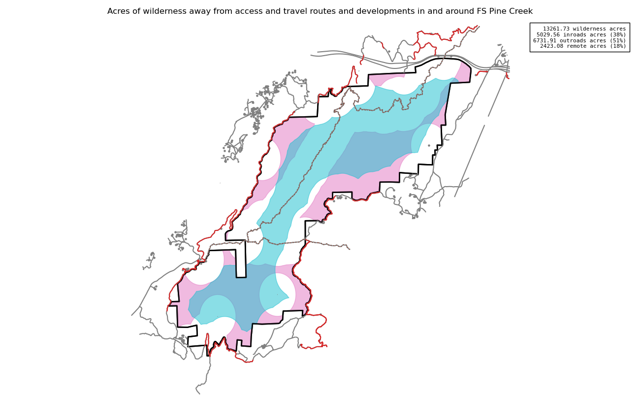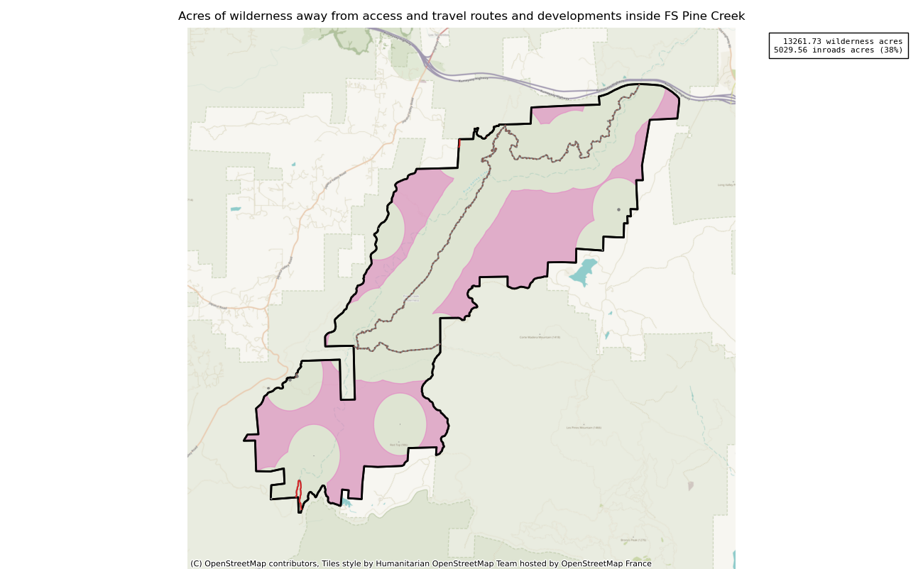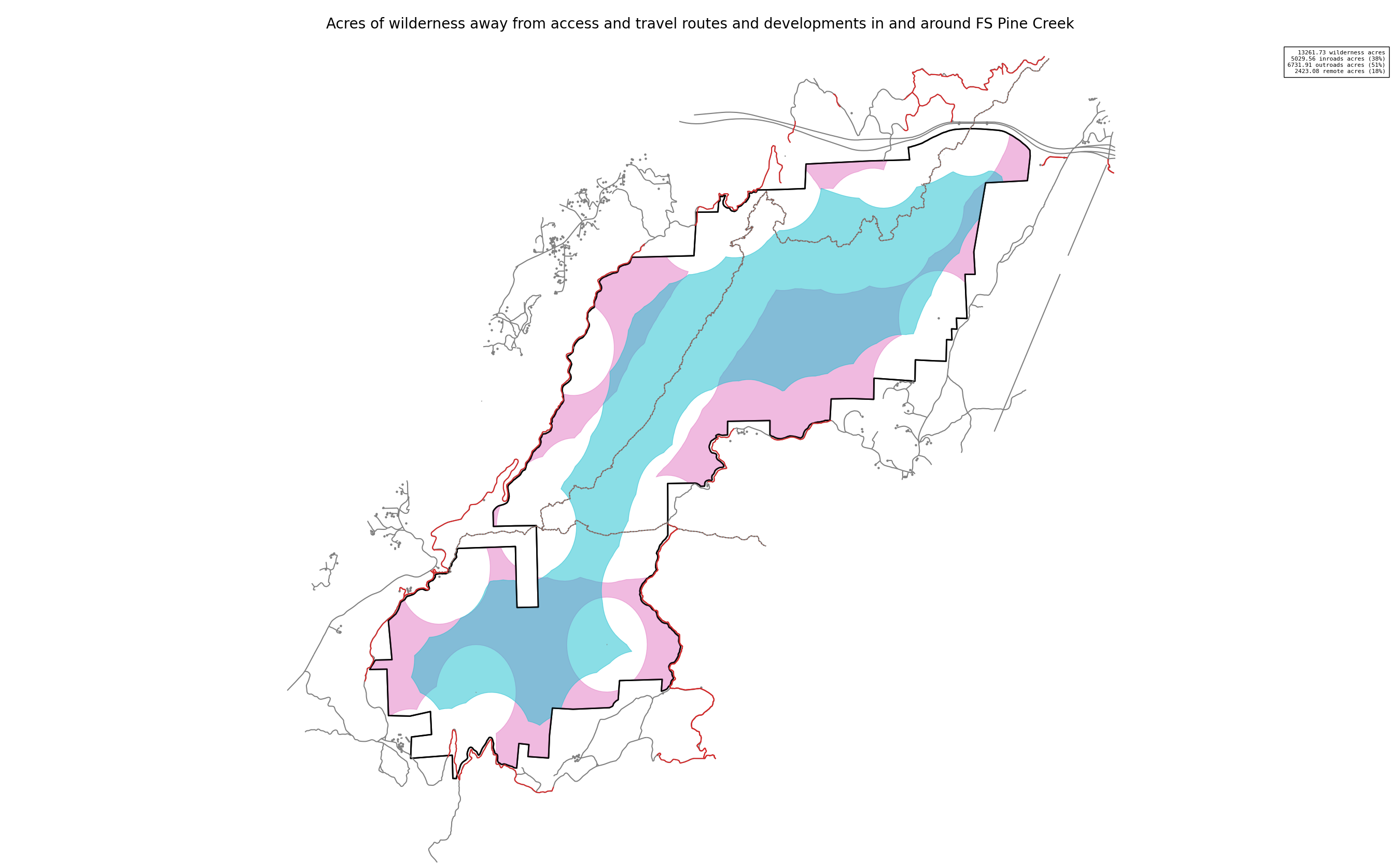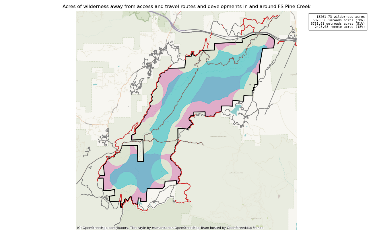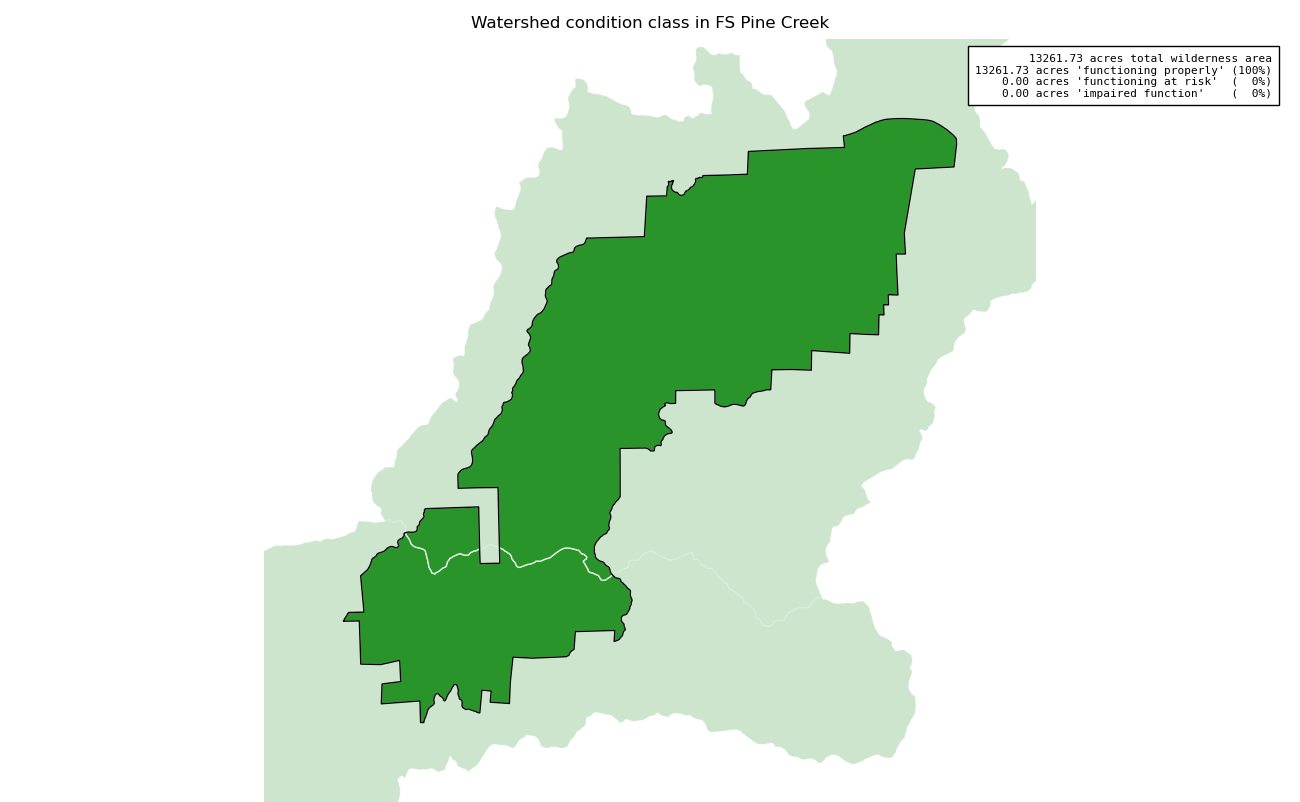 The 13262 acre Pine Creek was designated as a National Wilderness on or around 1984-01-01, and Wilderness Character Monitoring baseline work was done in 2025. The maps in this section are made with USFS data, with terrain maps from the internet.