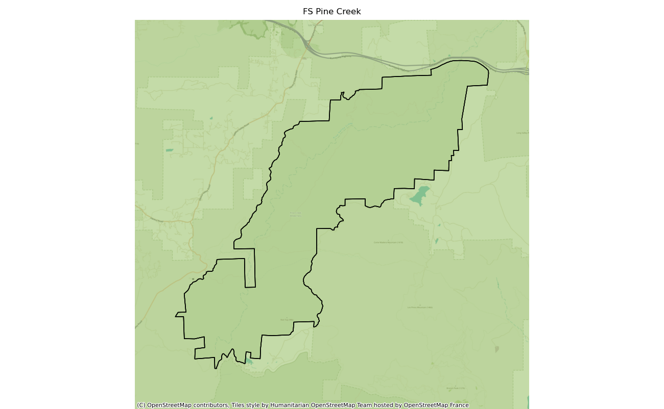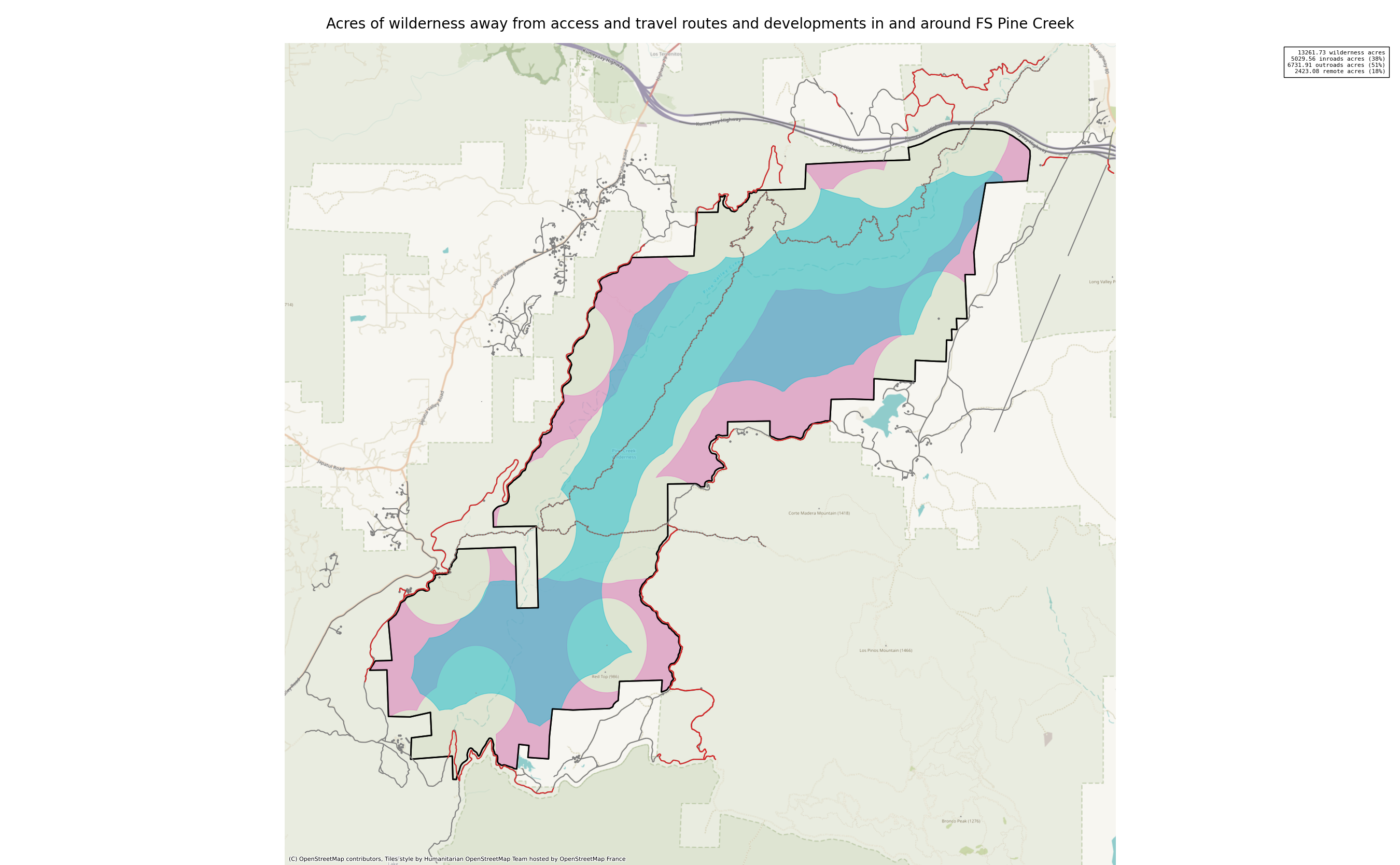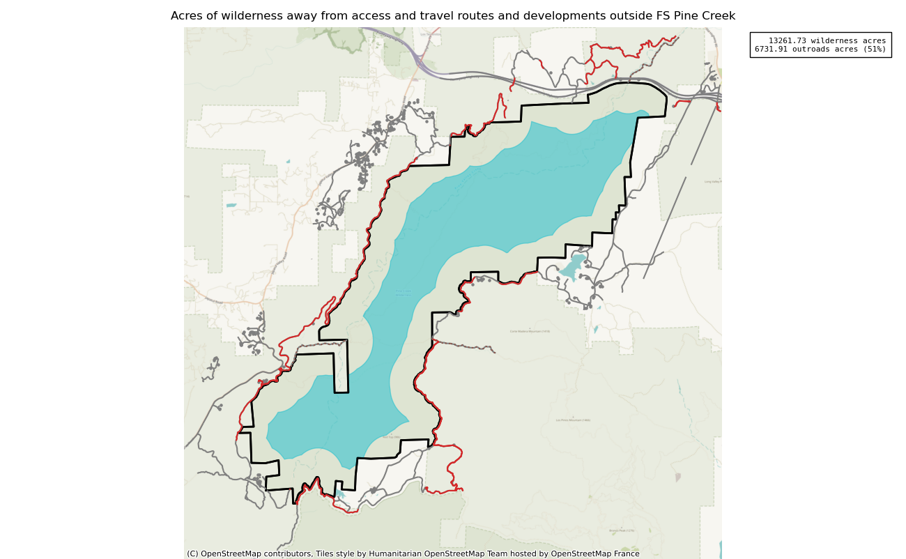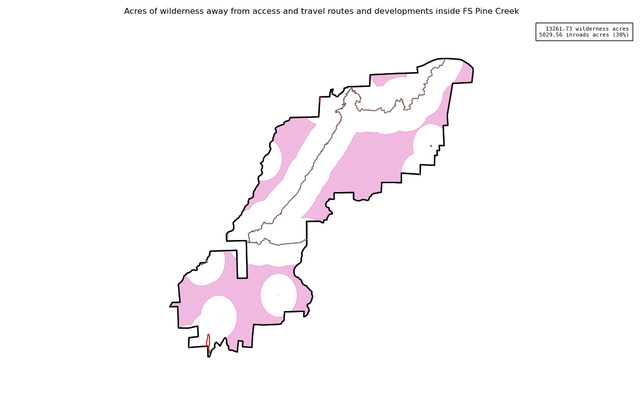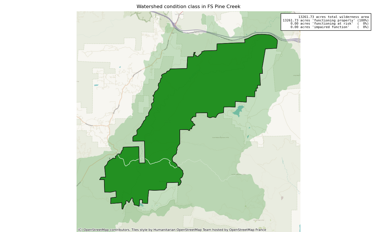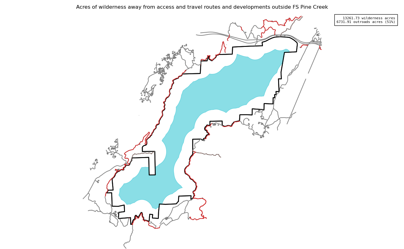 The 13262 acre Pine Creek was designated as a National Wilderness on or around 1984-01-01, and Wilderness Character Monitoring baseline work was done in 2025. The maps in this section are made with USFS data, with terrain maps from the internet.